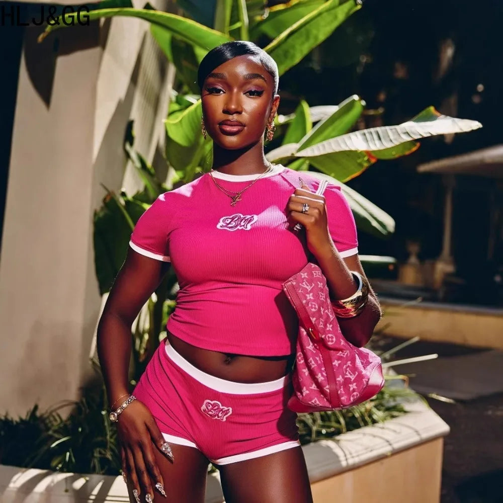 HLJ&GG Sexy Letter Printing Baddie 2 Piece Sets Outfits Spaghetti Strap Halter Backless Tank Crop Tops + Shorts Suits Streetwear