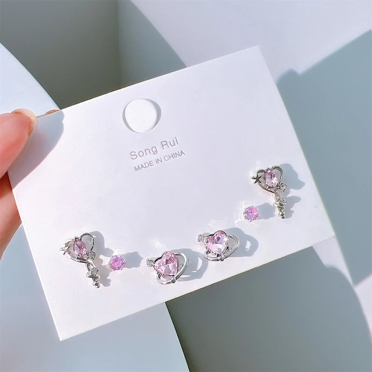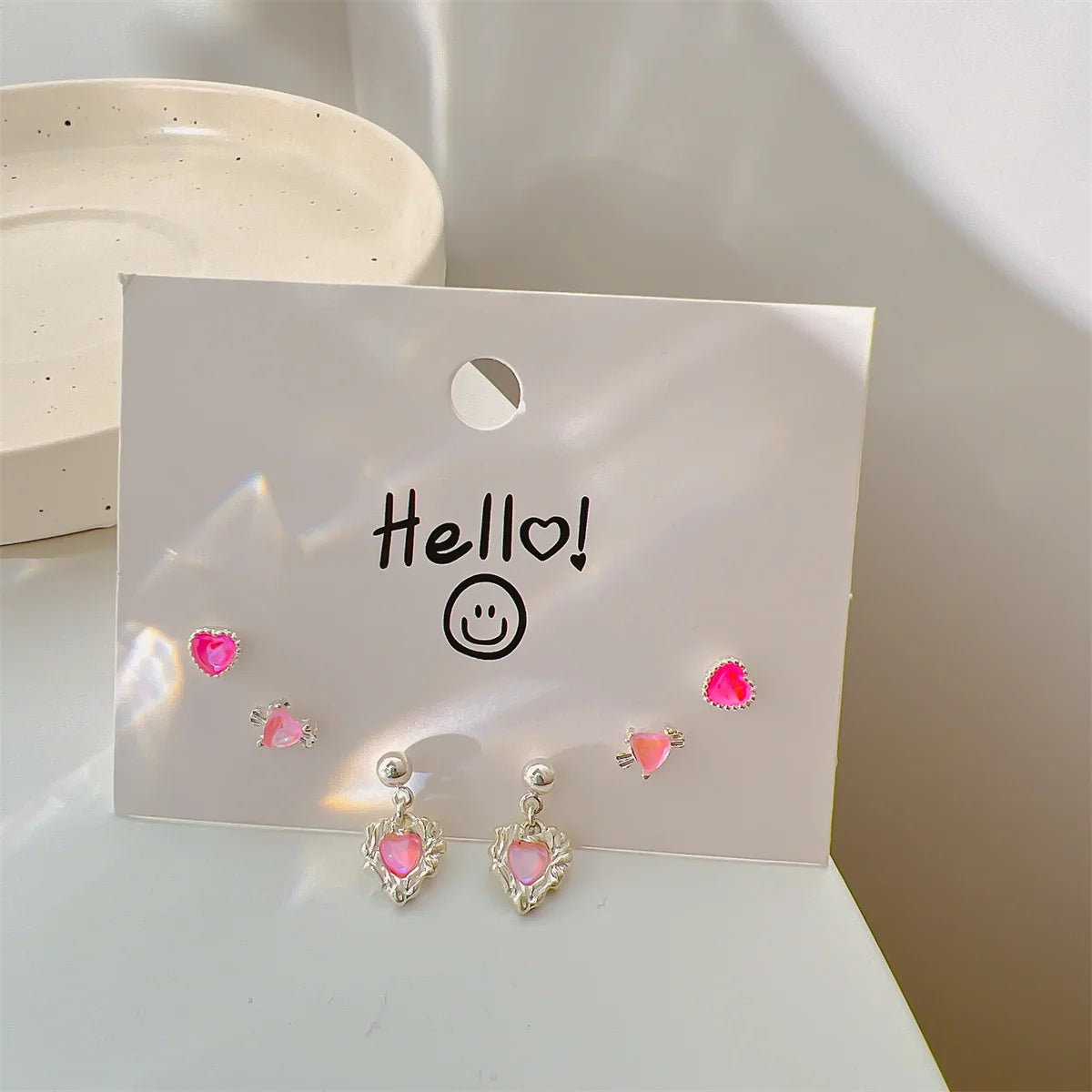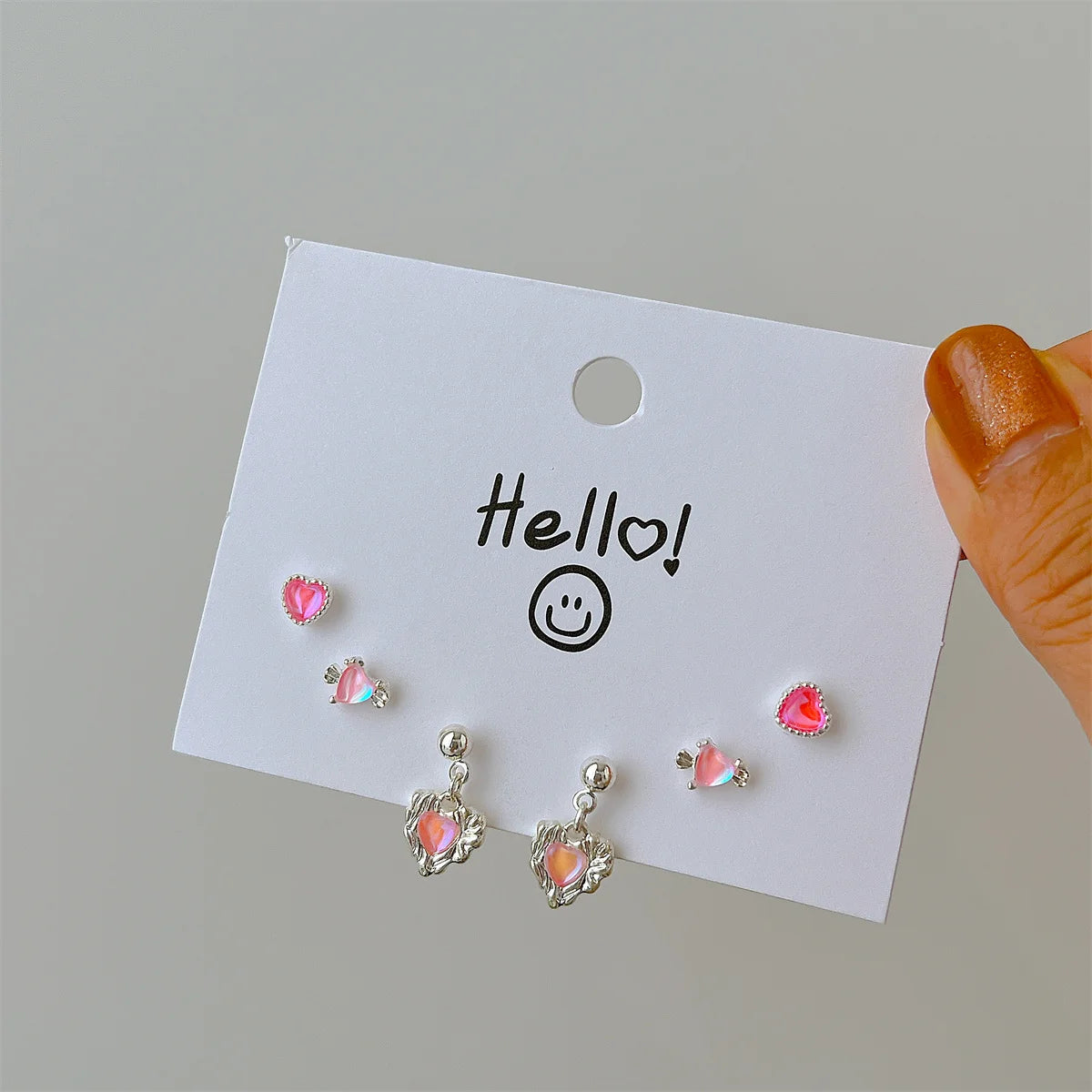 17KM INS Y2K Pink Heart Stud Earrings for Women Girls Korean Bow Dangle Earring Set Sweet Crystal Drop Earring Fashion Jewelry