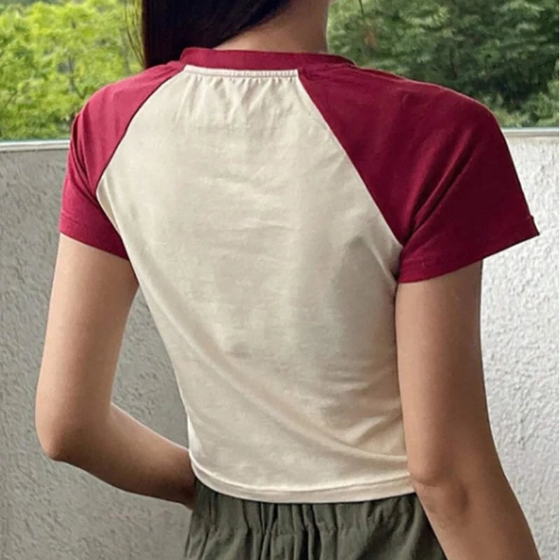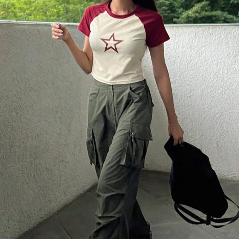 2000s Y2k Style Crop Tops Five pointed star print Harajuku Summer Short Sleeve Splicing T-Shirt Funny Kawaii Streetwear Cropped