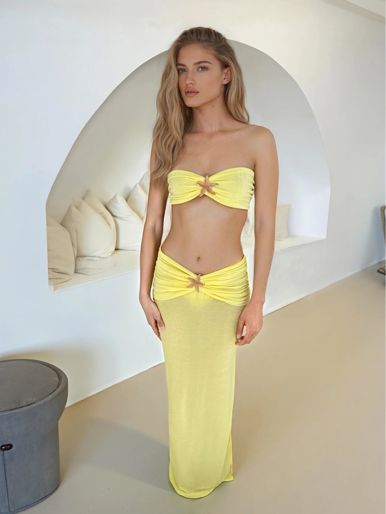 2025 Elegant Butter Yellow Bandeau 3 Piece Bikini Sets Women Sexy Swimsuit Halter with Skirt Beach Party Vacation Dress Outfis