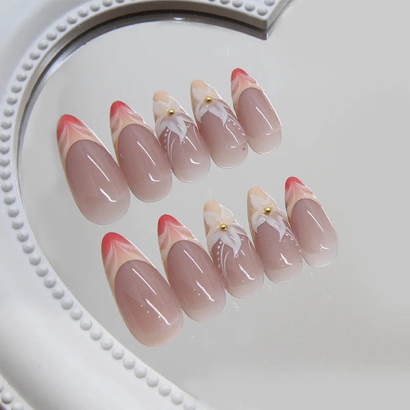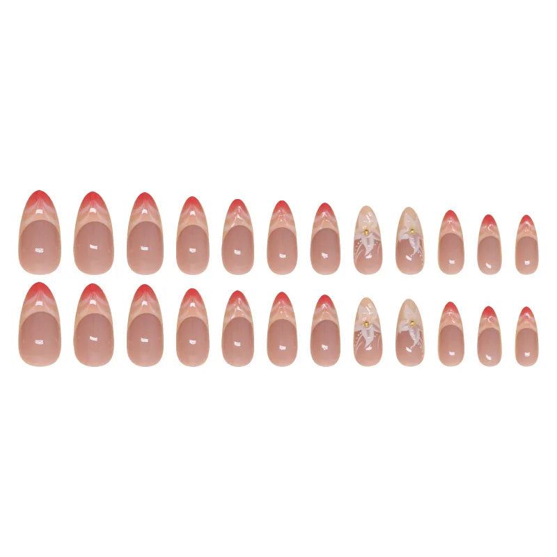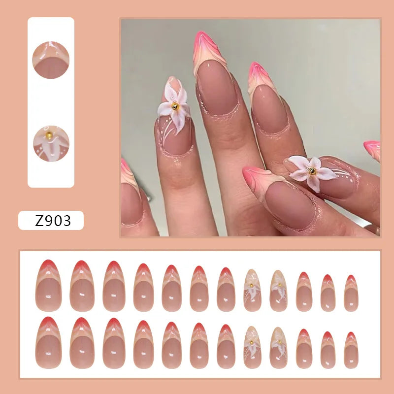 24pcs 3D Pink Flower Design Fake Nails Ins Gradient Pink Sweet False Nail Detachable French Almond Press on Nails for Women Girl