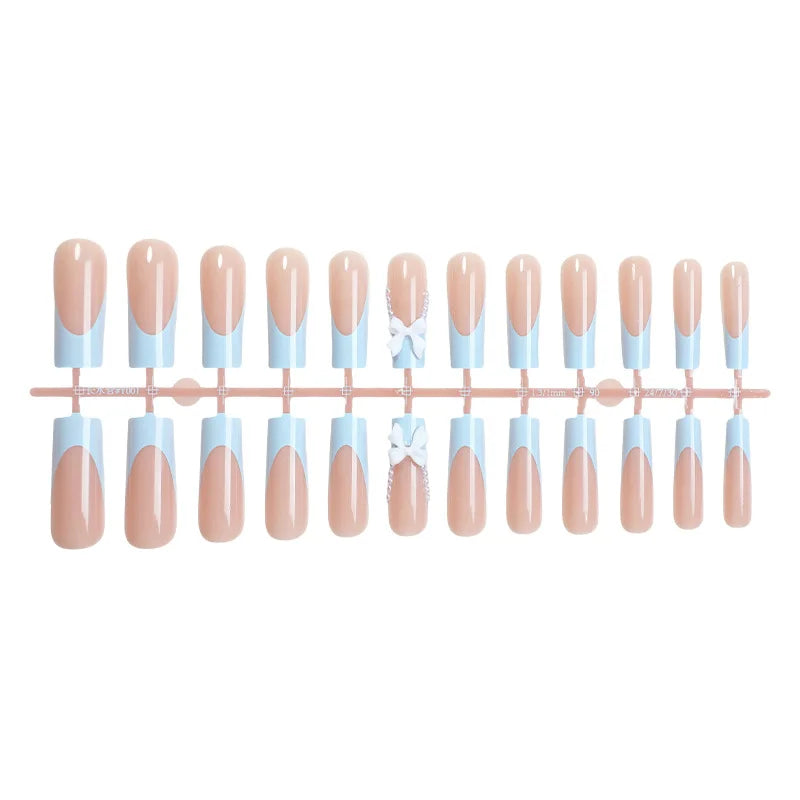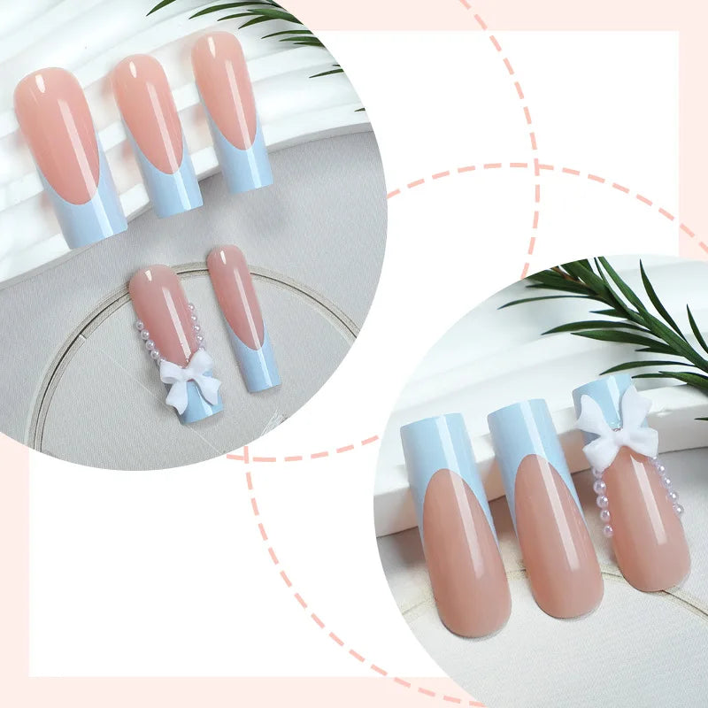 24pcs Blue French False Nails with White Bow Pearl Design Sweet Fake Nail Tips Wearable Detchable Long Ballet Press on Nails