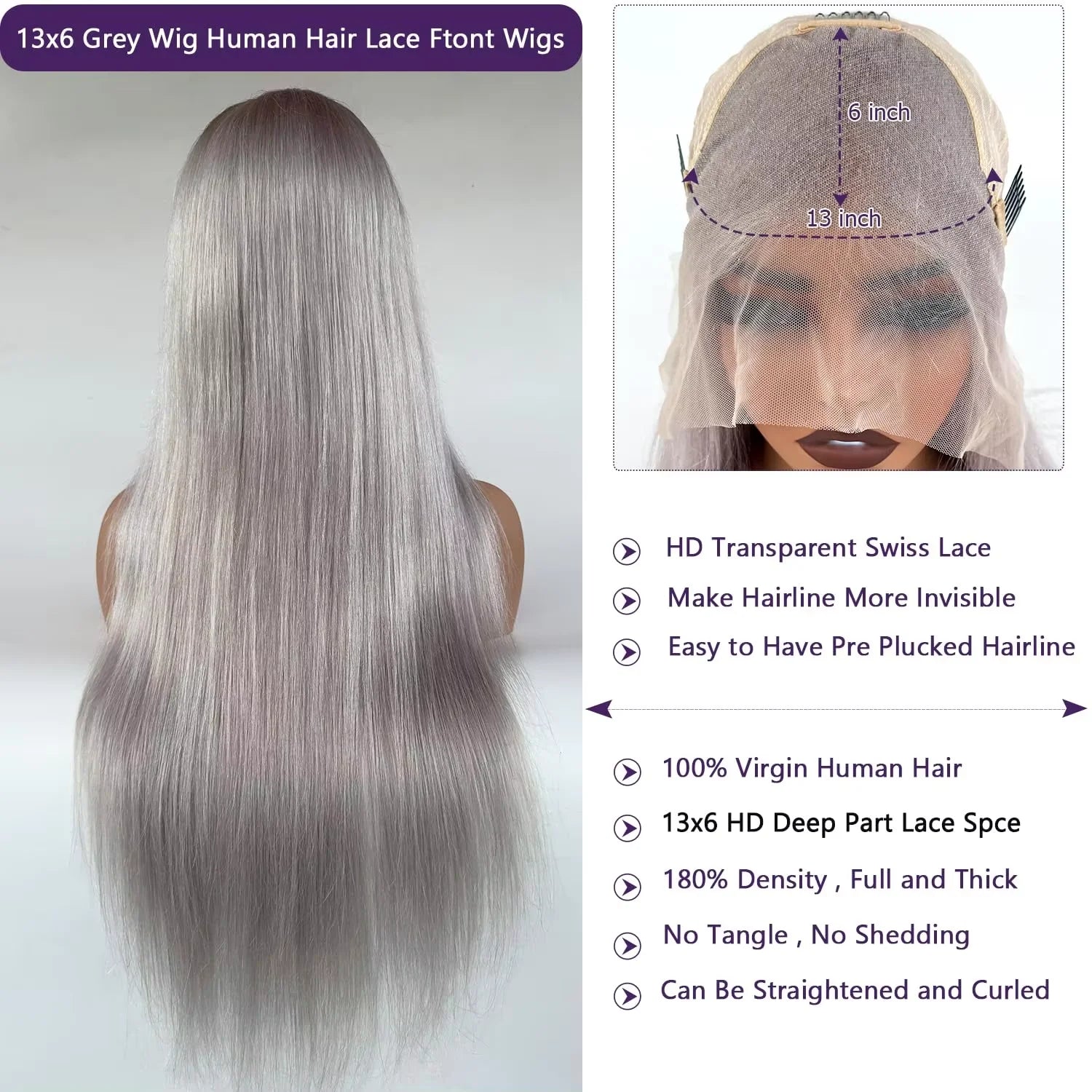 250% Grey Straight Lace Frontal Human Hair Wig 13x6 HD Transparent Lace Front Wigs Silver Gray Color Pre Plucked Human Hair Wig