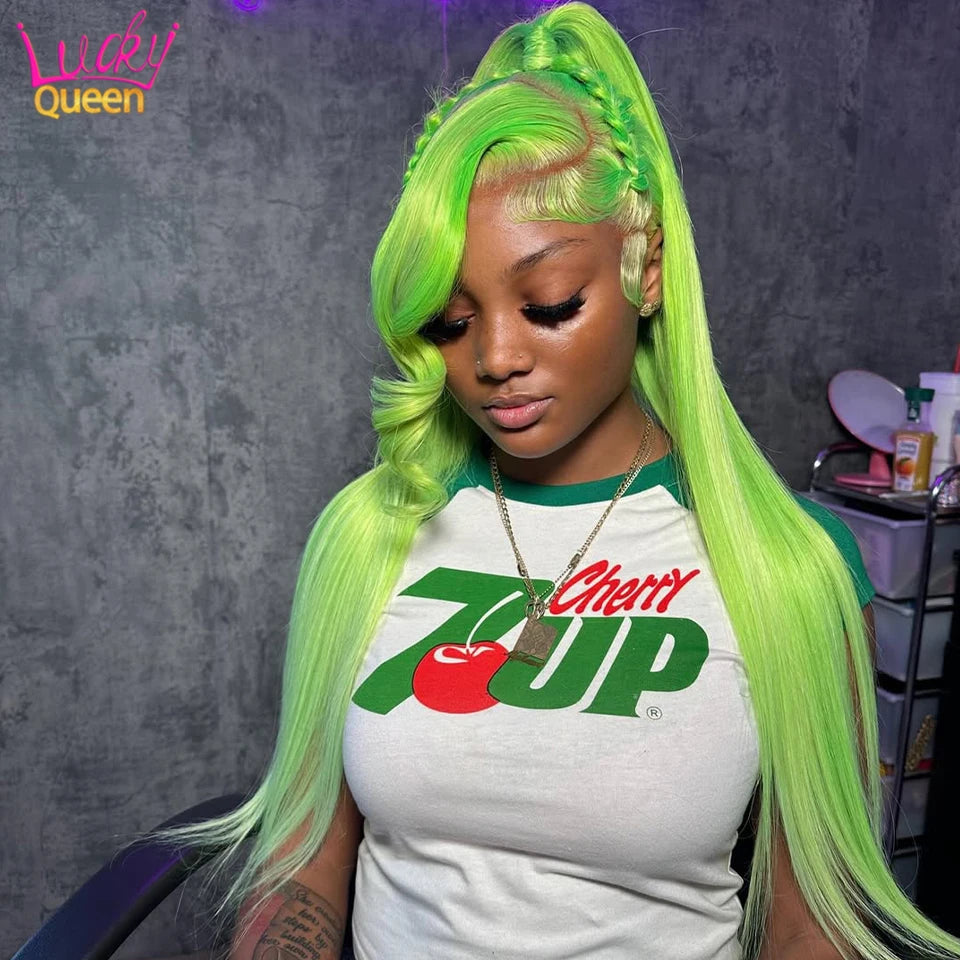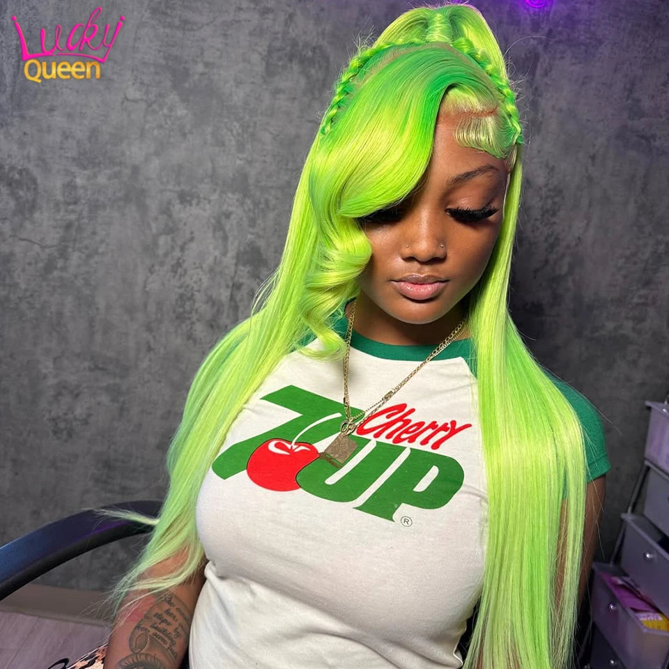613 Colorful Wigs Green Apple Color Human Hair Pre Plucked For Women Lace Front Transparent Lace 180 Density Straight Baby Hair
