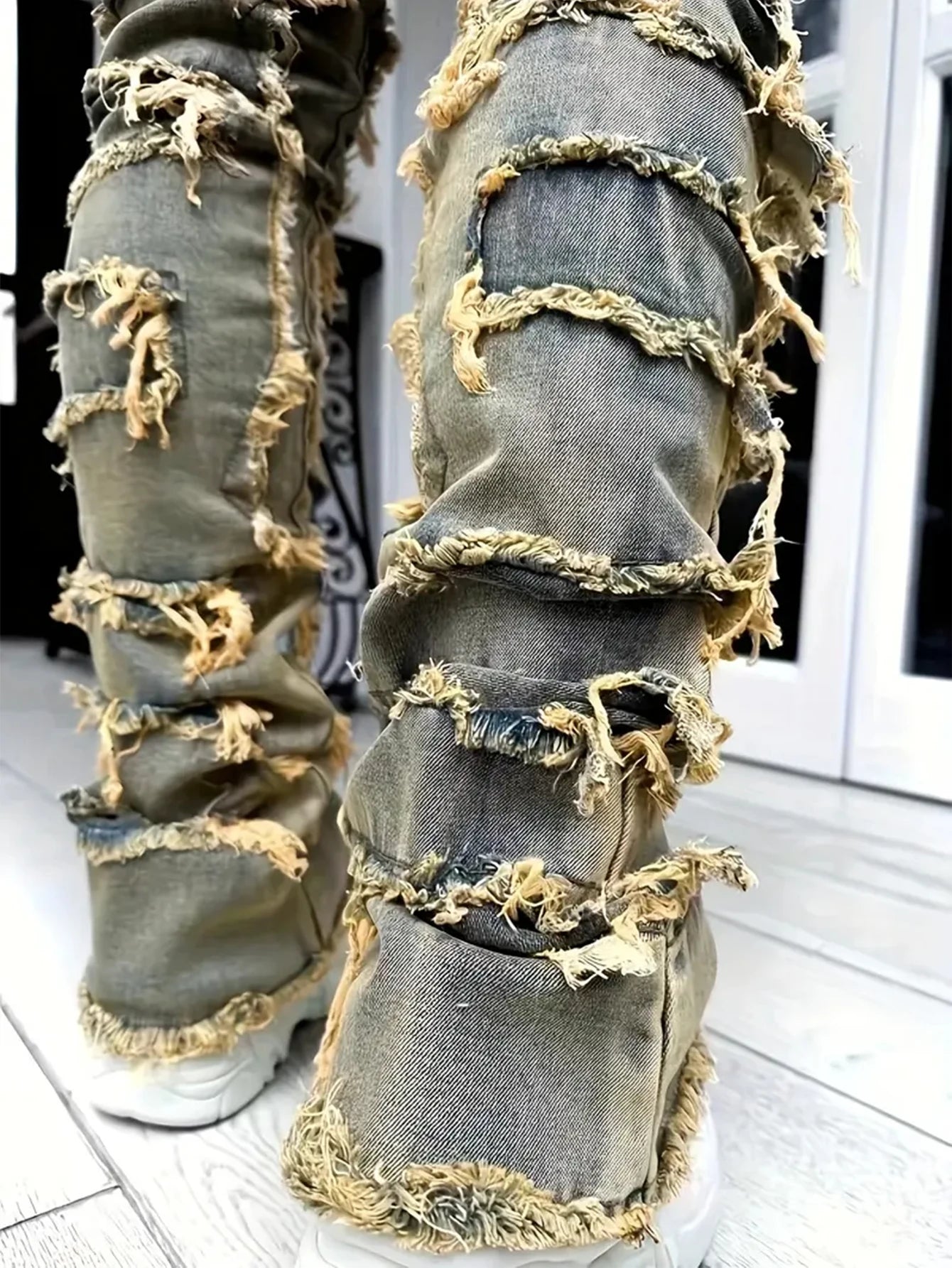 Casual Distressed Men's Jeans Tassels Patchwork Design Vintage Washed Stretch Denim Pants Straight Fashion Streetwear Trousers