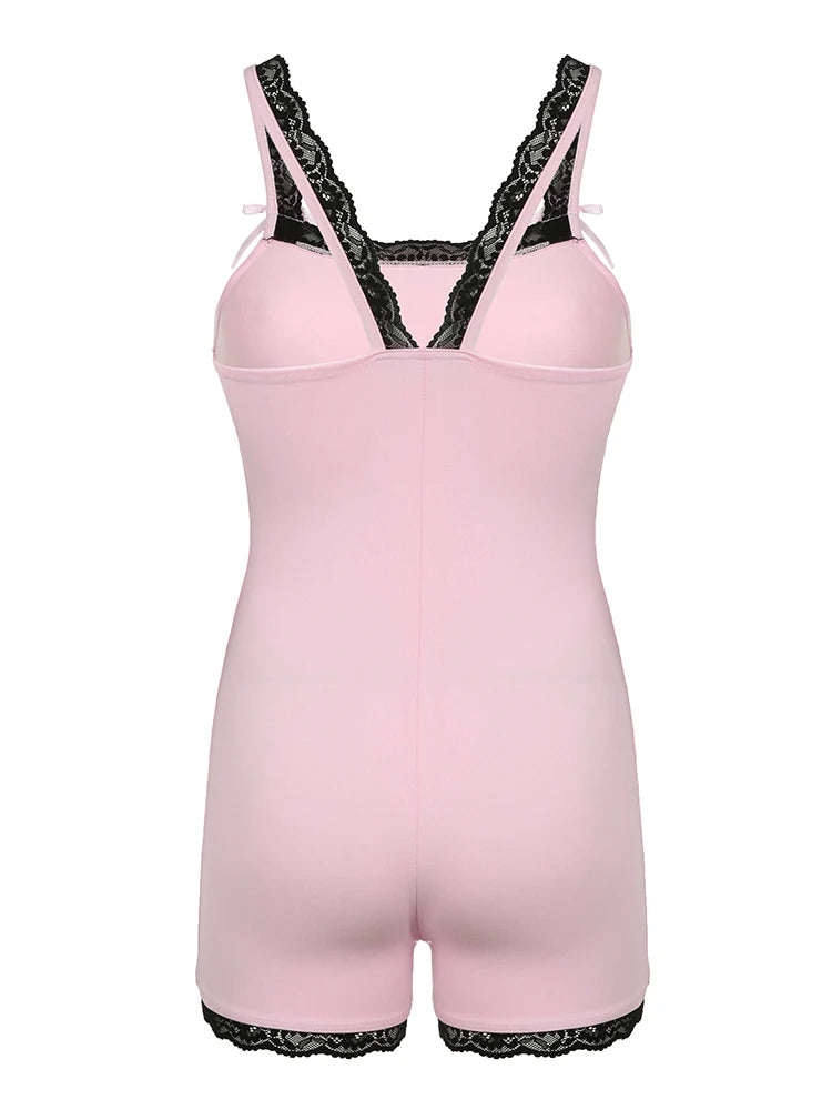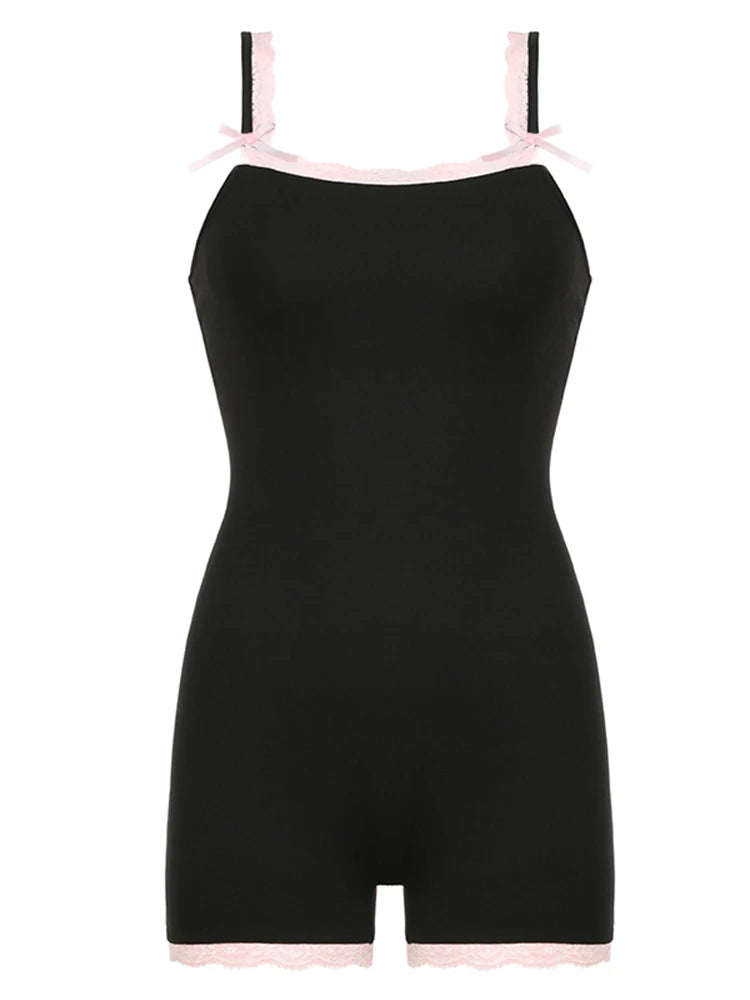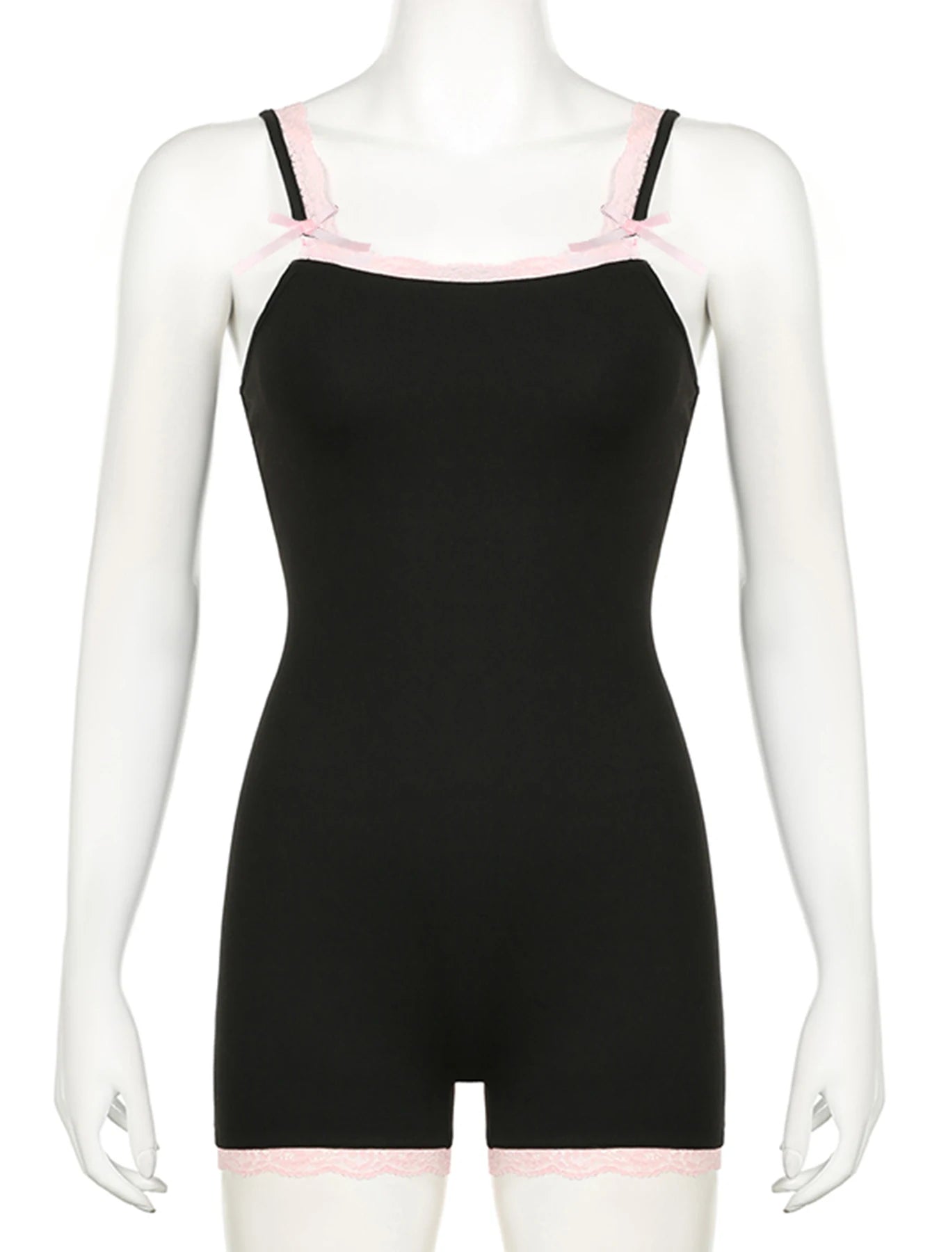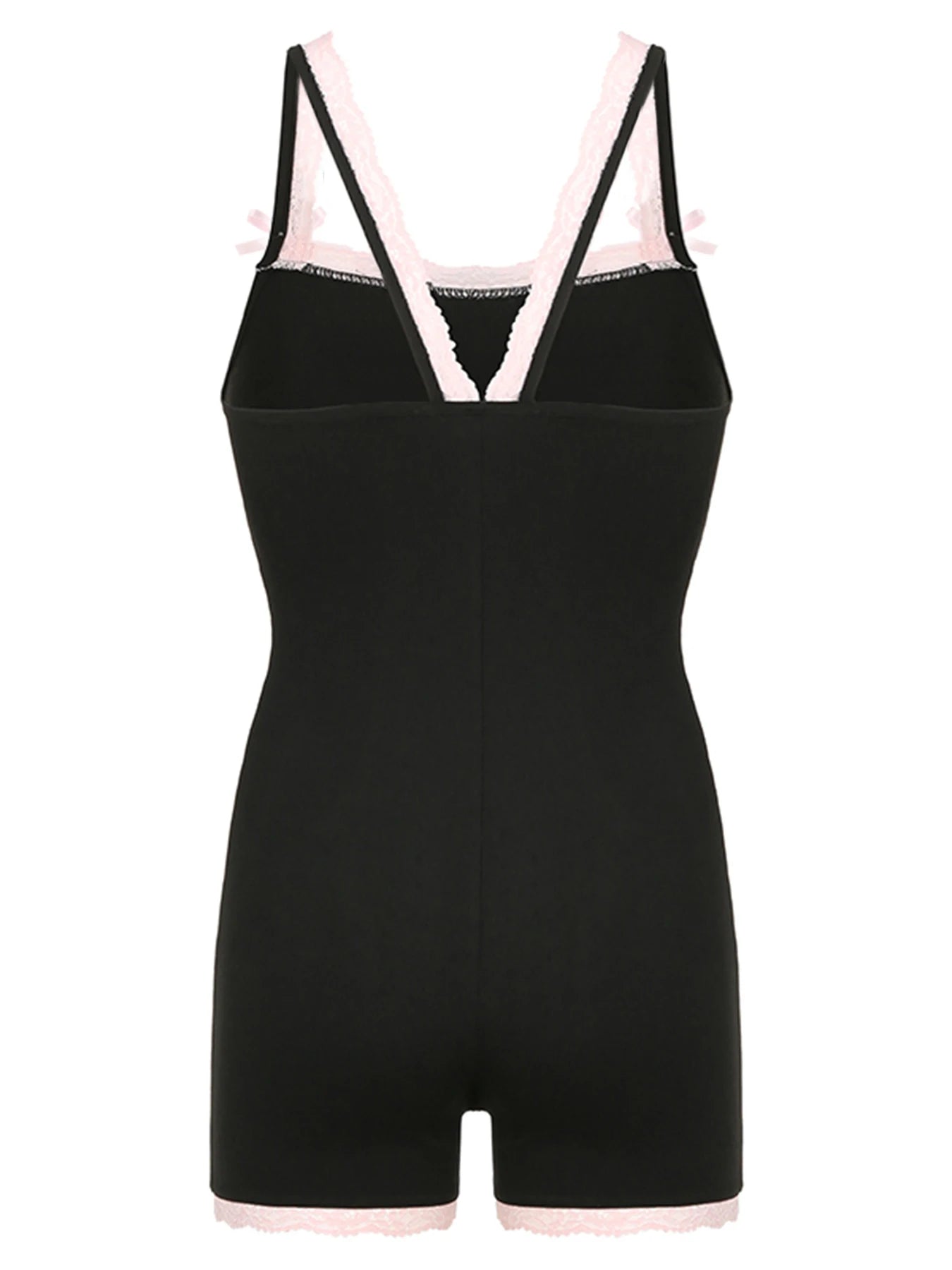 Contrast Lace Patchwork Square Collar Skinny Sexy Straps Rompers Playsuits Sweet Cute Y2K Clothing