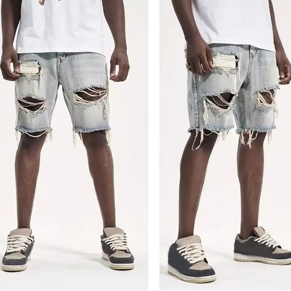 Deformed-resistant Denim Shorts Men's Summer Distressed Denim Shorts Straight Fit Ripped Holes Knee Length Jeans with Multi