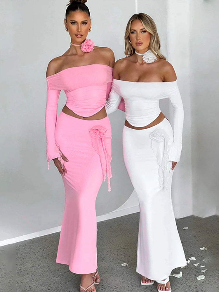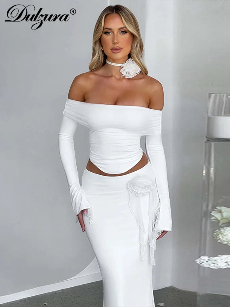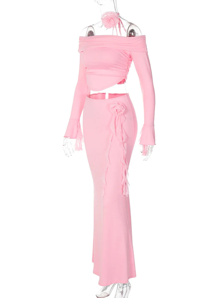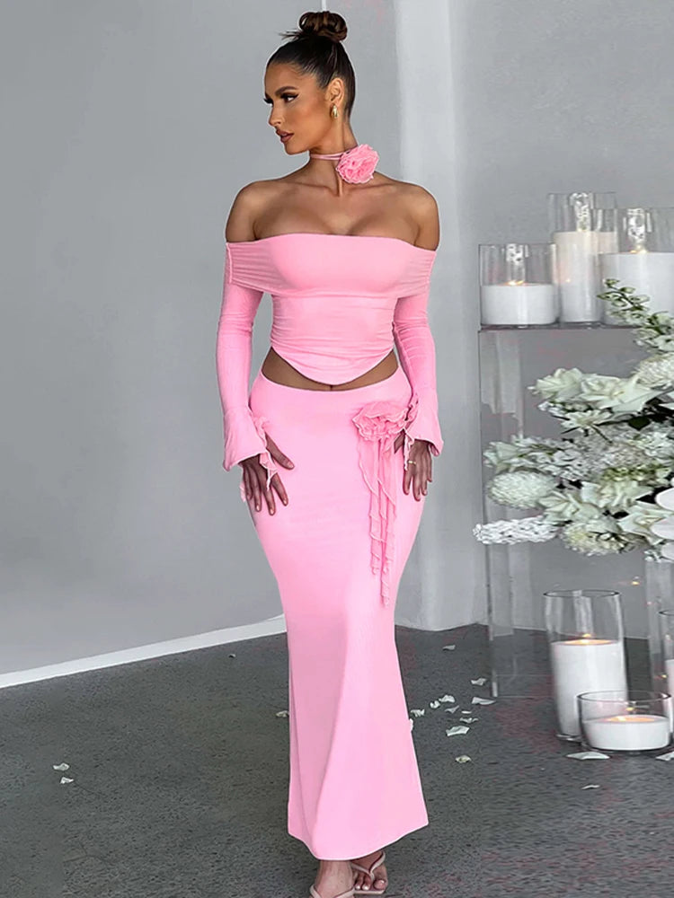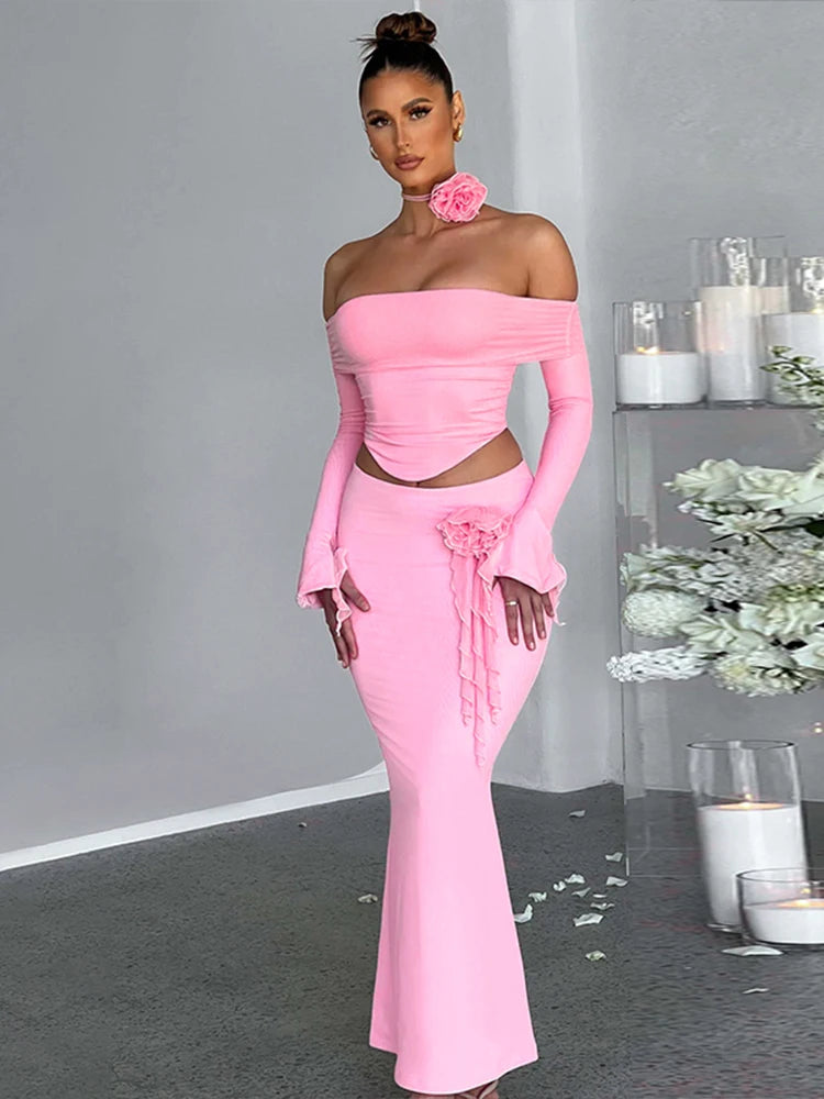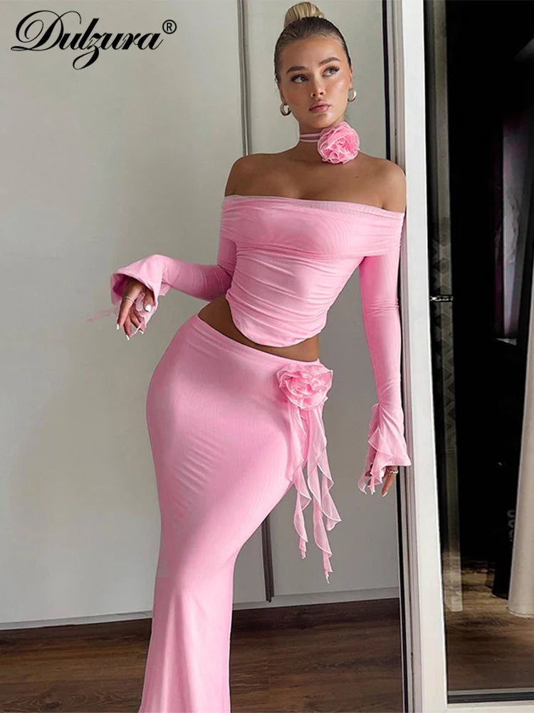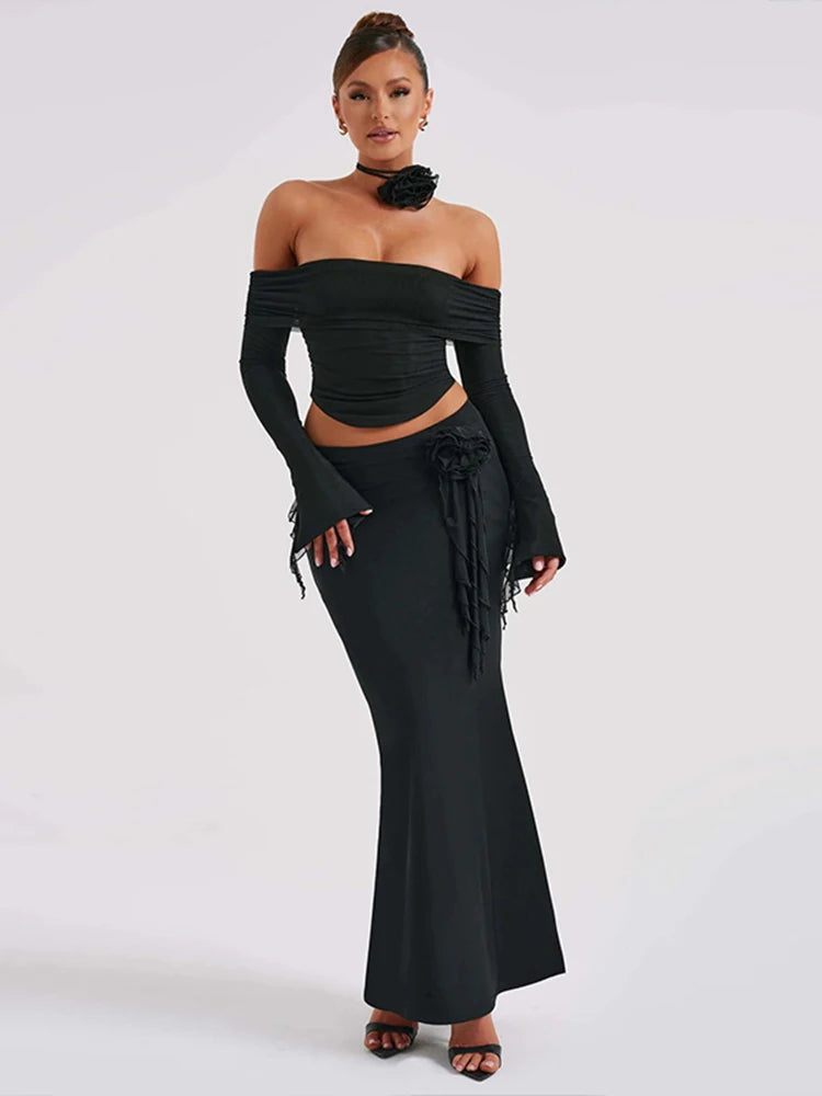 Dulzura Matching Suit Neck Accessories 3D Flower Off Shoulder Long Trumpet Sleeves Crop Top Tassel Maxi Skirt 2024 Autumn Women