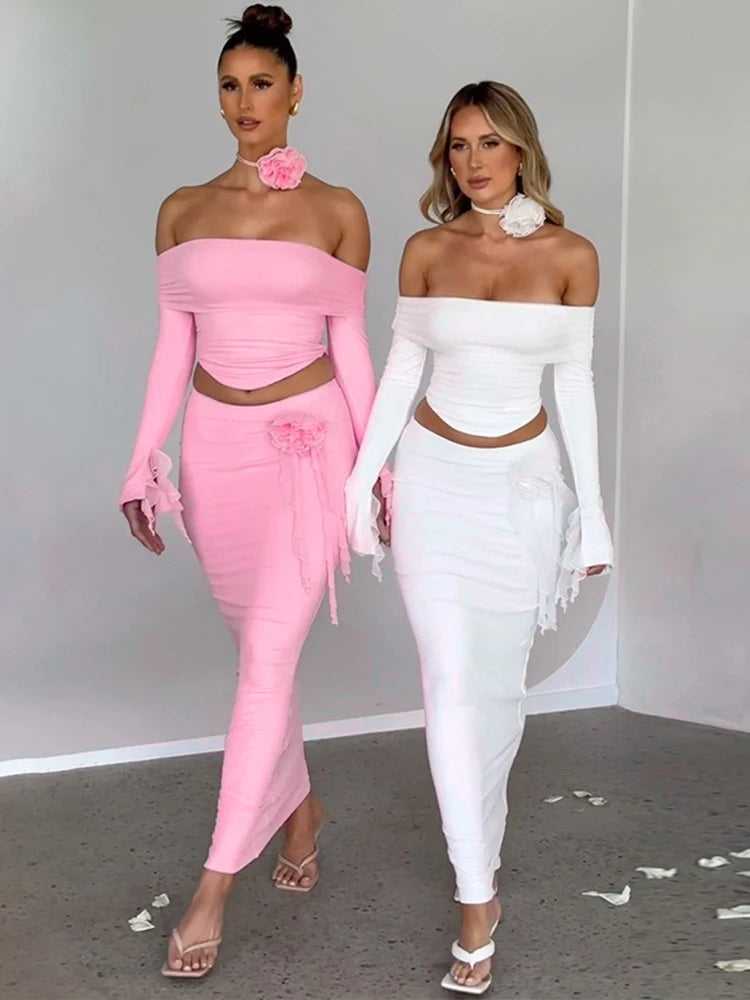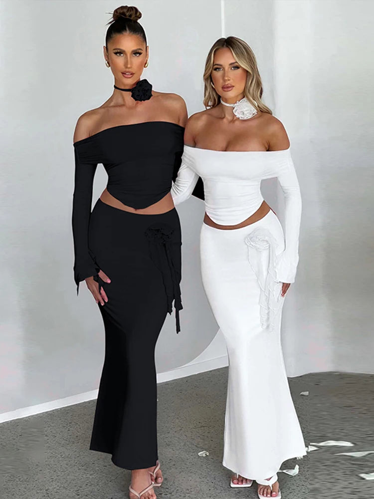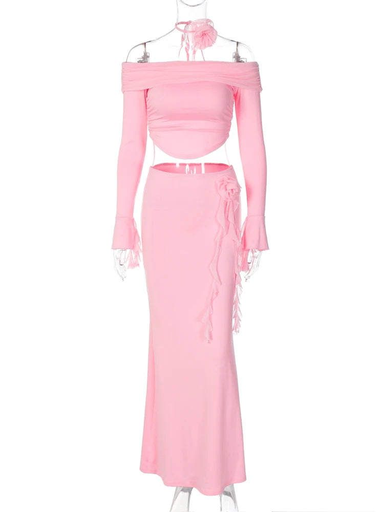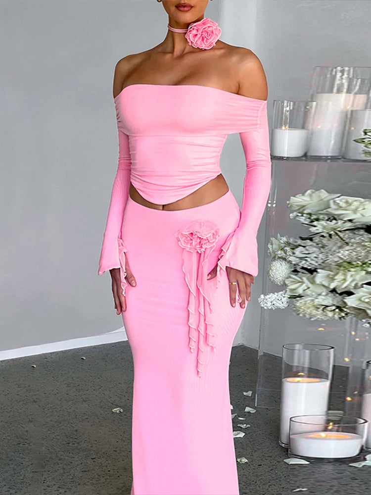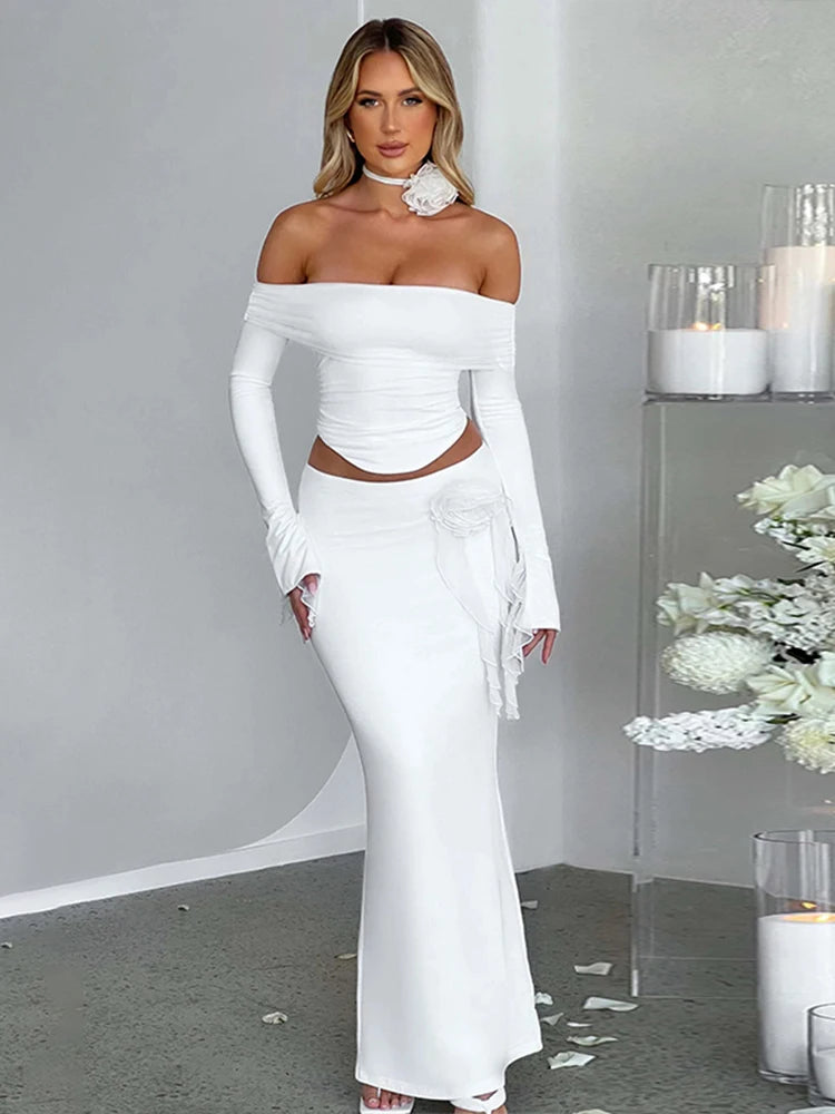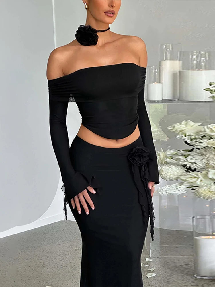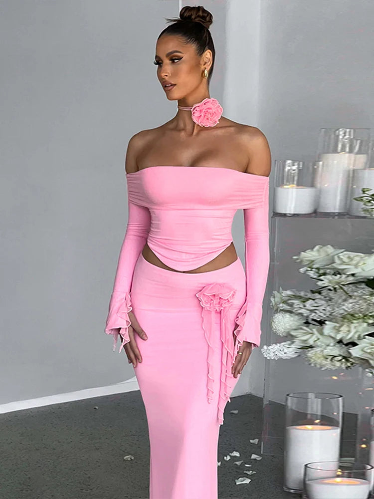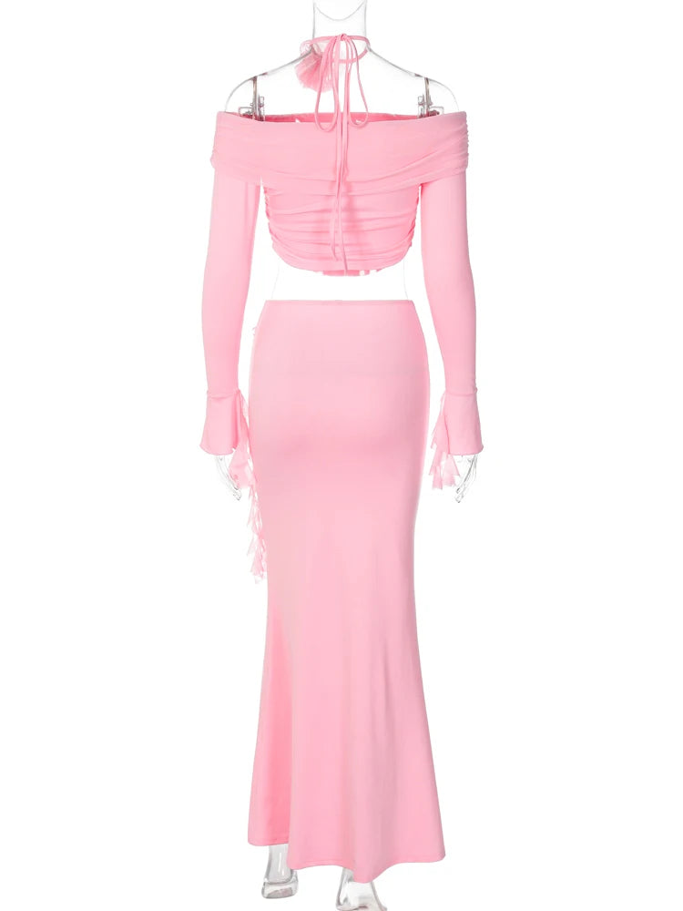 Dulzura Matching Suit Neck Accessories 3D Flower Off Shoulder Long Trumpet Sleeves Crop Top Tassel Maxi Skirt 2024 Autumn Women
