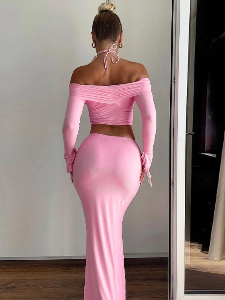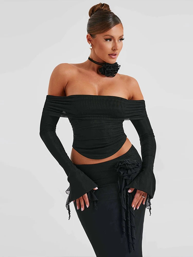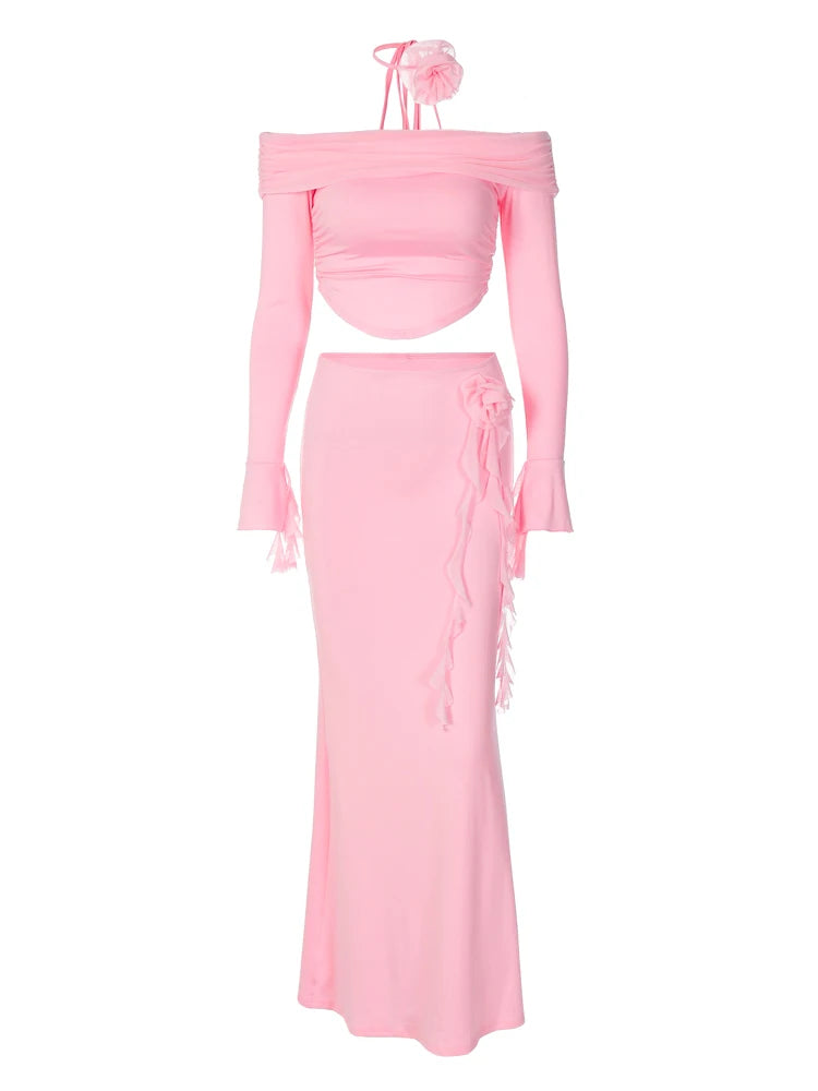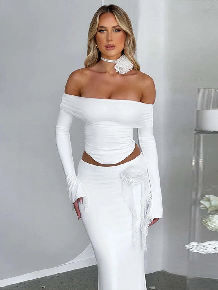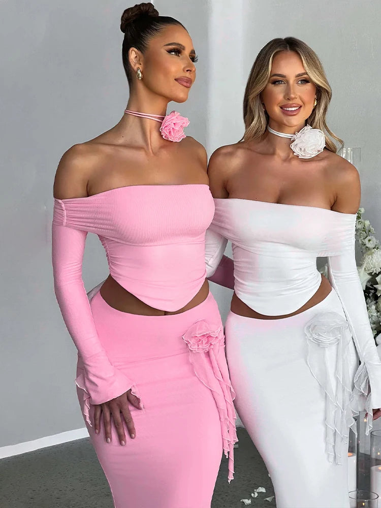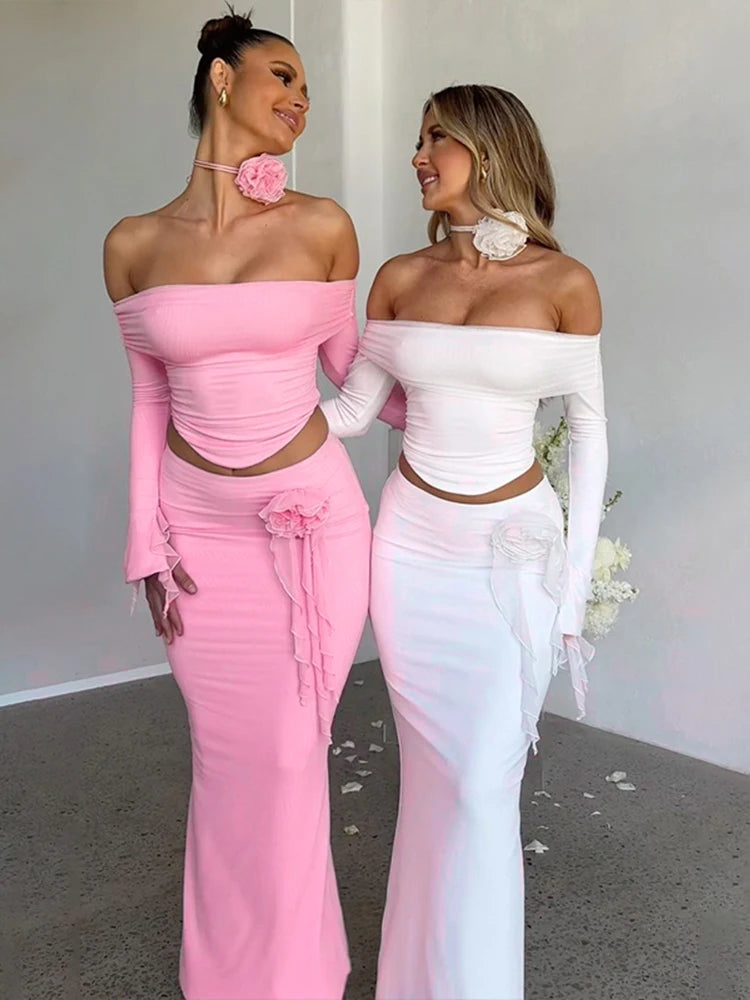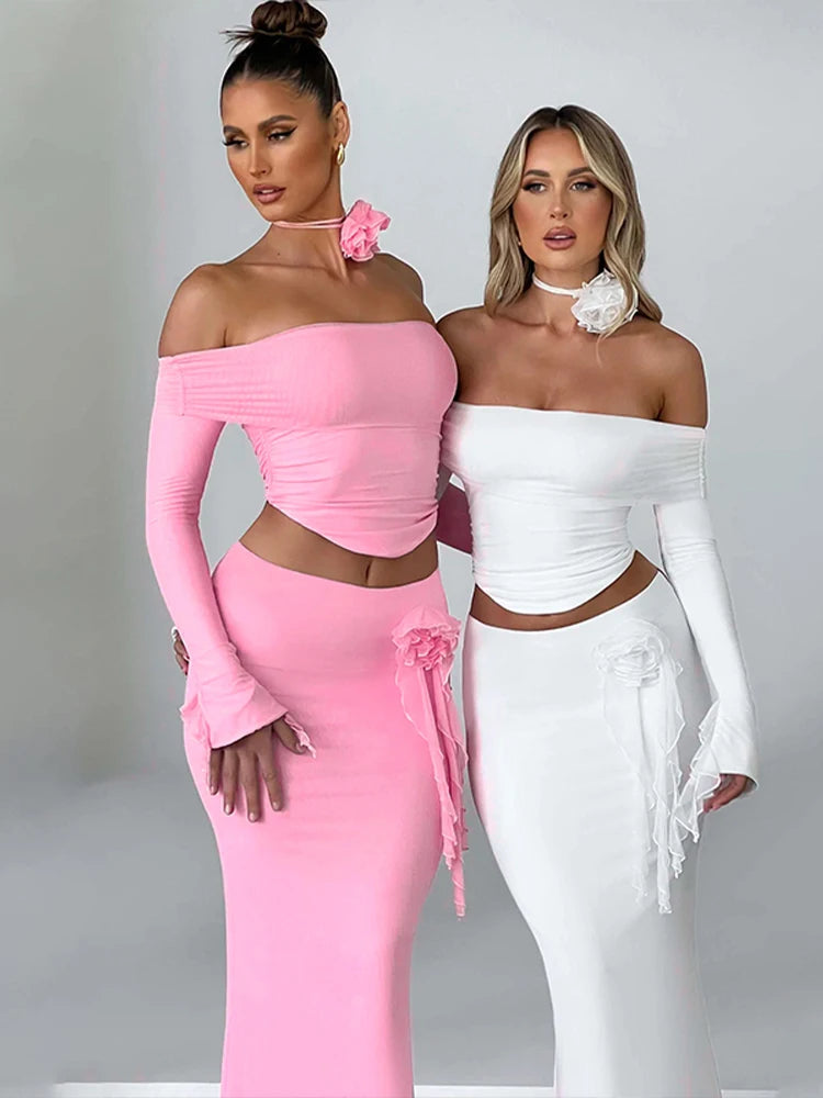 Dulzura Matching Suit Neck Accessories 3D Flower Off Shoulder Long Trumpet Sleeves Crop Top Tassel Maxi Skirt 2024 Autumn Women