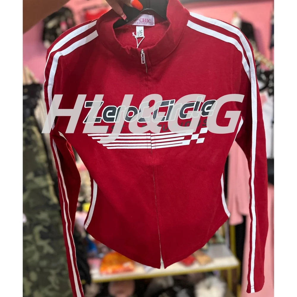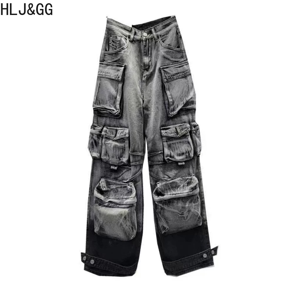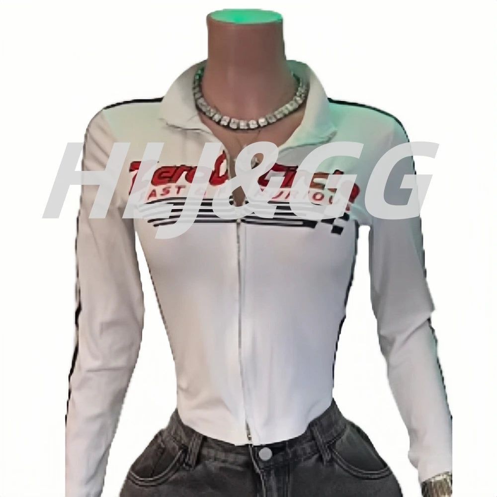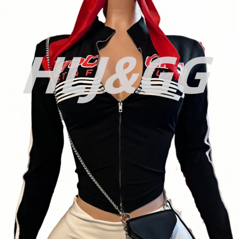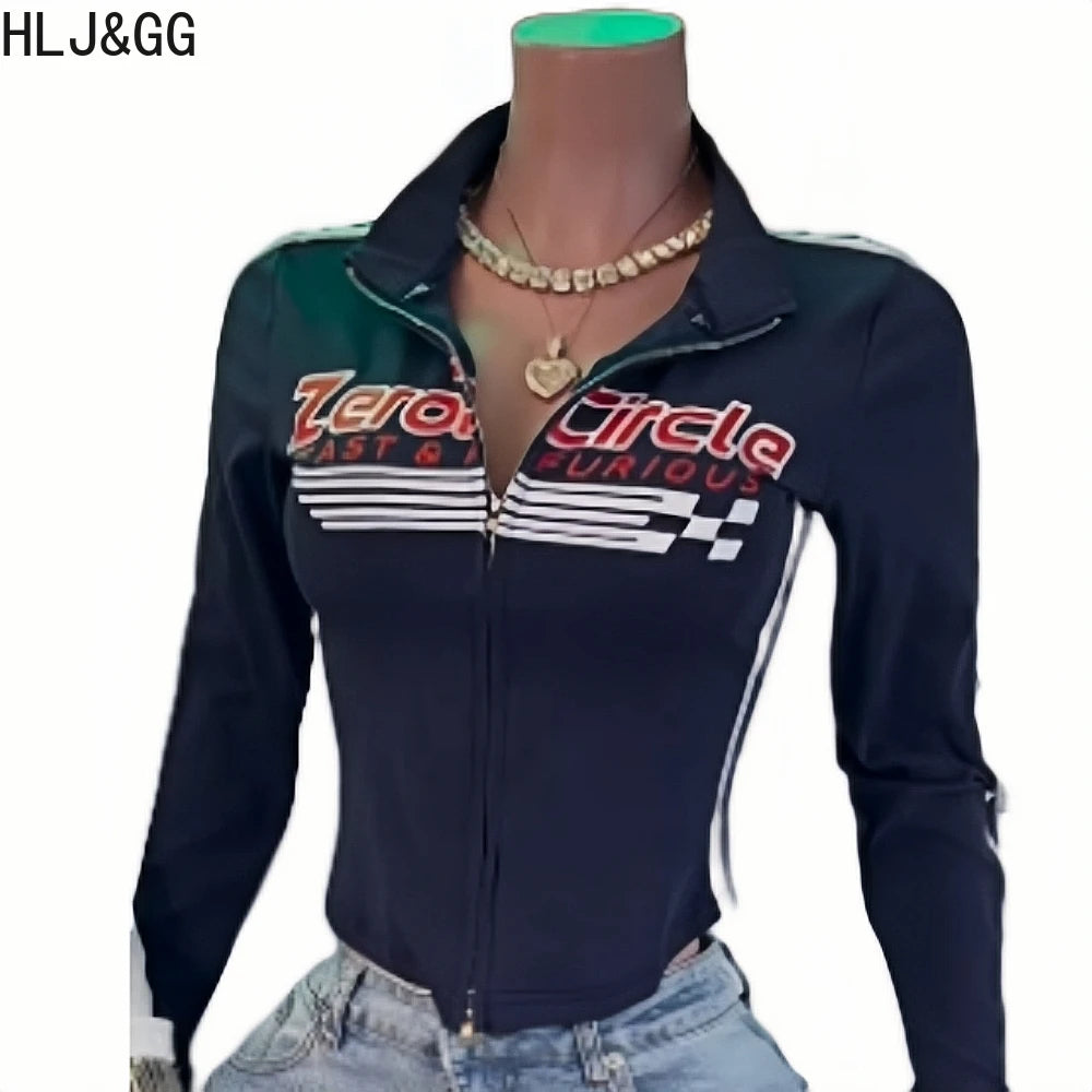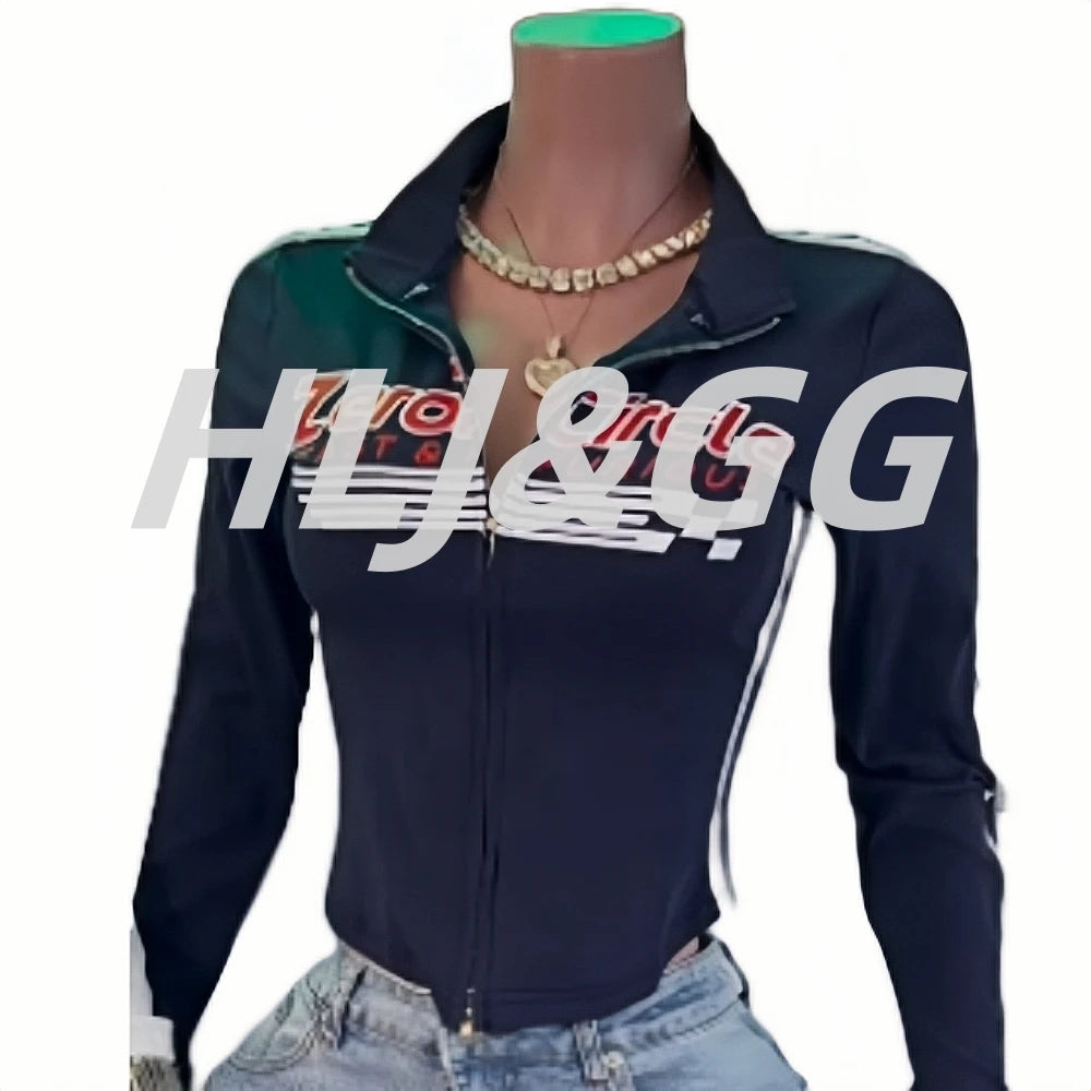 HLJ&GG American Vintage Letter Print Two Piece Sets Women Zip Long Sleeve Slim Top+jeans Pocket Pants Outfits Fashion Streetwear