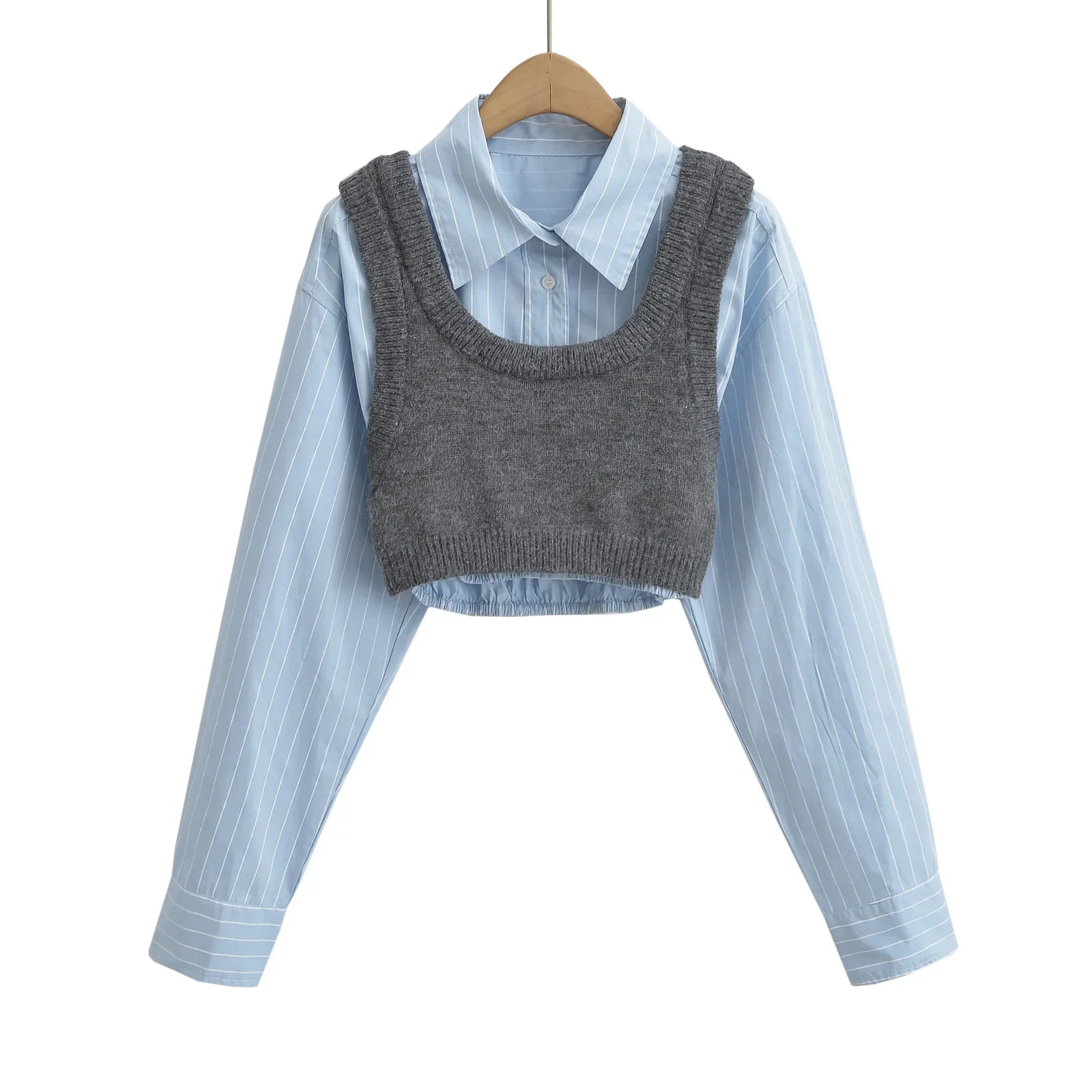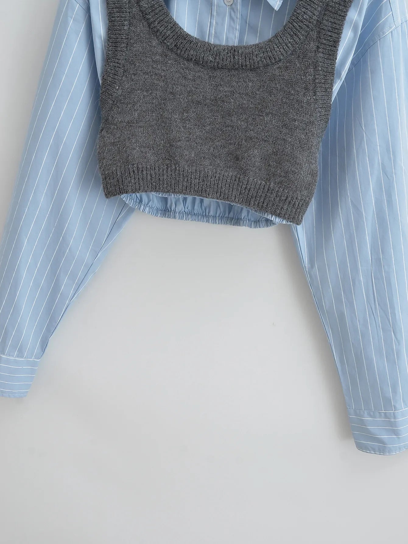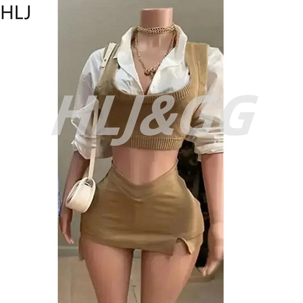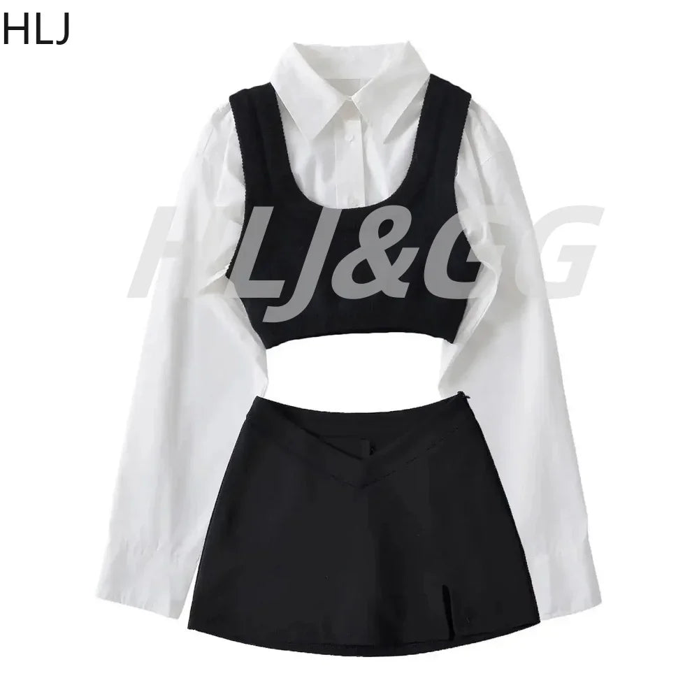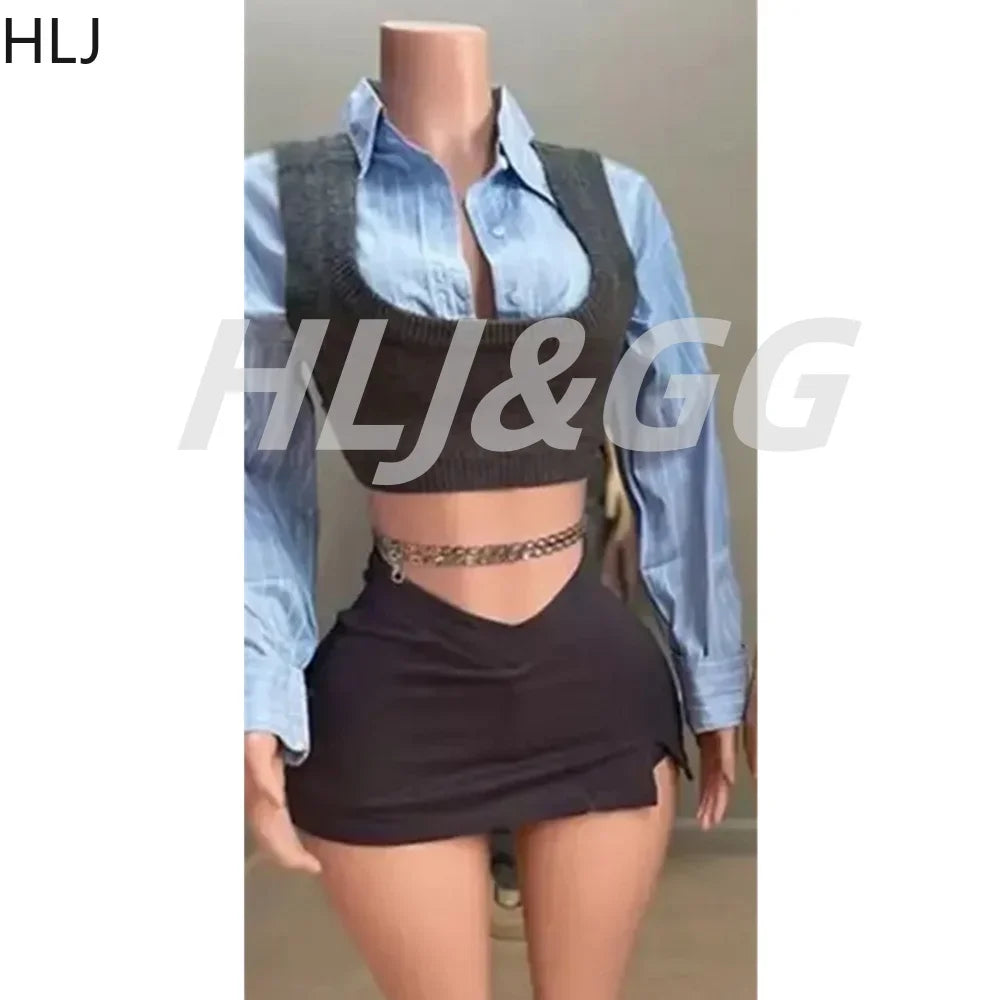 HLJ&GG Autumn Knit Vest Shirts Two Piece Sets Women Lapel Button Long Sleeve Top And Mini Skirts Outfits Fashion Retro 2pcs Suit