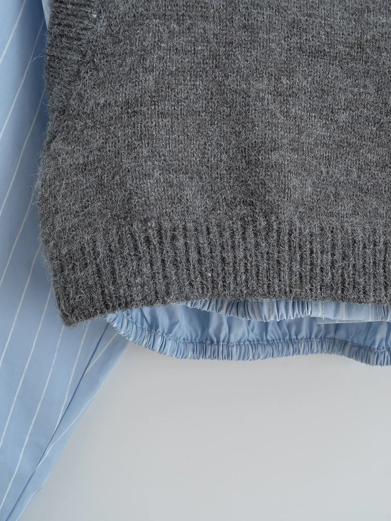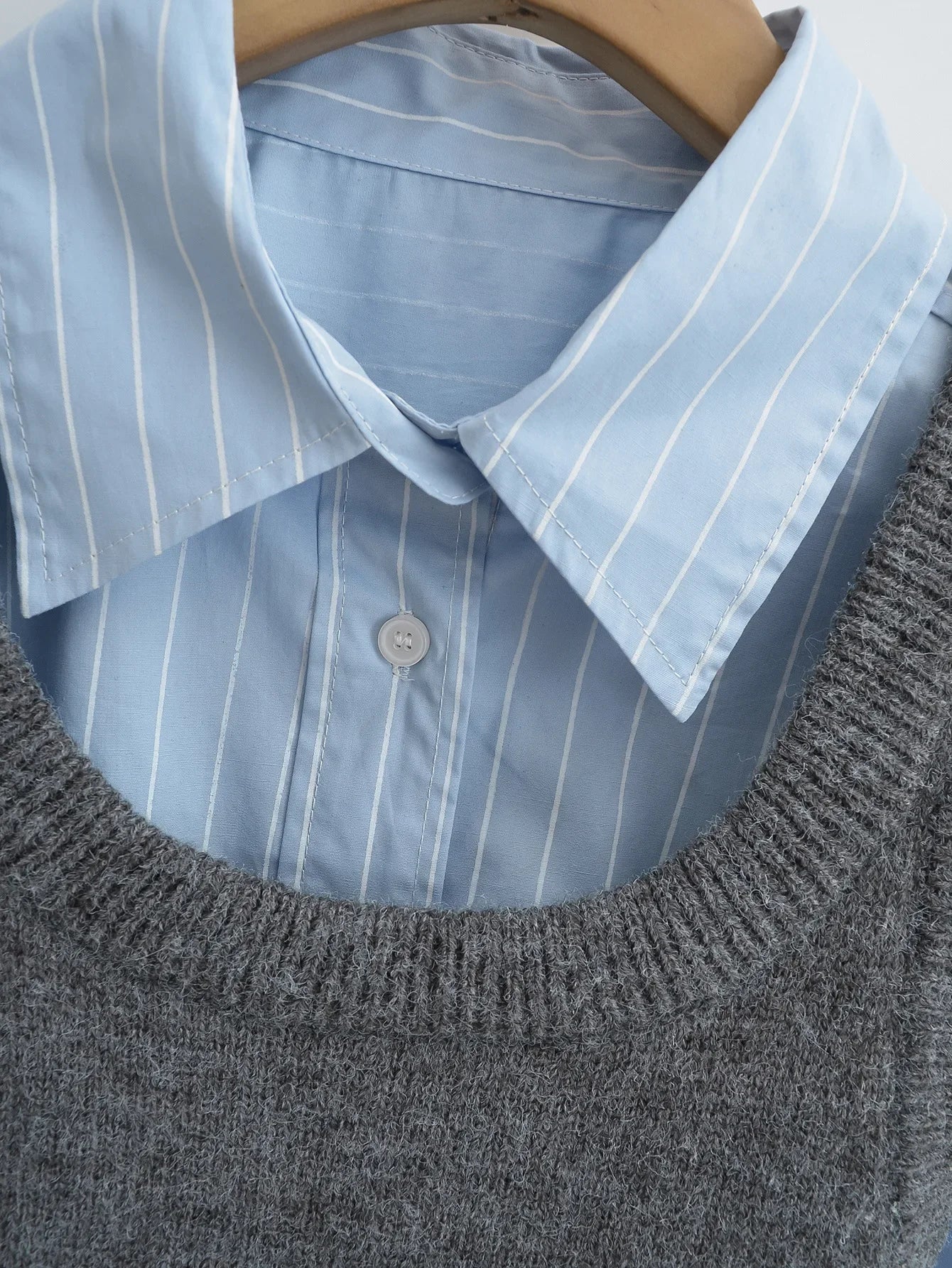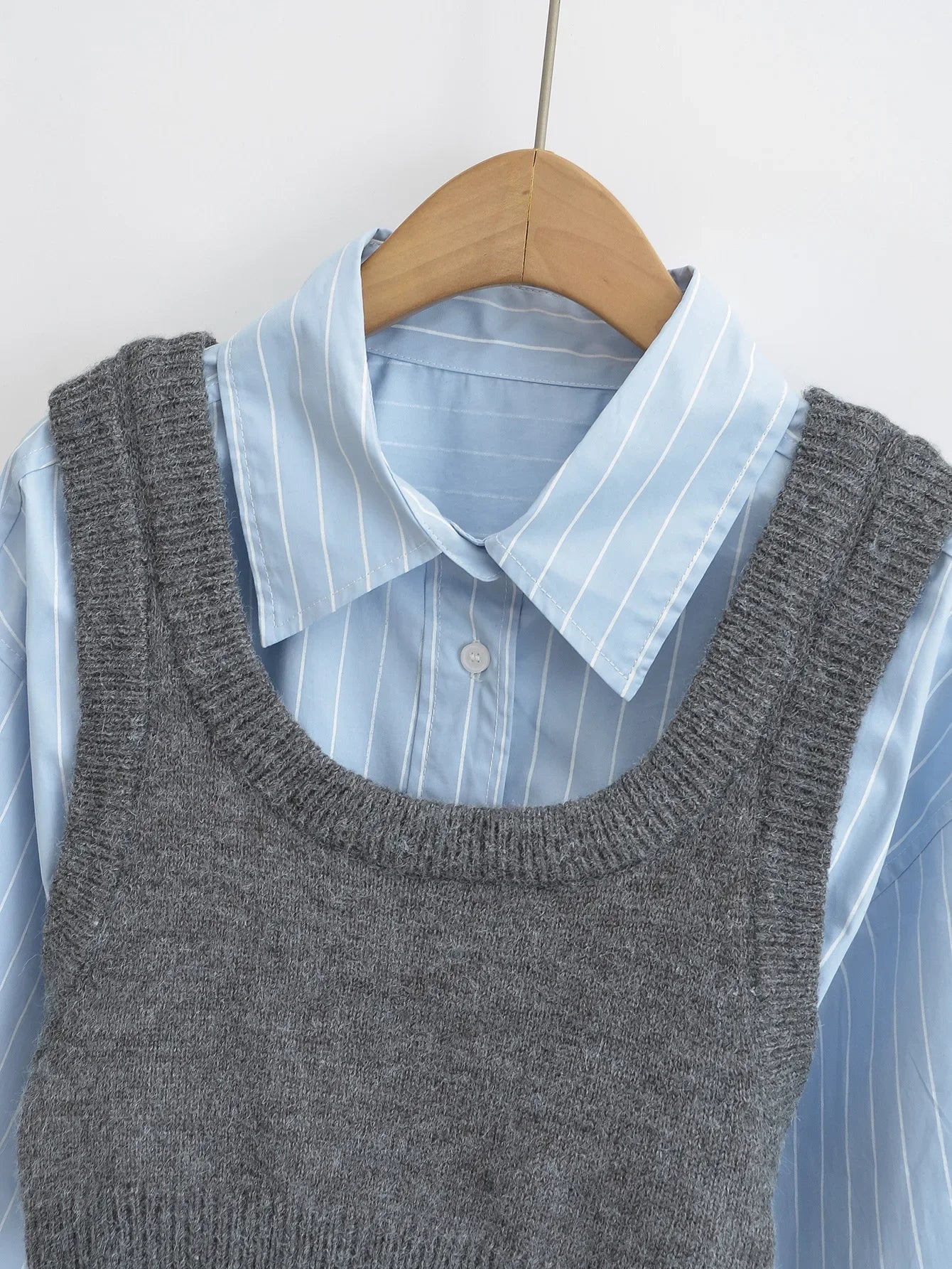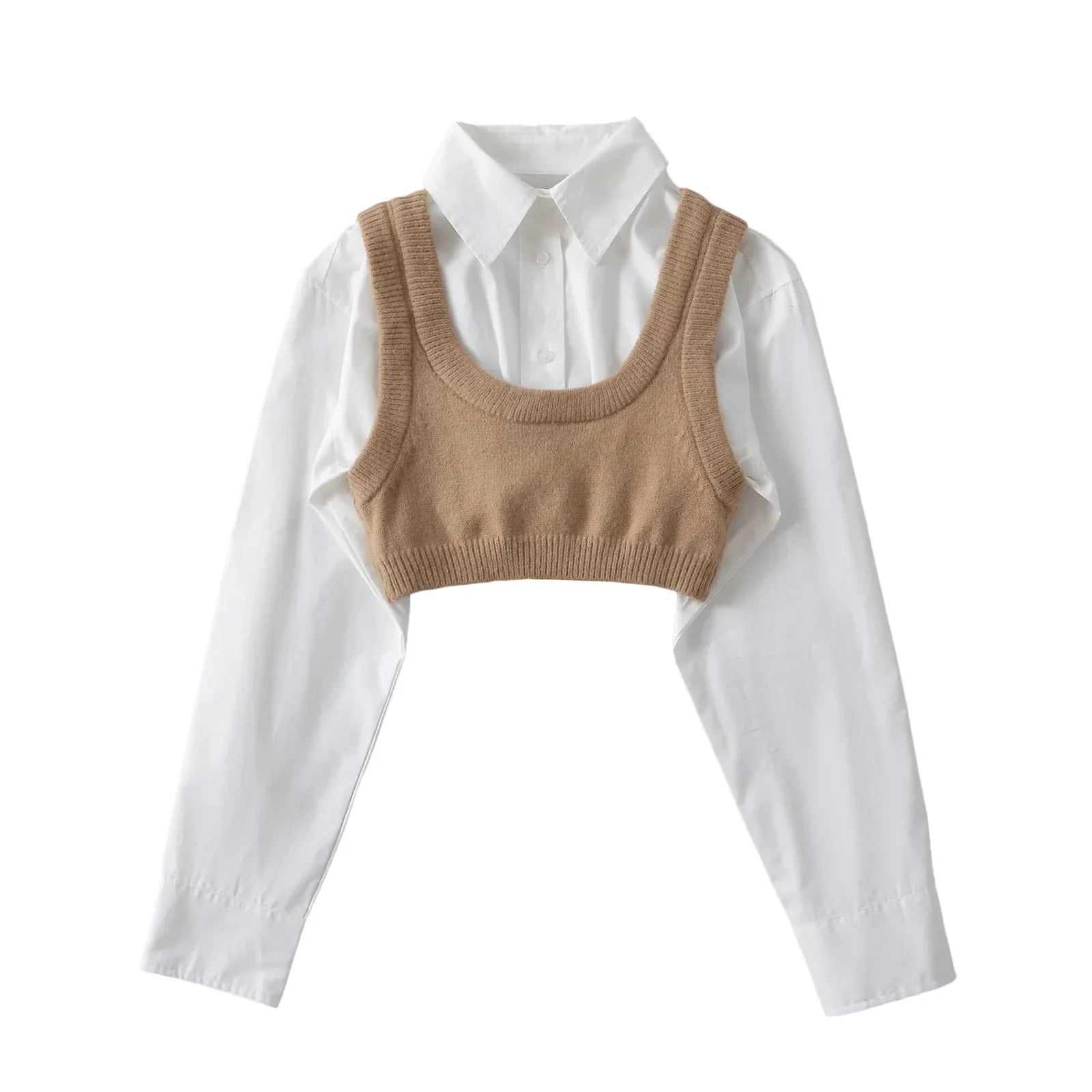 HLJ&GG Autumn Knit Vest Shirts Two Piece Sets Women Lapel Button Long Sleeve Top And Mini Skirts Outfits Fashion Retro 2pcs Suit