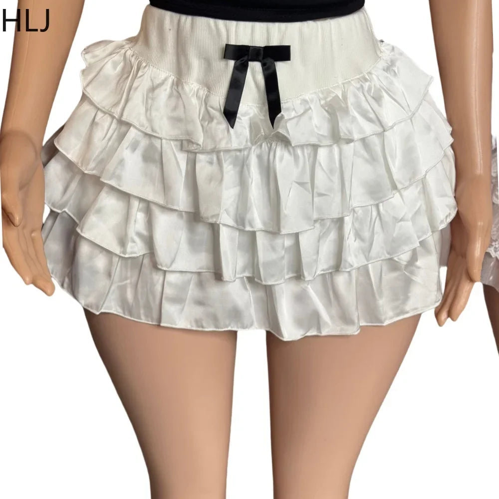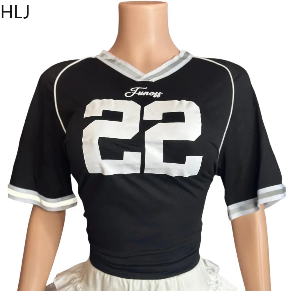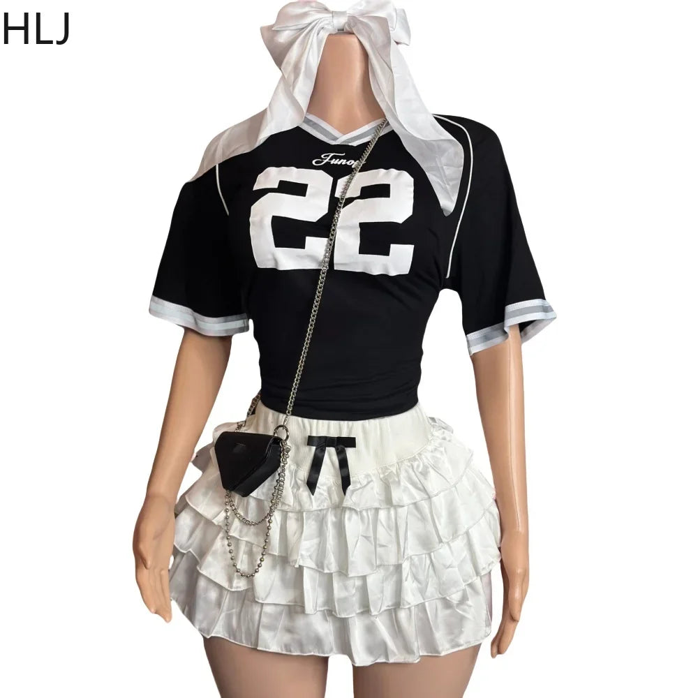 HLJ&GG Black Fashion Basketaball Tshirt Two Piece Sets Women V Neck Short Sleeve Top+Mini Bow Ruched Skirts Outfits Streetwear