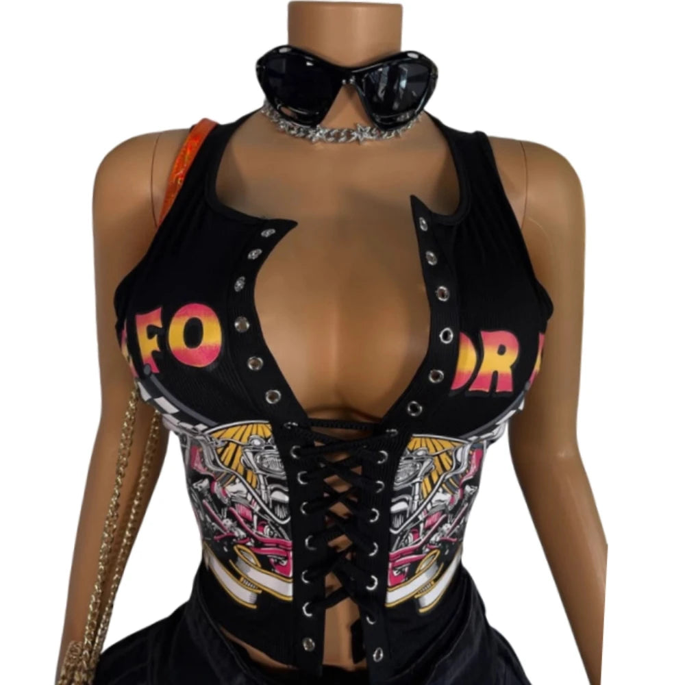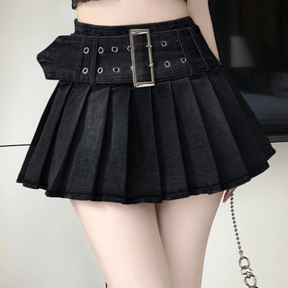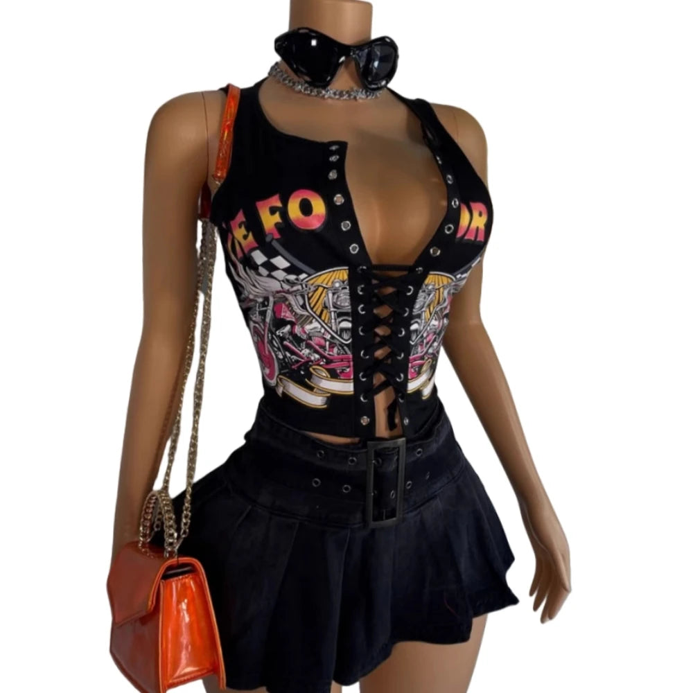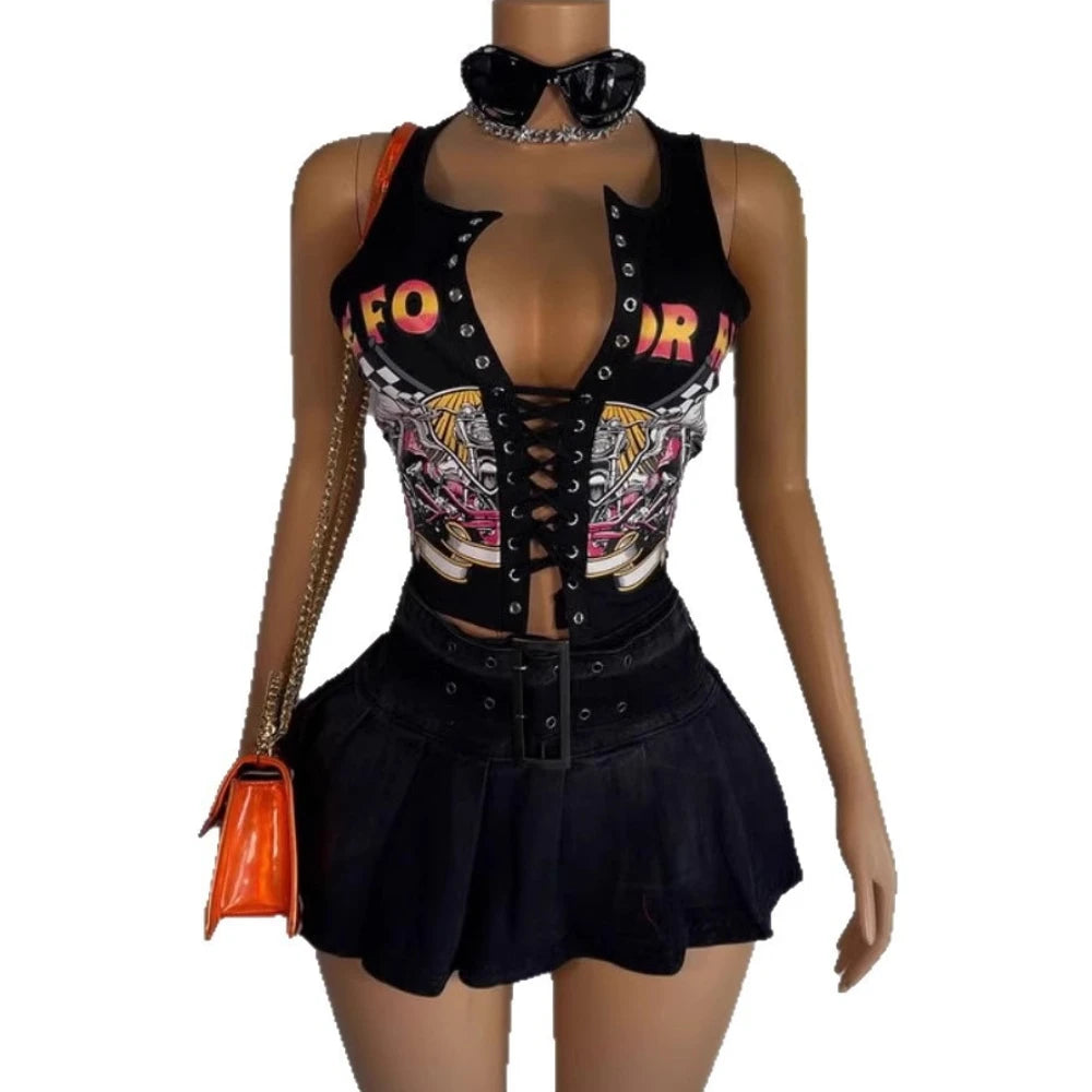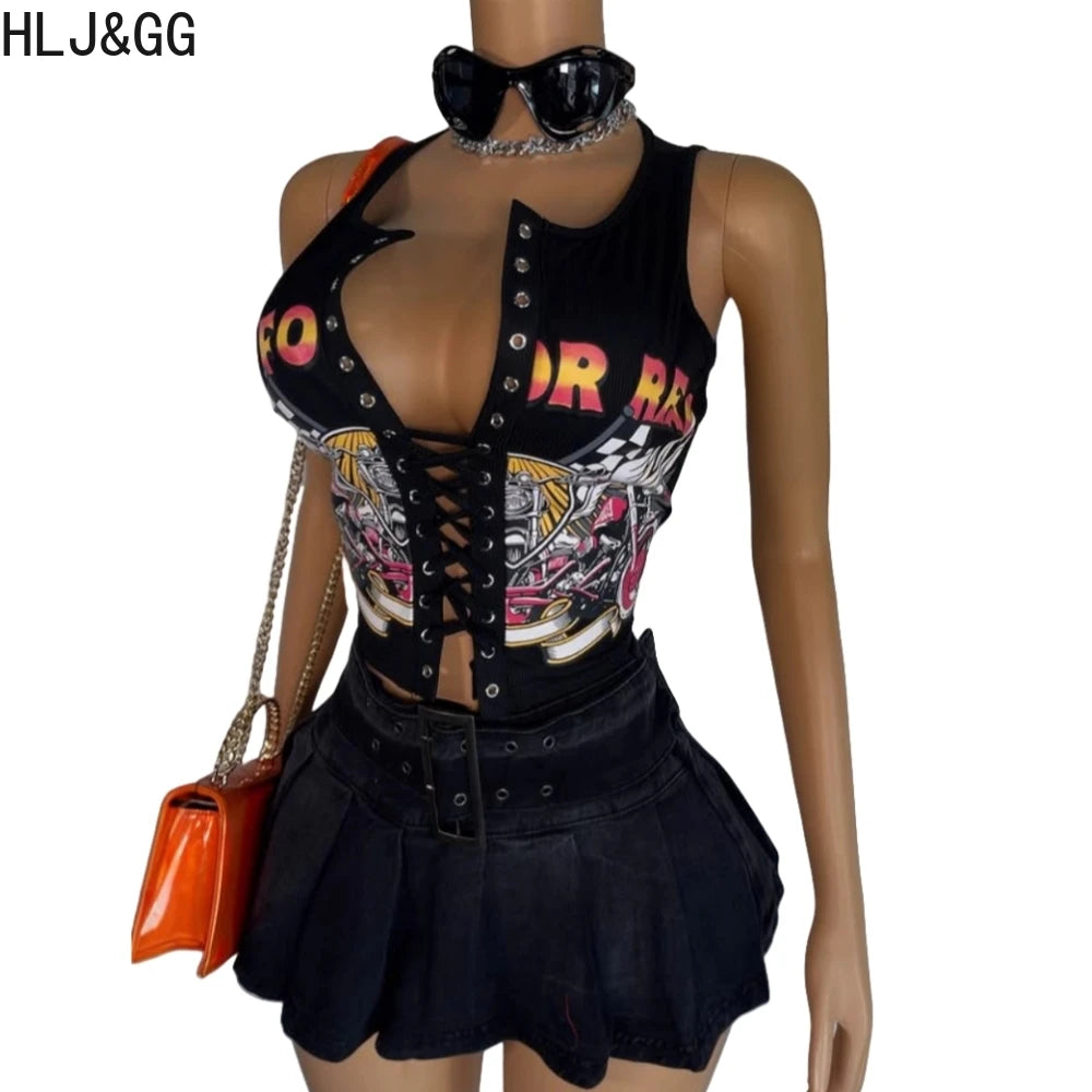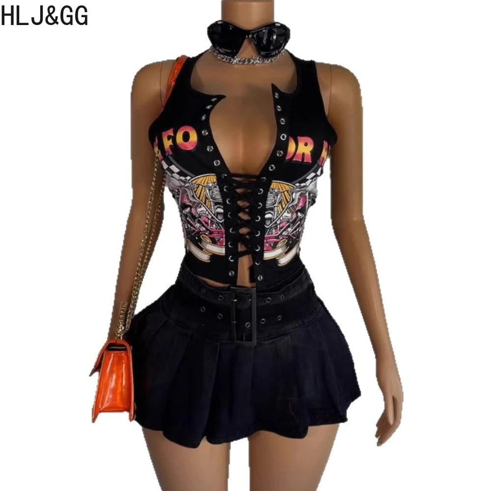 HLJ&GG Black Sexy Hot Girl Hollow Bandage Two Piece Sets Women Deep V Sleeveless Tank Top+Pleated Mini Skirts Outfits Streetwear