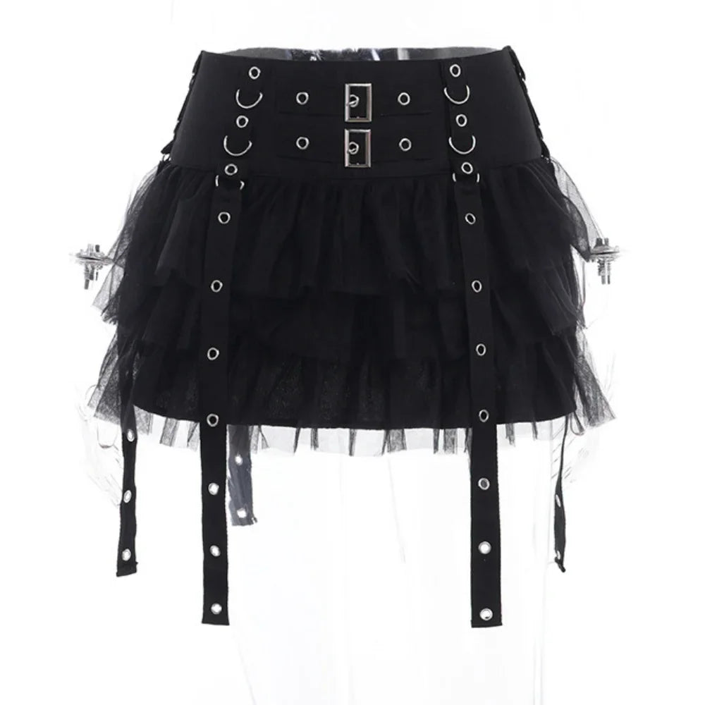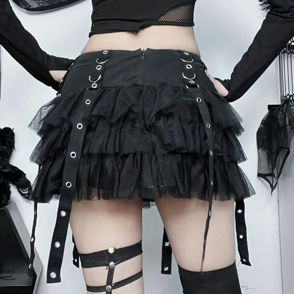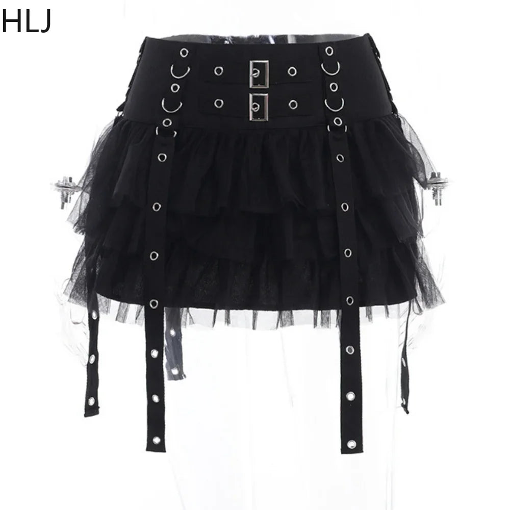 HLJ&GG Black Y2K Punk Streetwear Women Mesh See Though Bodysuits + Stacked Mini Skirts Two Piece Sets Fashion Trend 2pcs Outfits