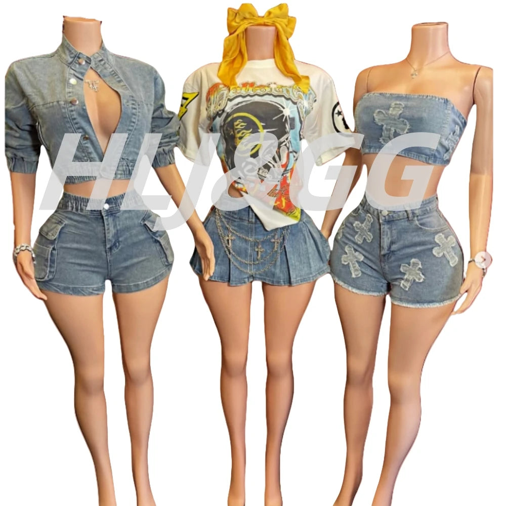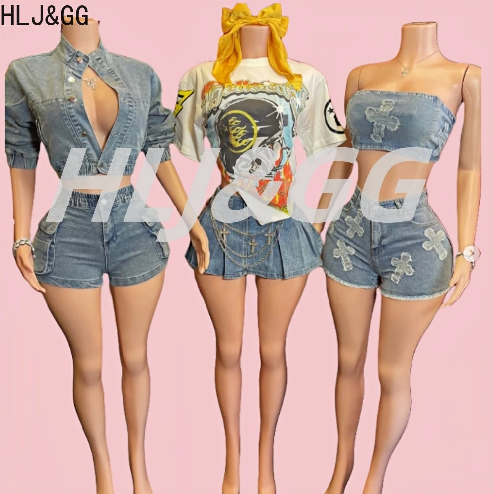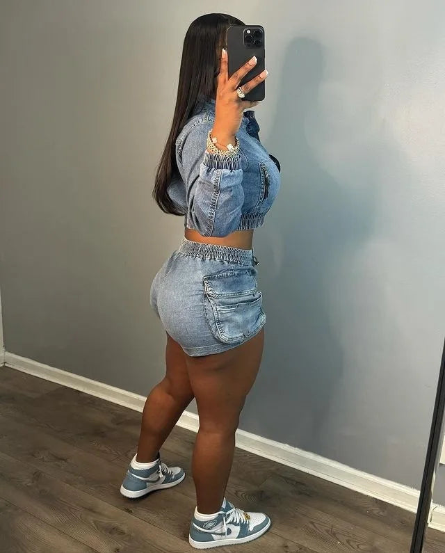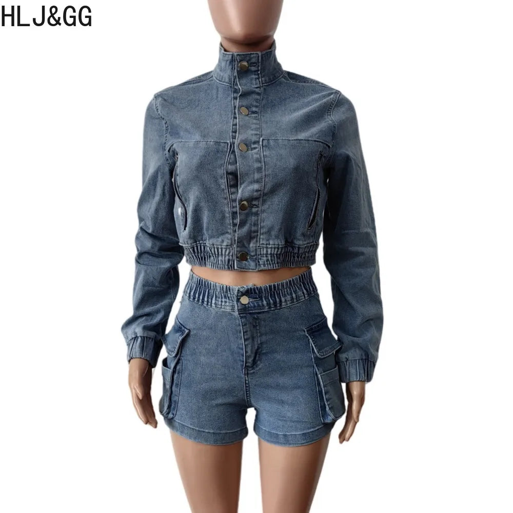 HLJ&GG Blue Fashion jeans Pocket Cargo Shorts Two Piece Sets Women Zipper Long Sleeve Crop Top And Shorts Outfits Cowboy Suits