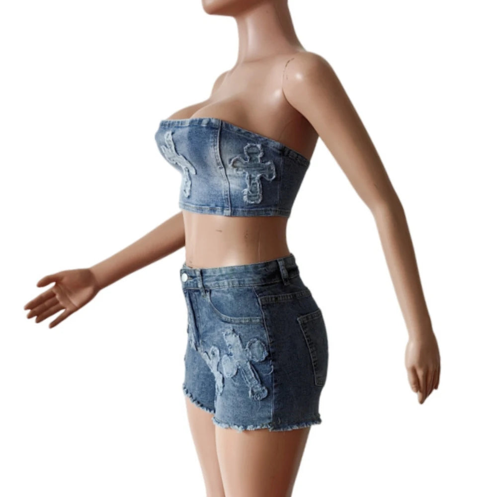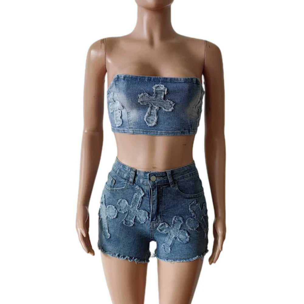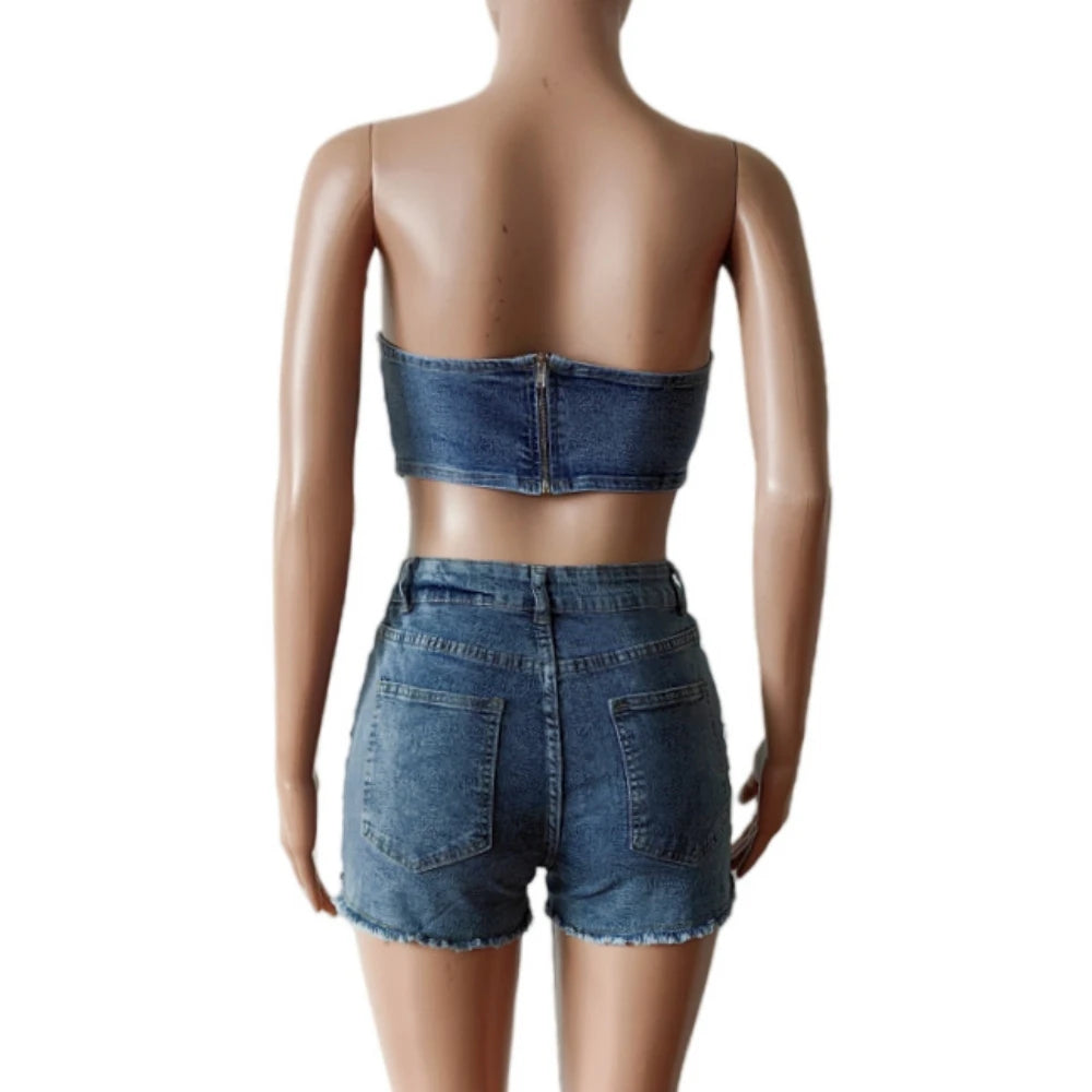HLJ&GG Blue Fashion jeans Pocket Cargo Shorts Two Piece Sets Women Zipper Long Sleeve Crop Top And Shorts Outfits Cowboy Suits