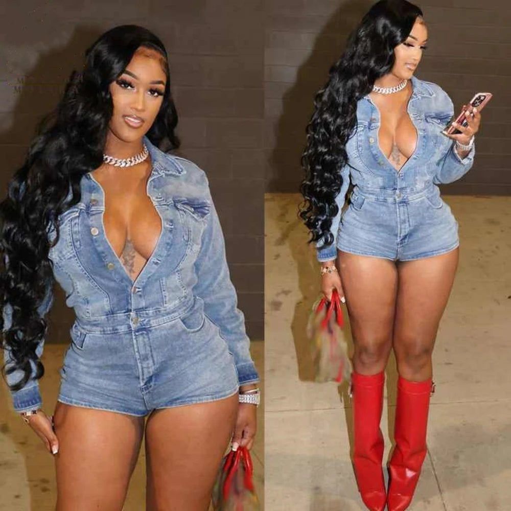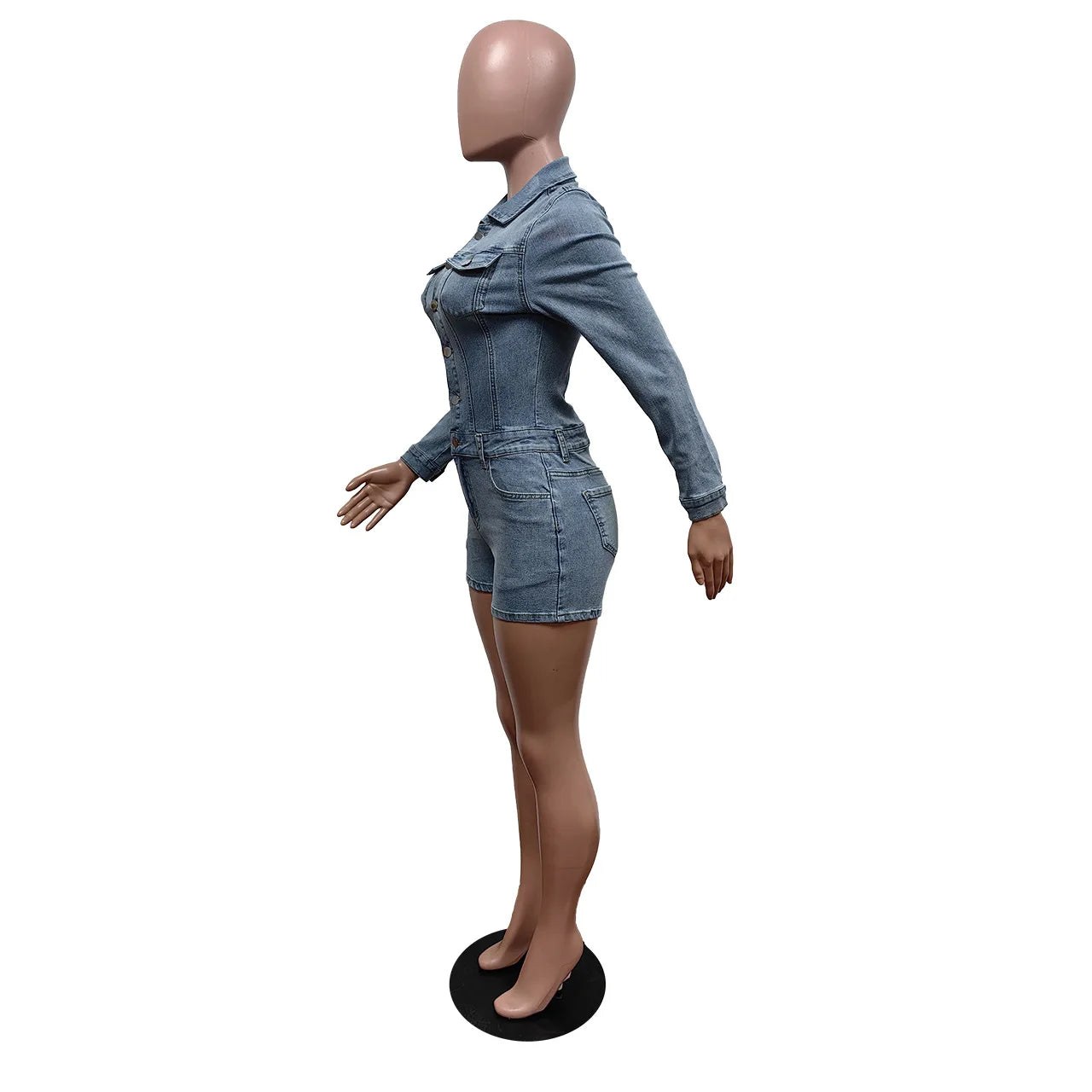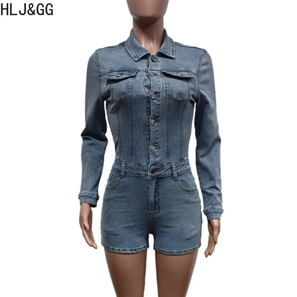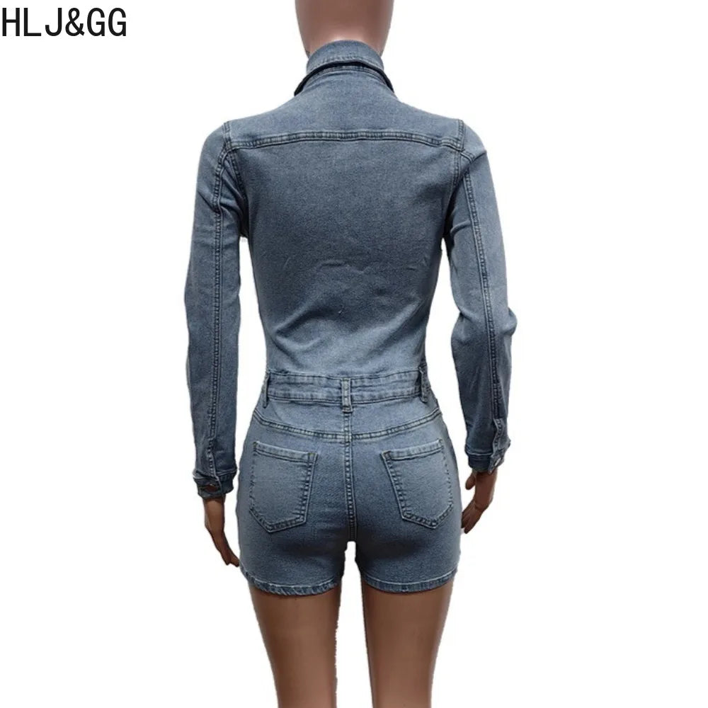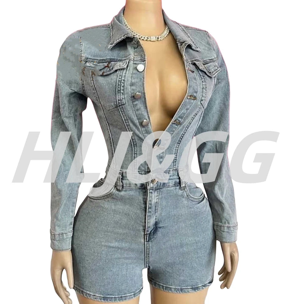 HLJ&GG Blue Fashion Pocket jeans Bodycon Rompers Women V Neck Long Sleeve Slim Cowboy One Piece Jumpsuits Sexy Female Overalls