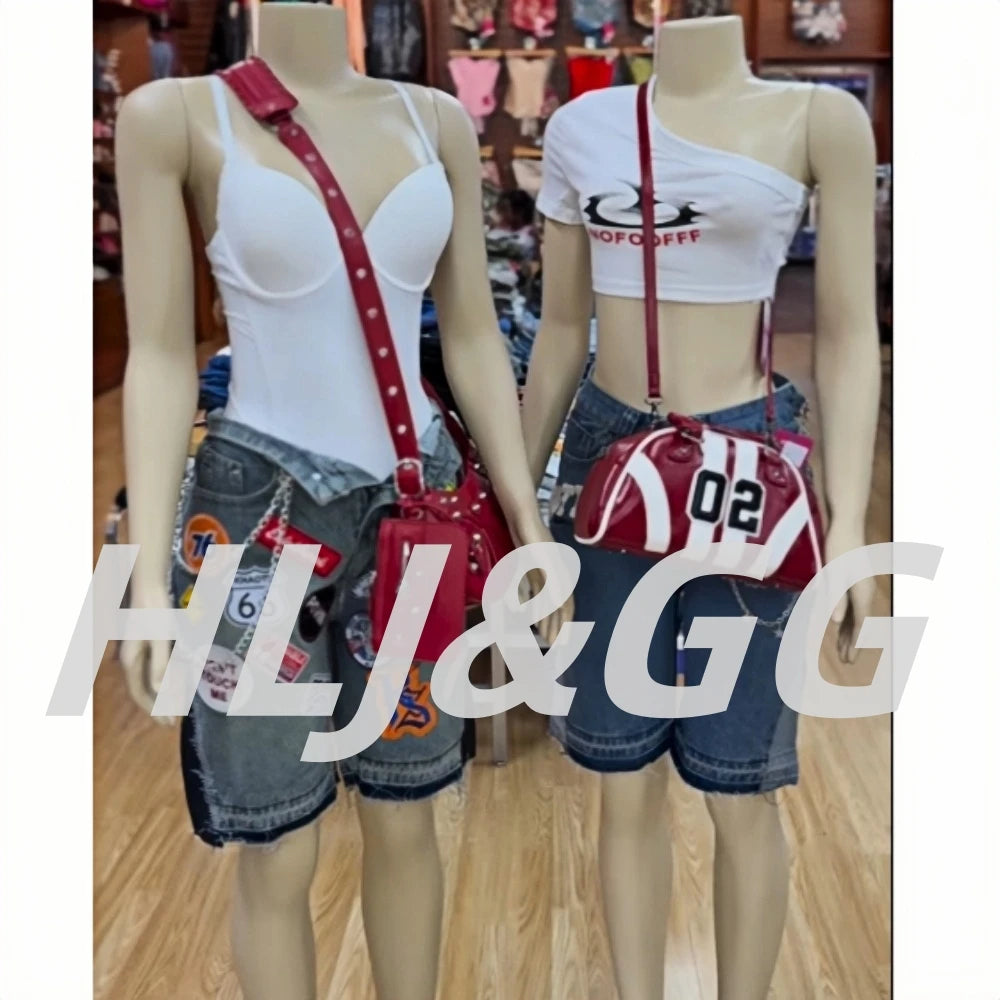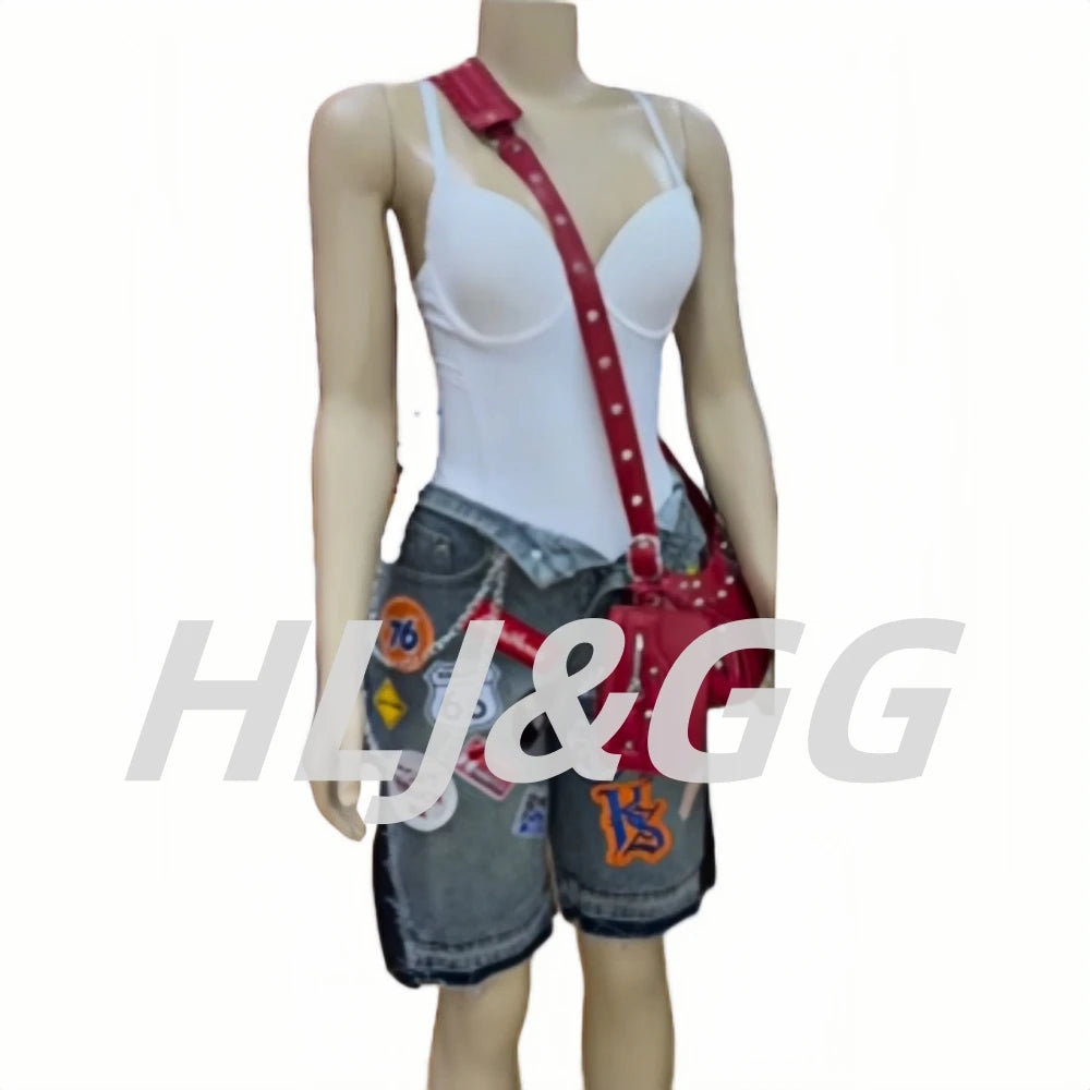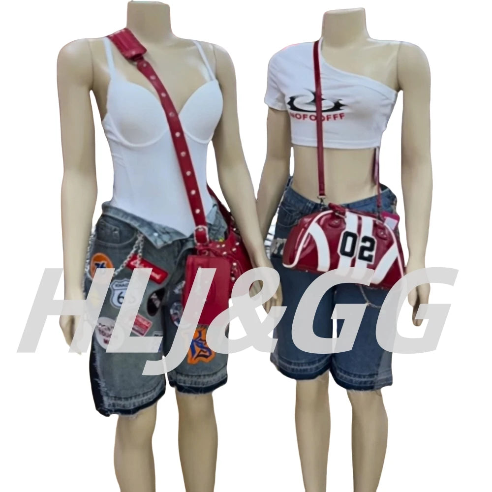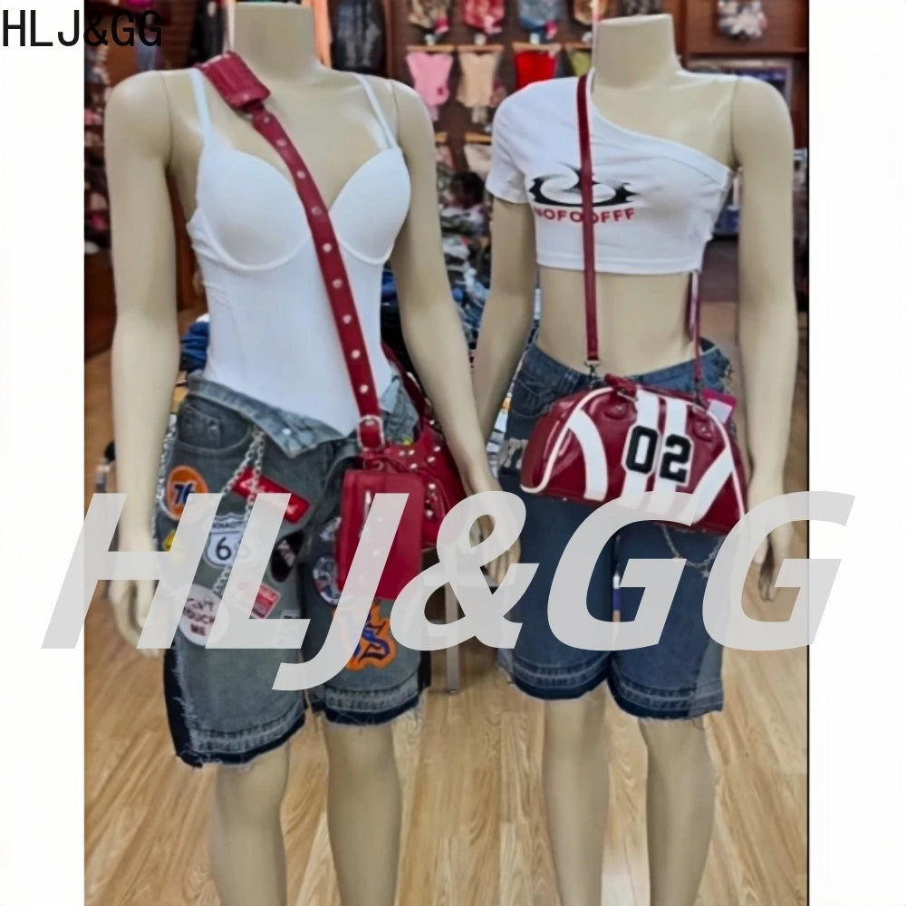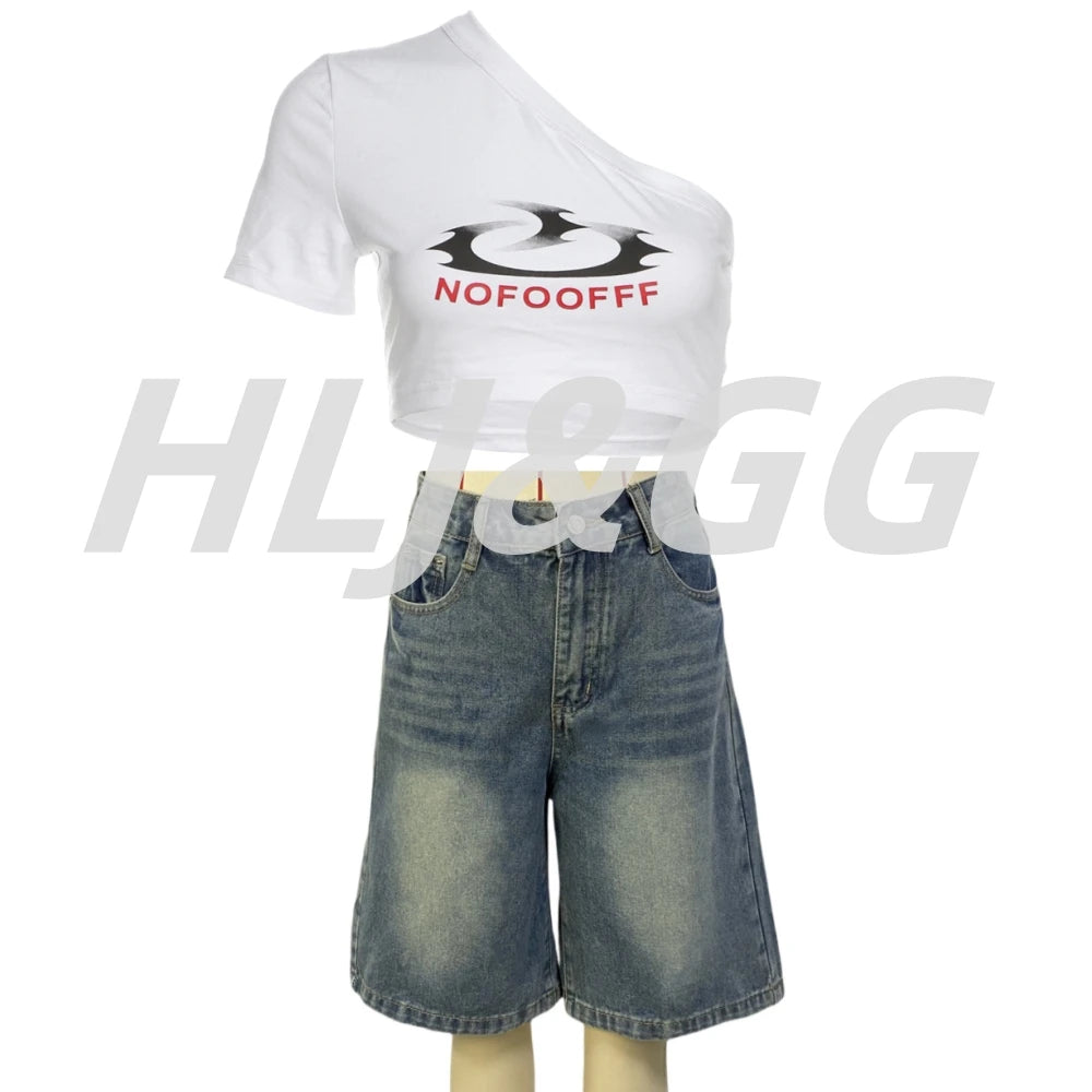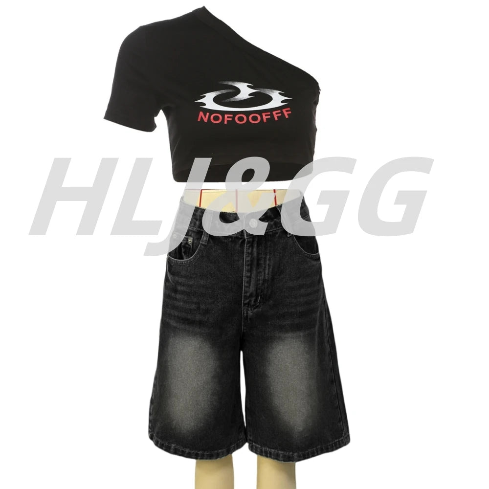HLJ&GG Blue Retro Fashion jeans Two Piece Sets Women One Shoulder Short Sleeve Crop Top+Jeans Shorts Outfits Fashion Streetwear