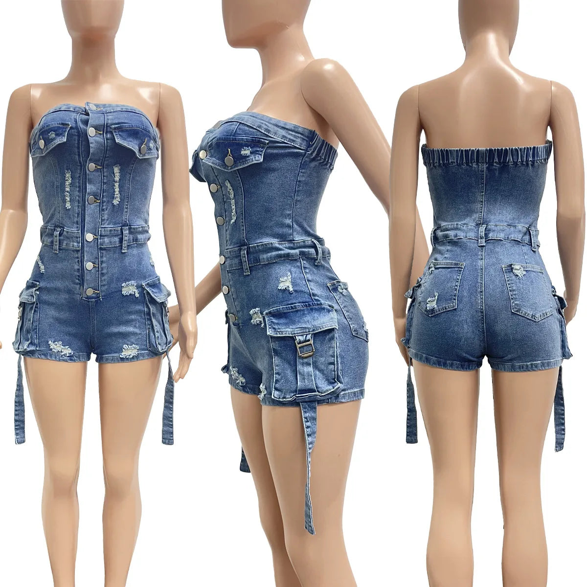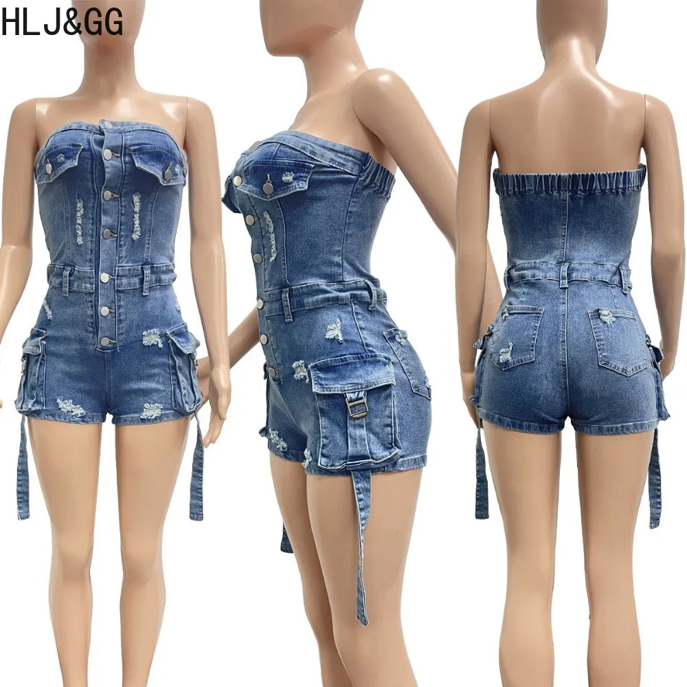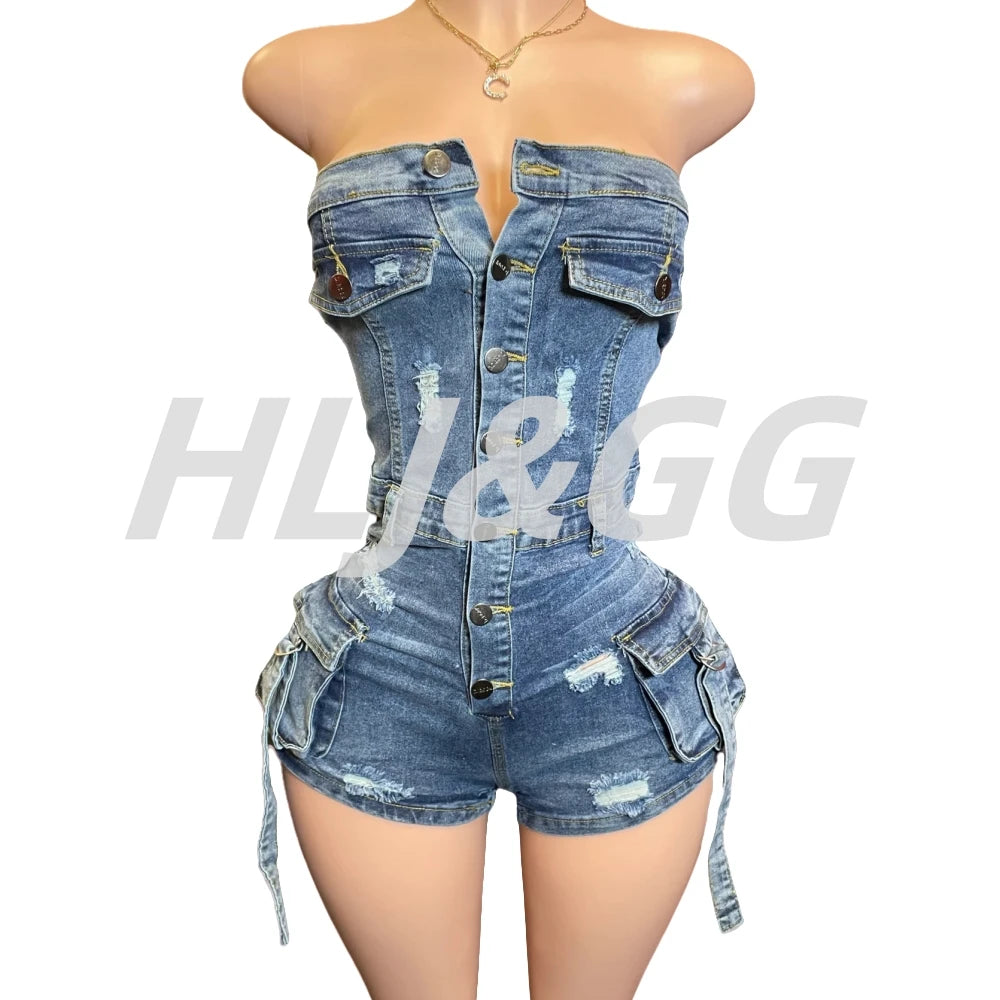 HLJ&GG Blue Sexy jeans Pocket Cargo Bodycon Rompers Women Off Shoulder Sleeveless Backless Slim Jumpsuit Fashion Cowboy Playsuit