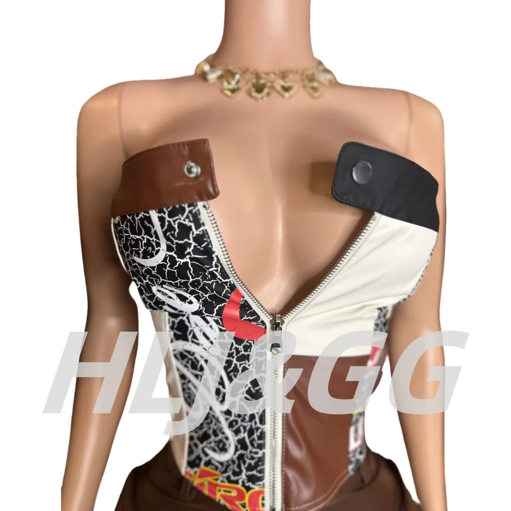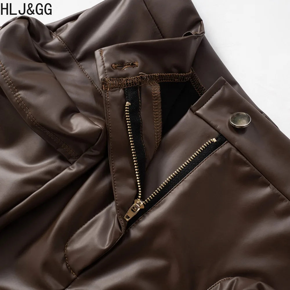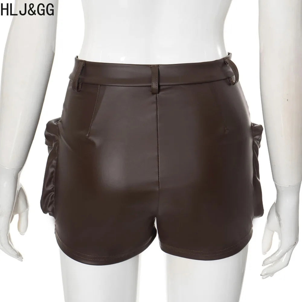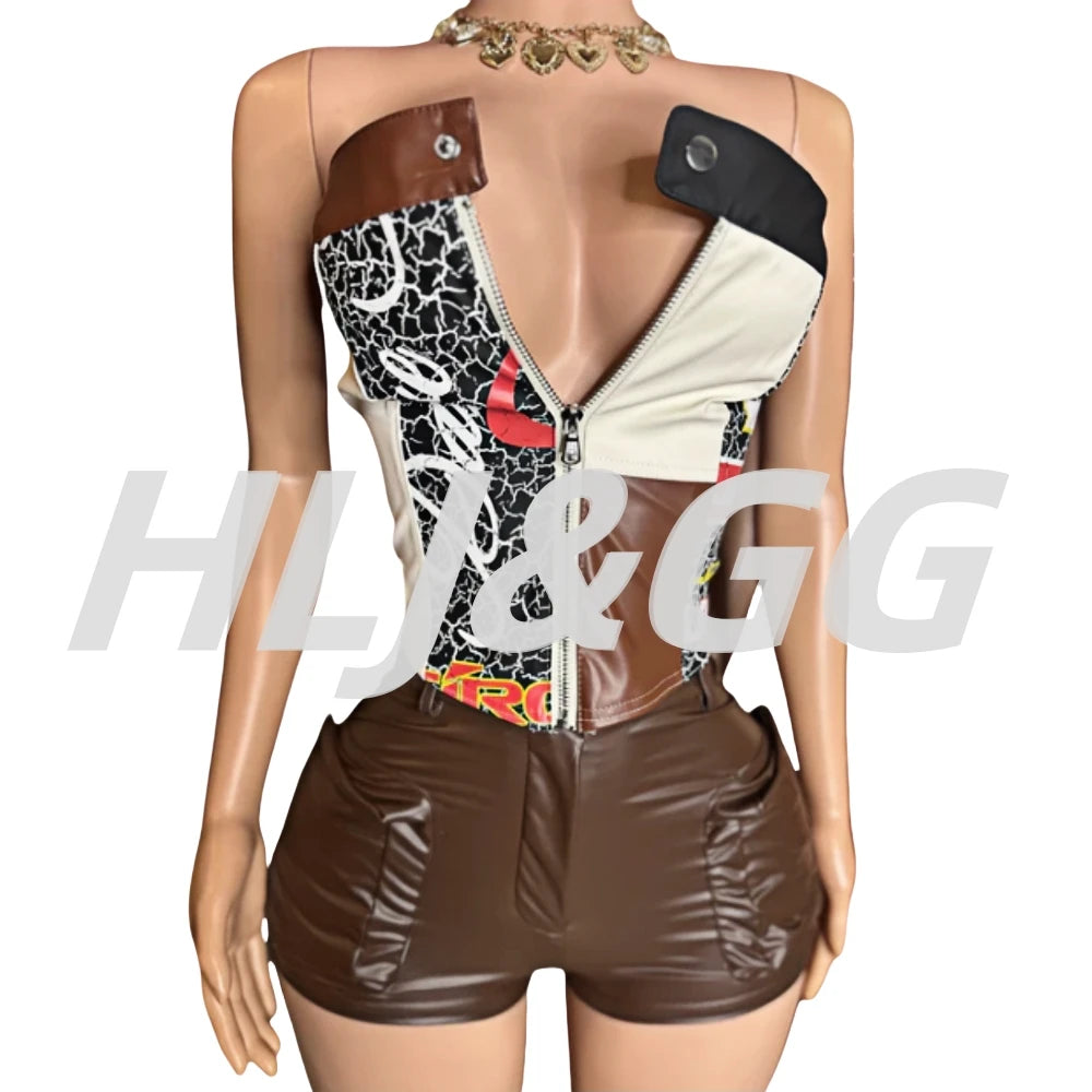 HLJ&GG Brown Y2K Fashion Leather Cargo Shorts Two Piece Sets Women Off Shoulder Zip Slim Crop Top And Shorts Outfits Streetwear