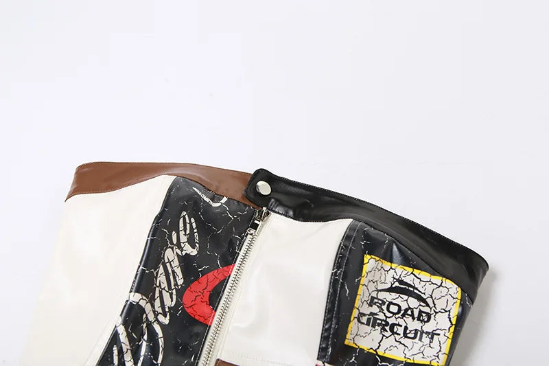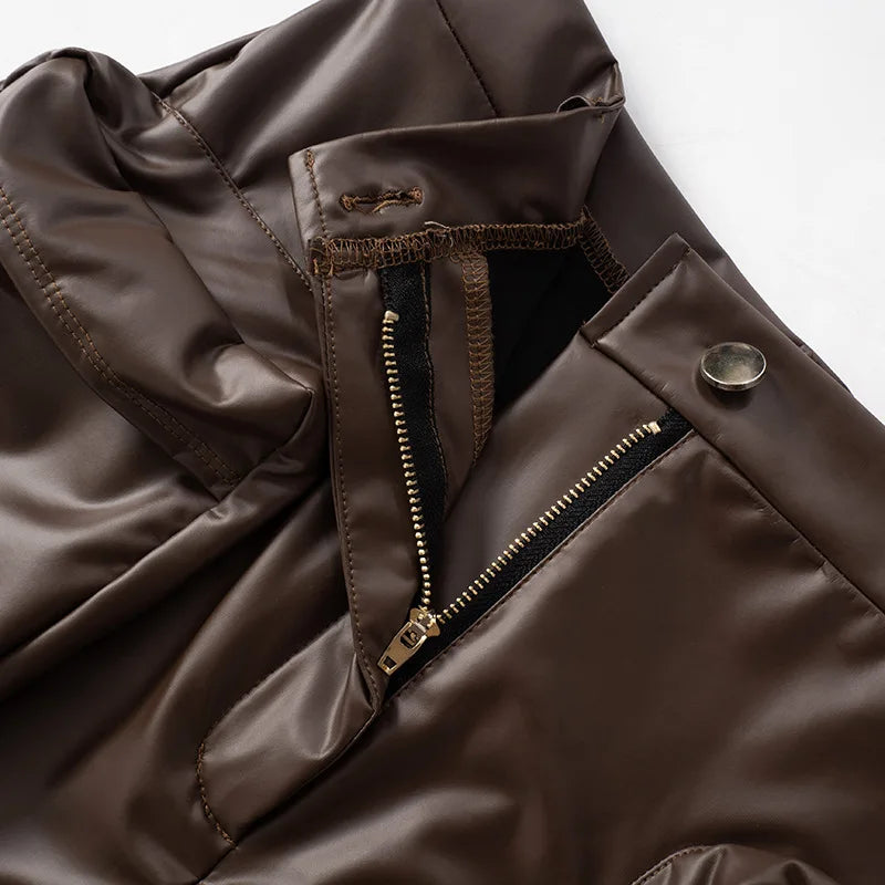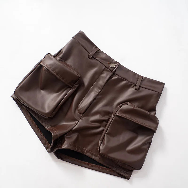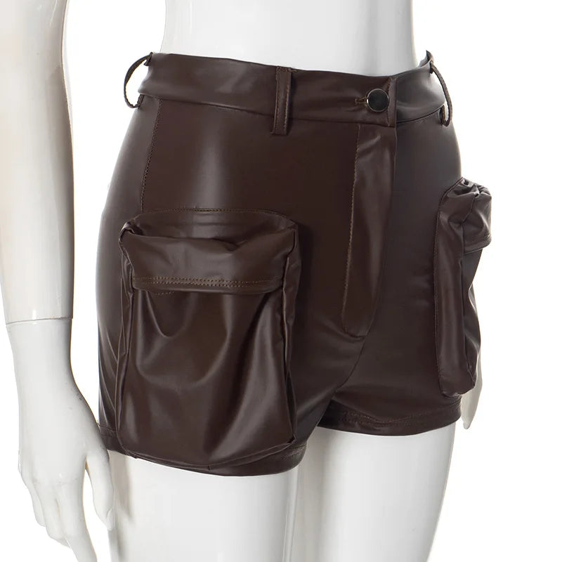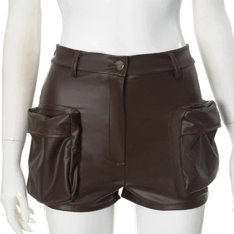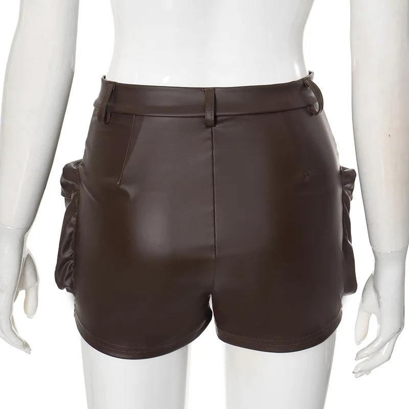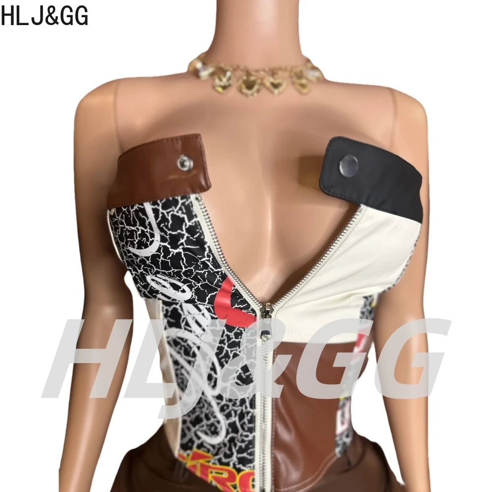 HLJ&GG Brown Y2K Fashion Leather Cargo Shorts Two Piece Sets Women Off Shoulder Zip Slim Crop Top And Shorts Outfits Streetwear