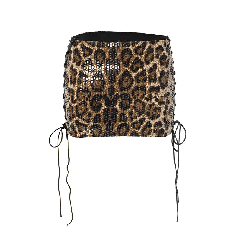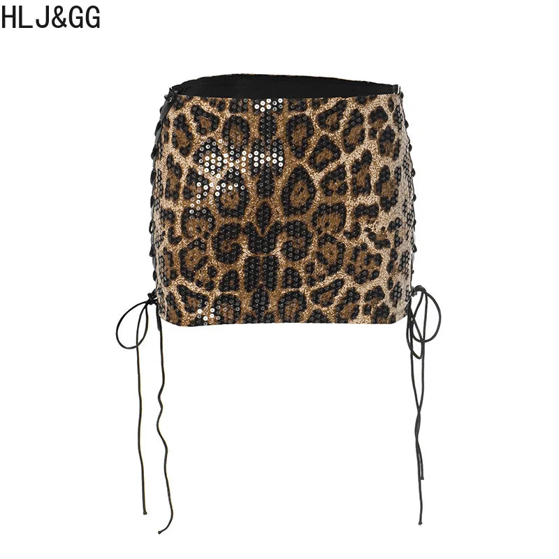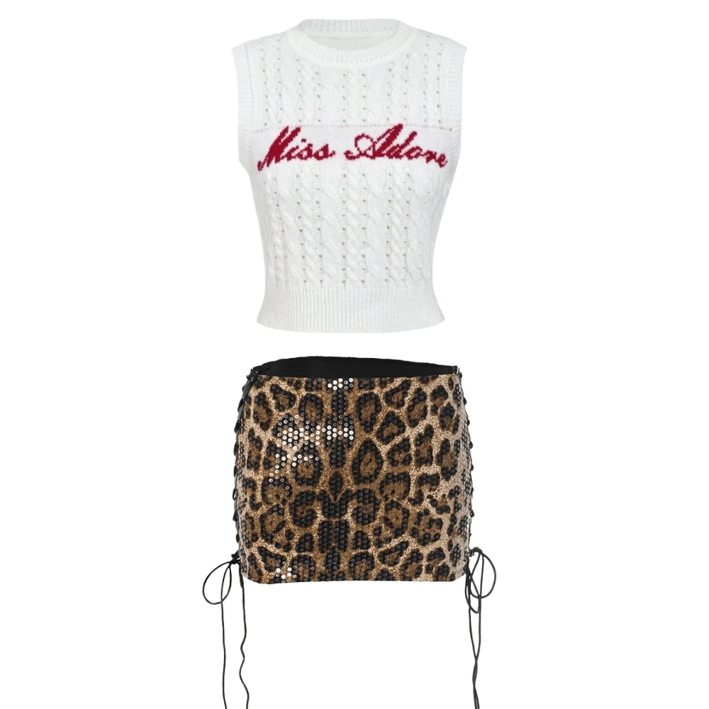 HLJ&GG Fashion Knitting Printing Tank Top Two Piece Set Women Sleeveless Slim Crop Vest+Leopard Side Bandage Mini Skirts Outfits