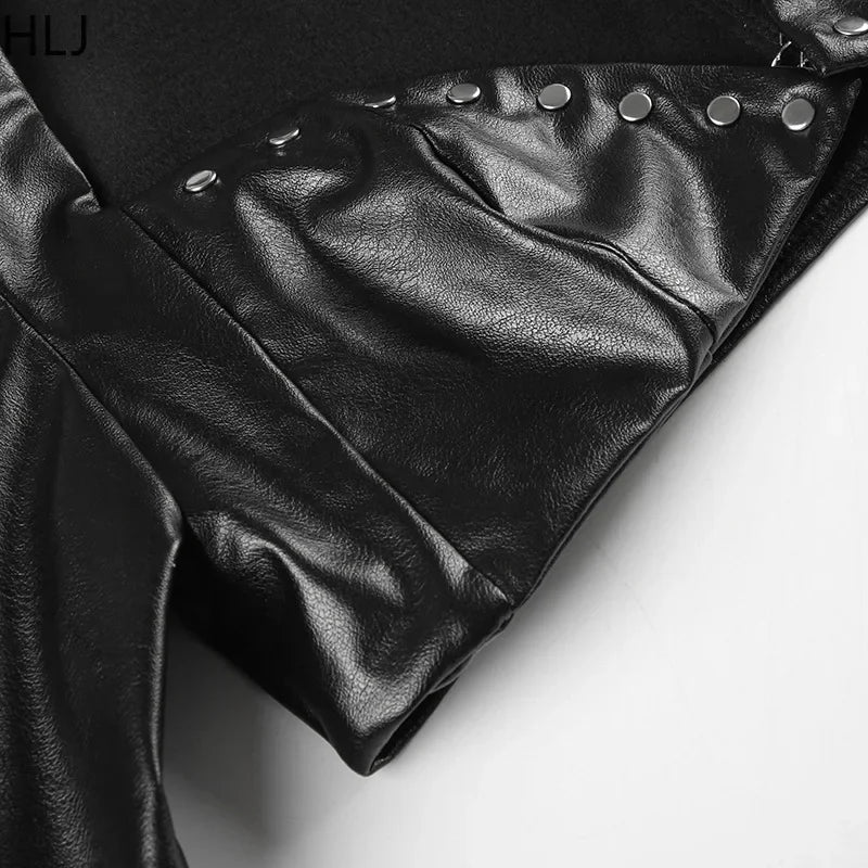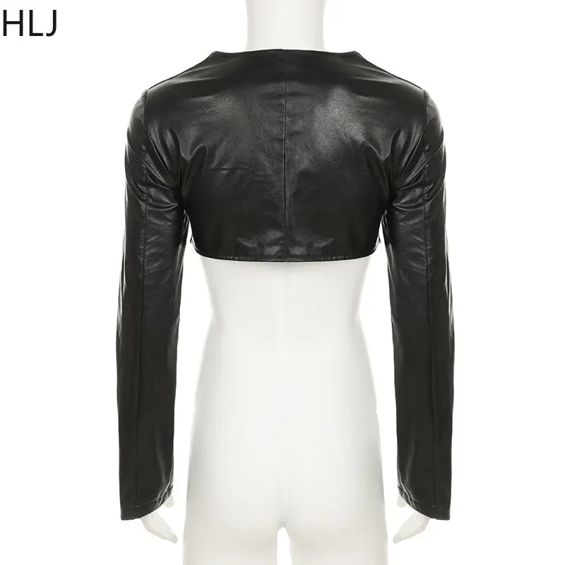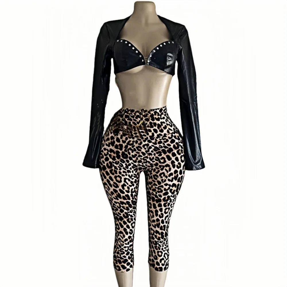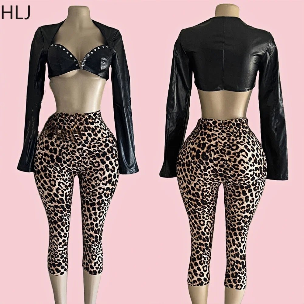 HLJ&GG Fashion Leather Long Sleeve Crop Jacket + Skinny Leopard Pants Two Piece Sets Y2K Cool Girl Outfits Women Sexy Streetwear