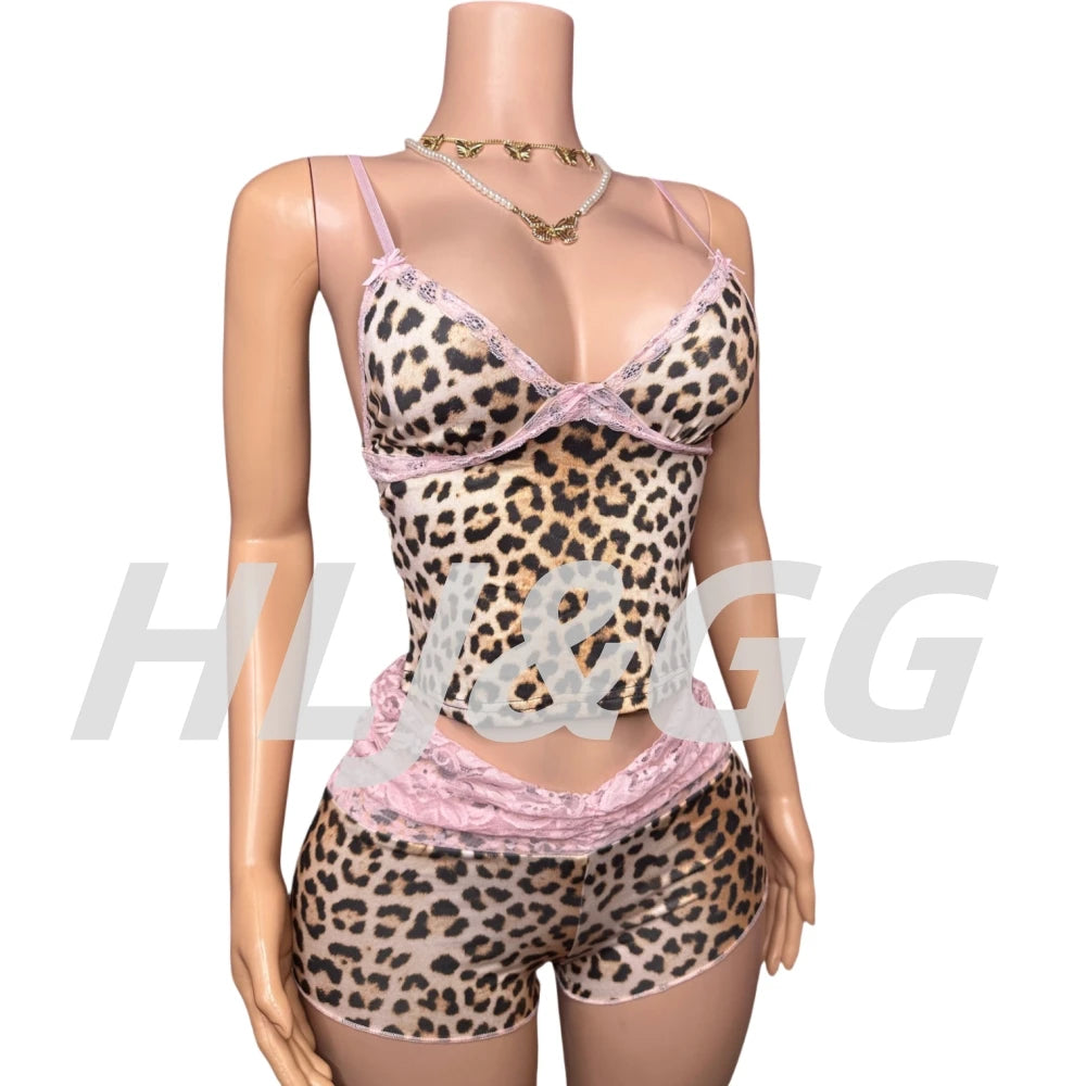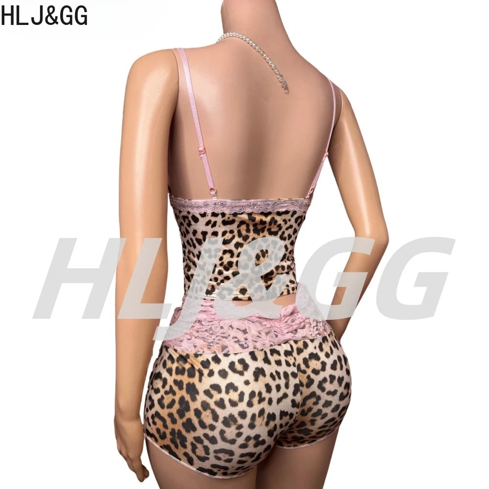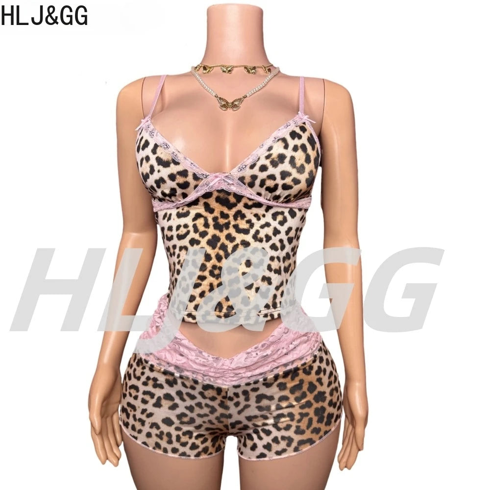 HLJ&GG Fashion Leopard Lace Stitching Two Piece Sets Women V Neck Spaghetti Strap Slim Crop Top + Shorts Outfits Sexy Streetwear