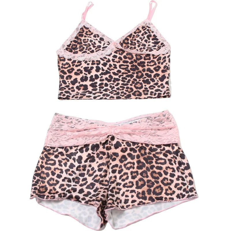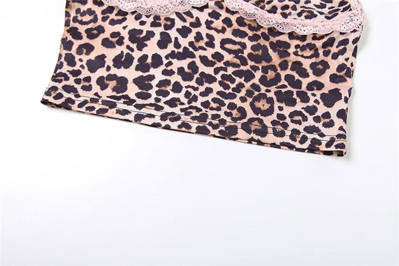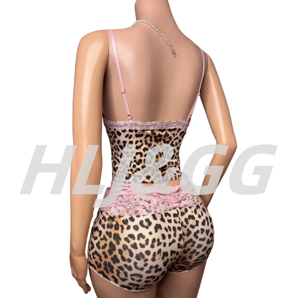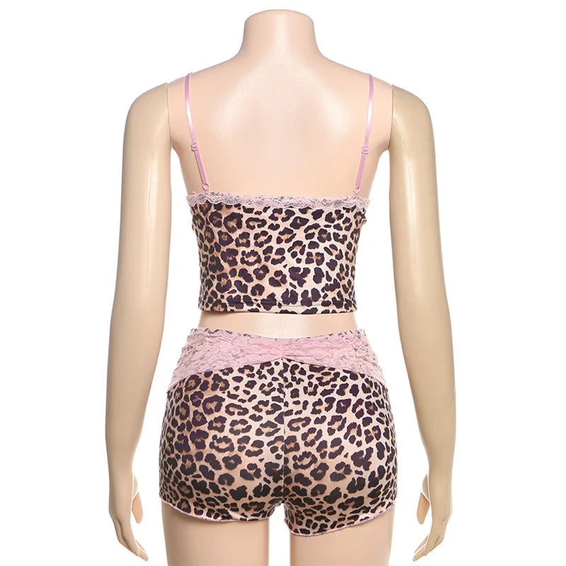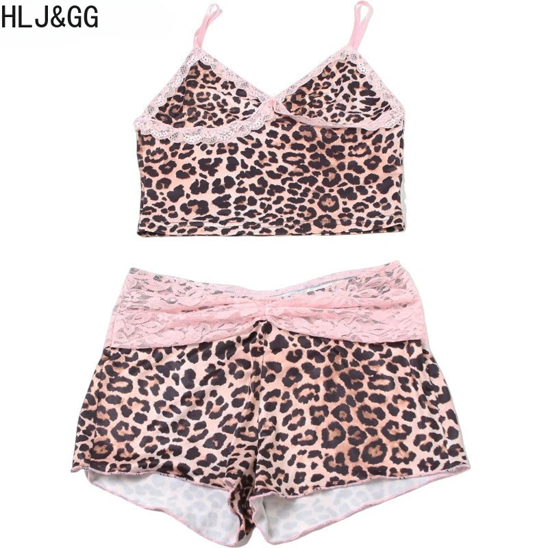 HLJ&GG Fashion Leopard Lace Stitching Two Piece Sets Women V Neck Spaghetti Strap Slim Crop Top + Shorts Outfits Sexy Streetwear