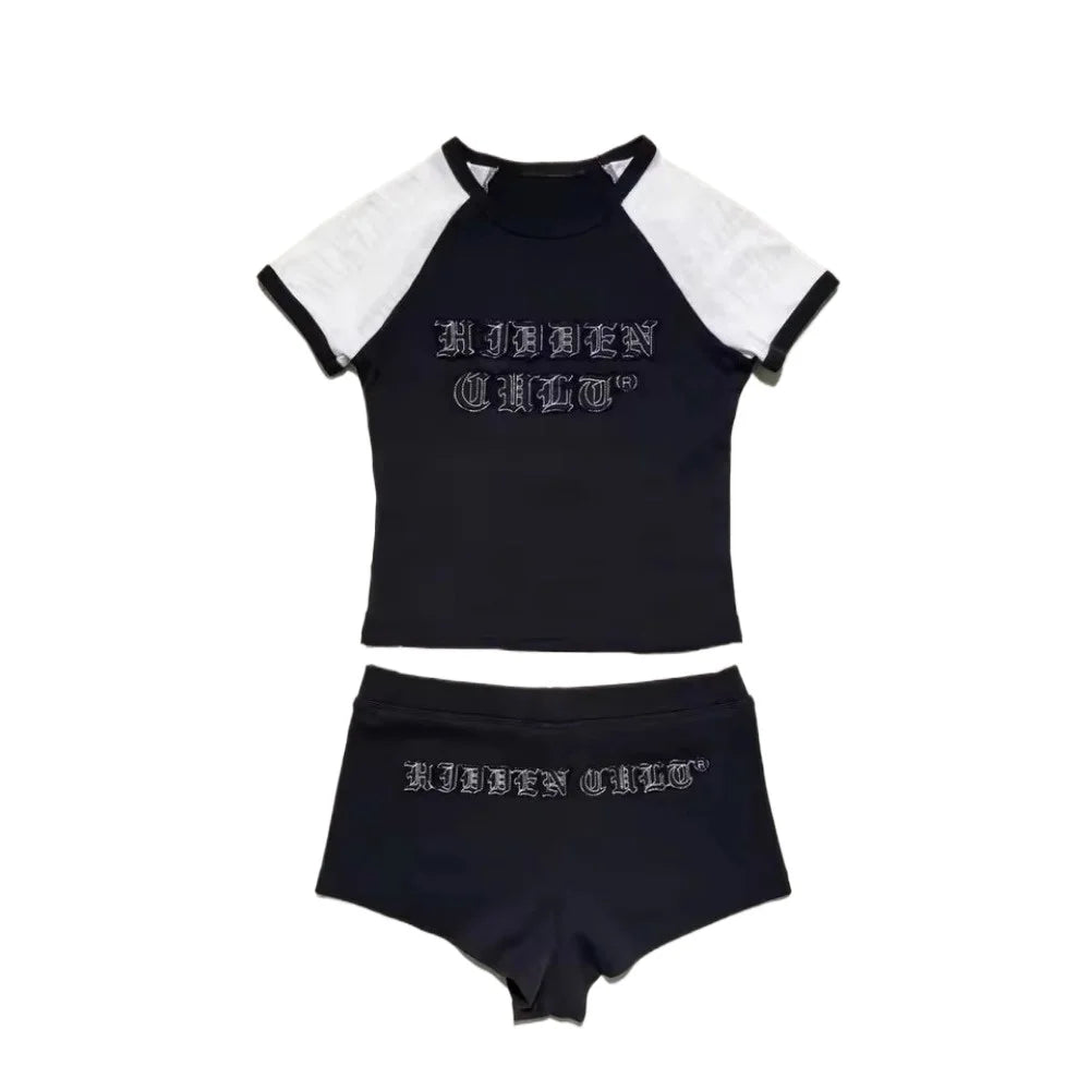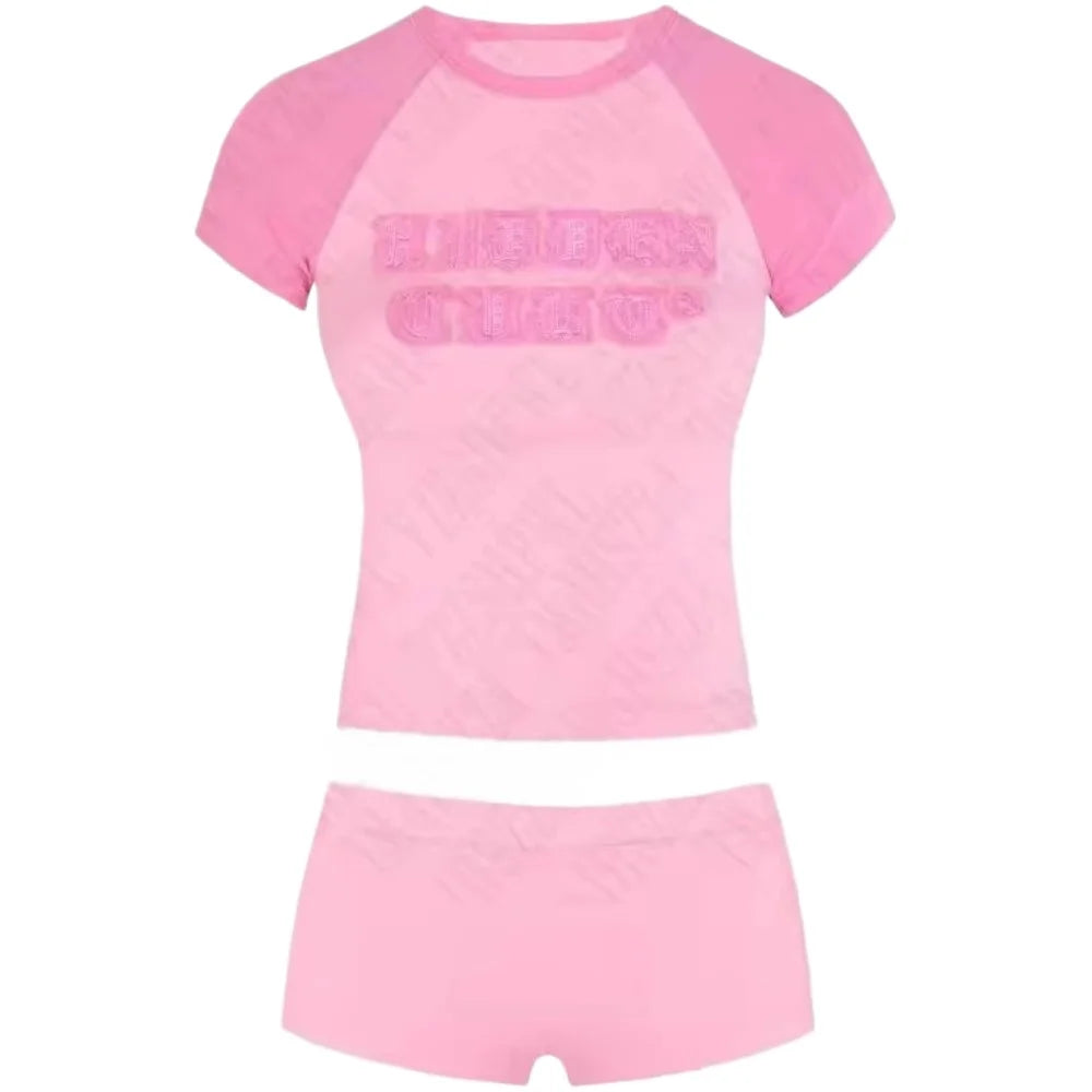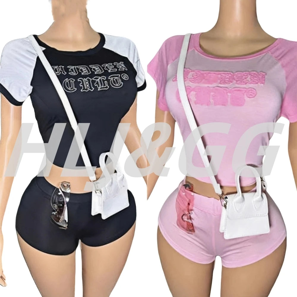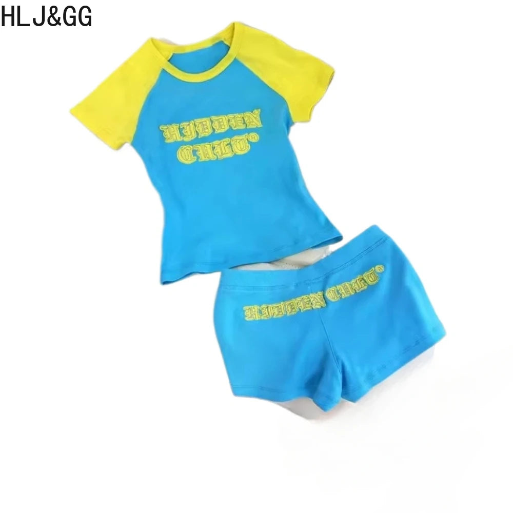 HLJ&GG Fashion Letter Y2K Shorts Two Piece Sets Women Round Neck Slim Crop Top And Shorts Outfits Summer New Hot Girl Streetwear