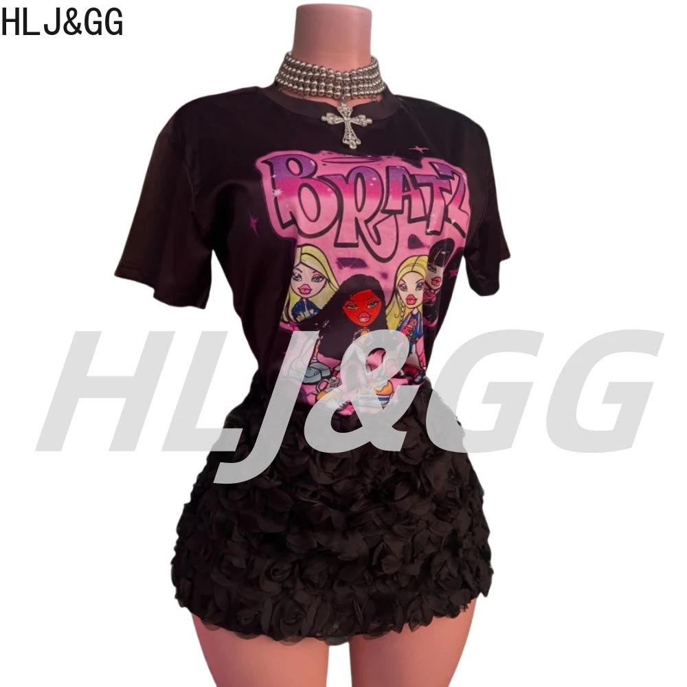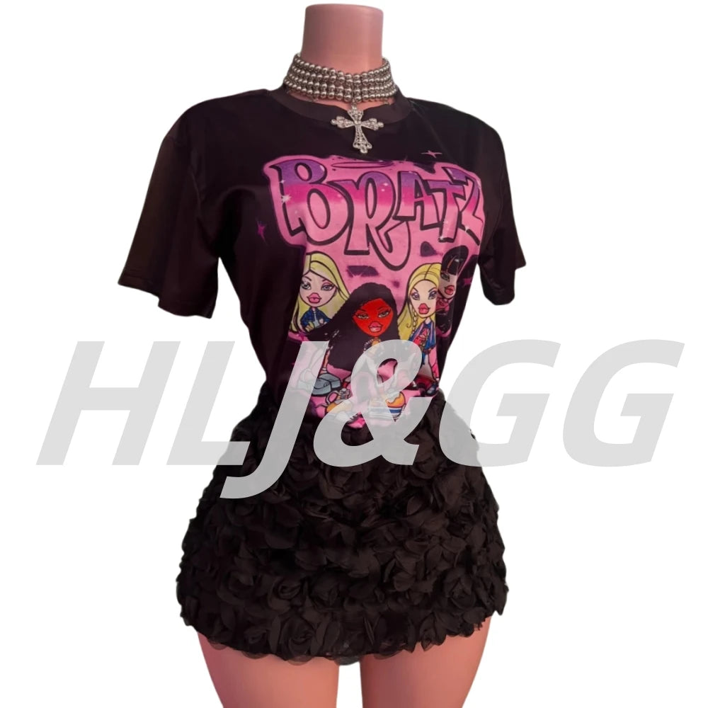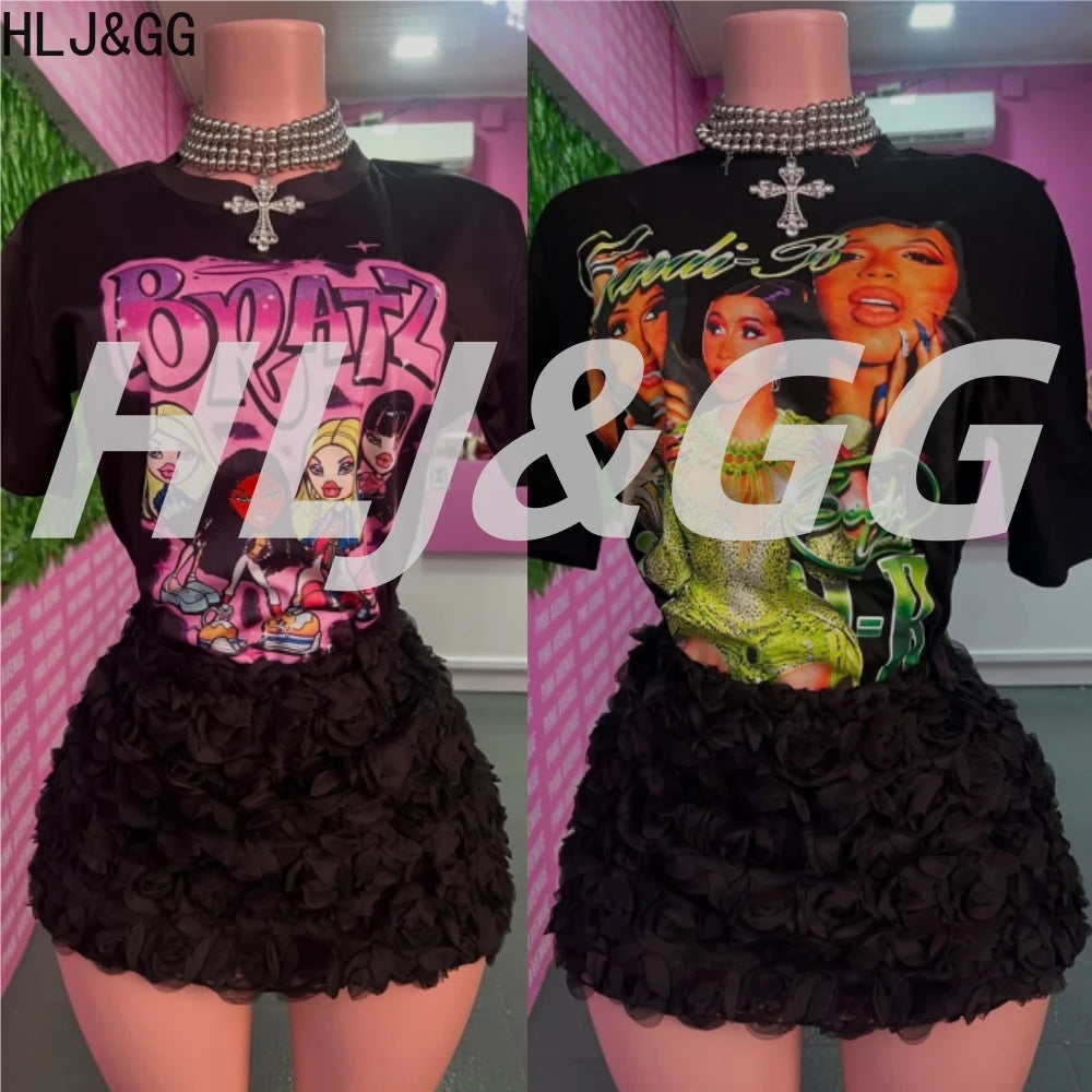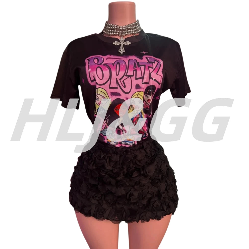HLJ&GG Fashion Pattern Print Loose Tshirts Two Piece Sets Women O Neck Short Sleeve Top + Fur Mini Skirts Outfits Y2K Streetwear