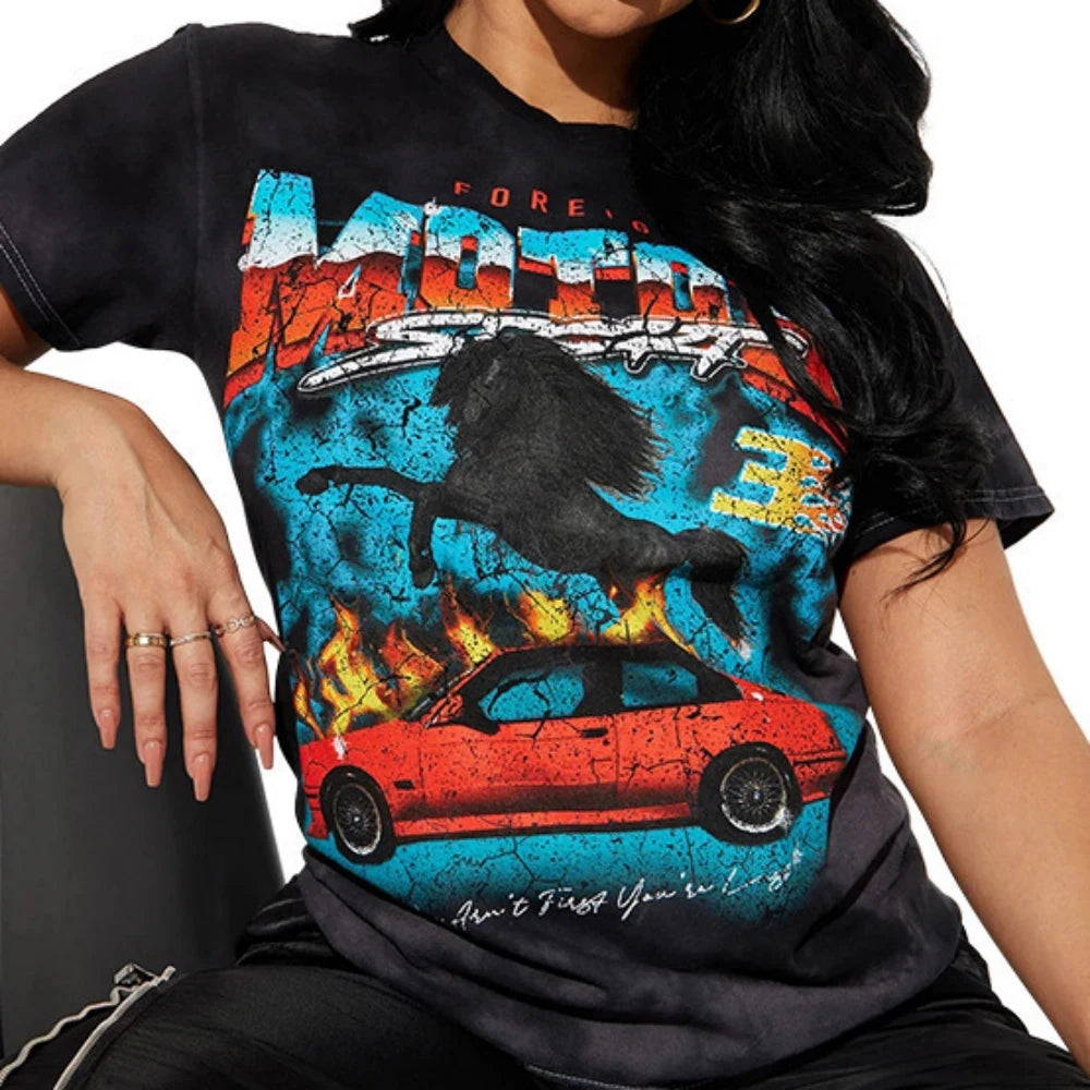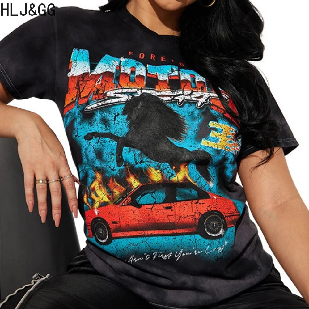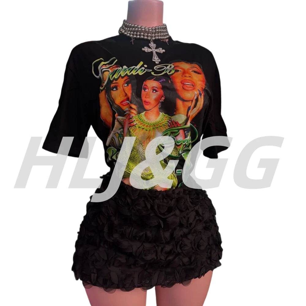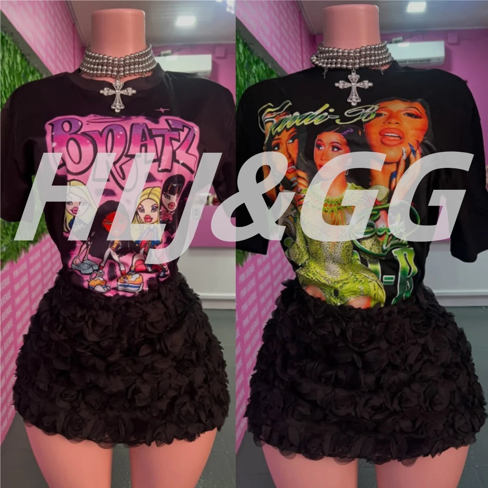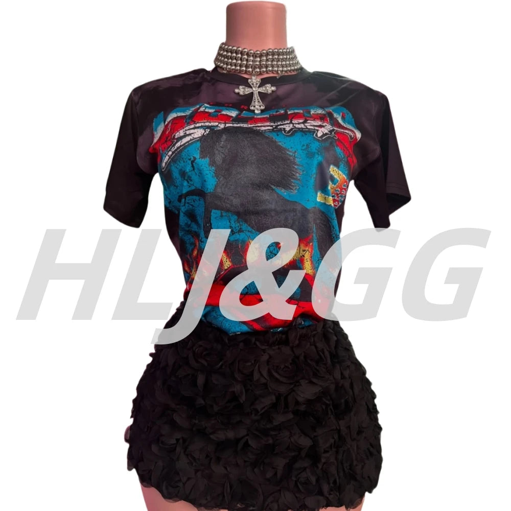 HLJ&GG Fashion Pattern Print Loose Tshirts Two Piece Sets Women O Neck Short Sleeve Top + Fur Mini Skirts Outfits Y2K Streetwear