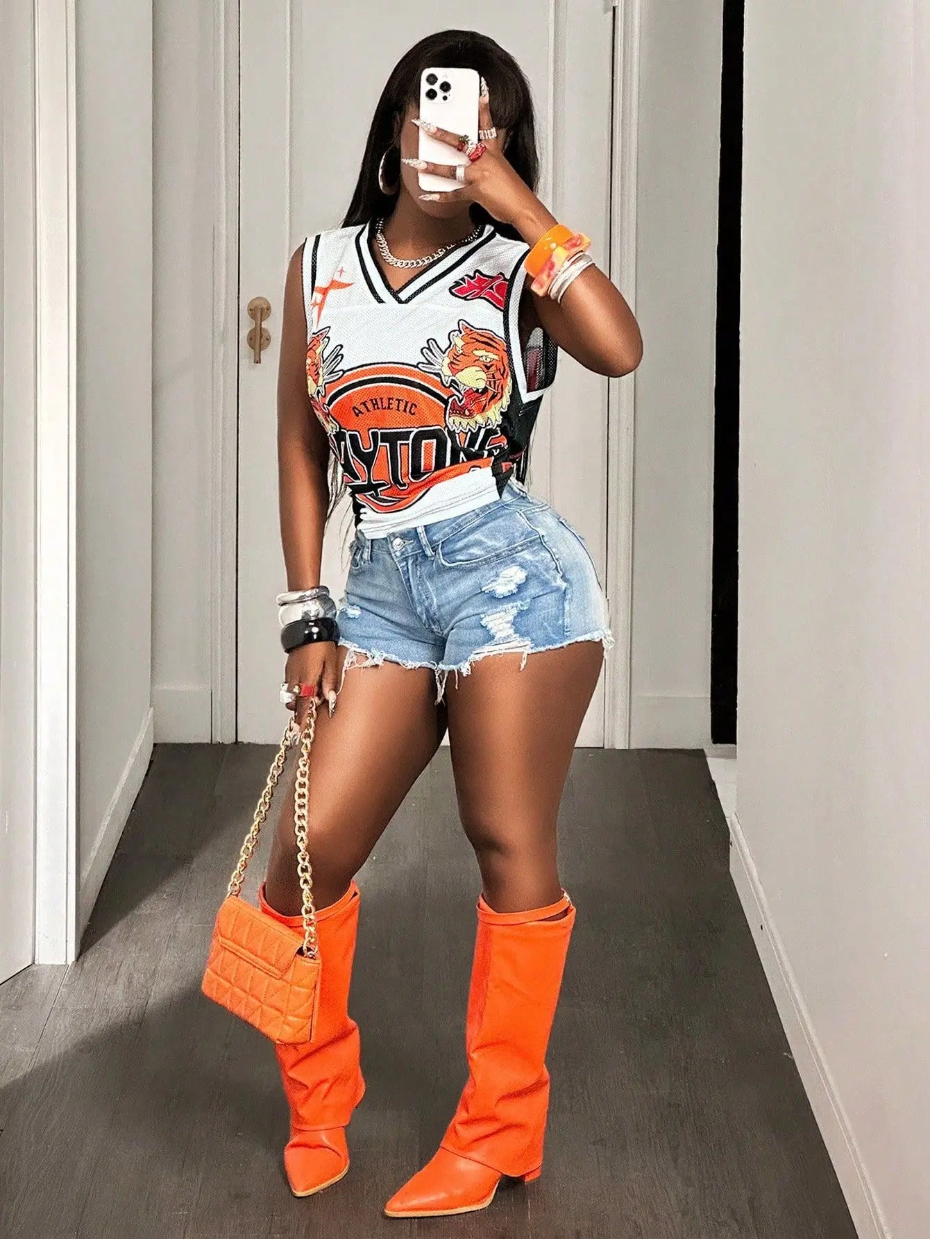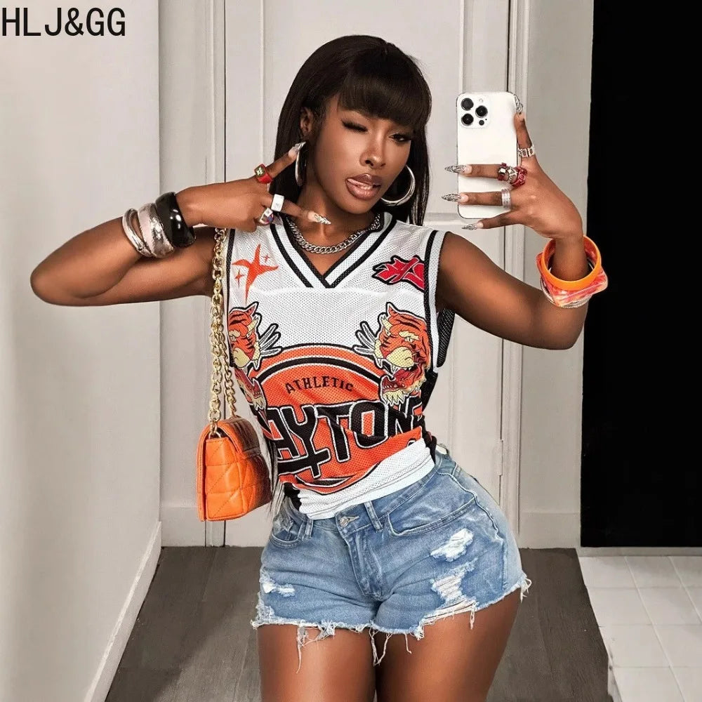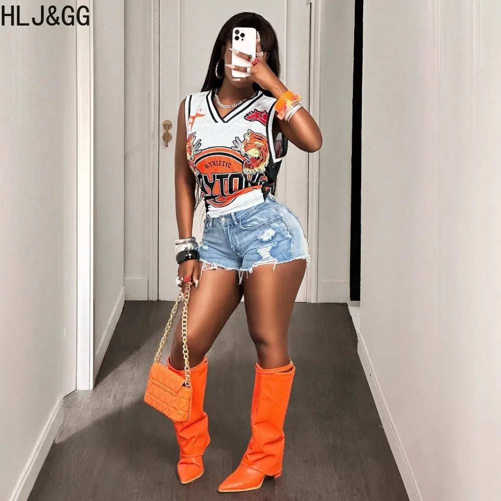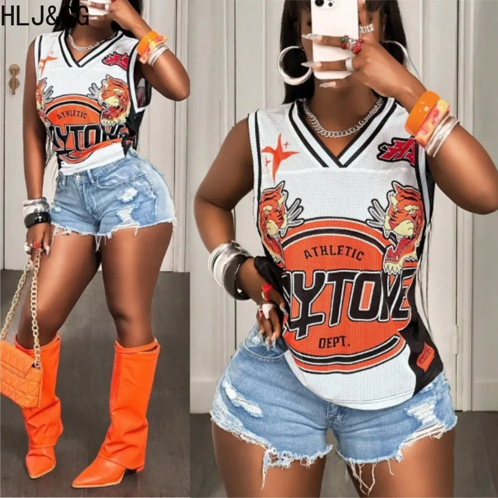 HLJ&GG Fashion Y2K Letter Print Loose Tshirts Two Piece Sets Women Round Neck Sleeveless Top And jeans Shorts Outfits Streetwear