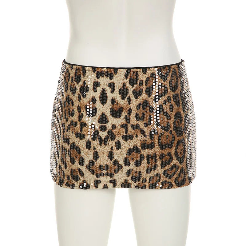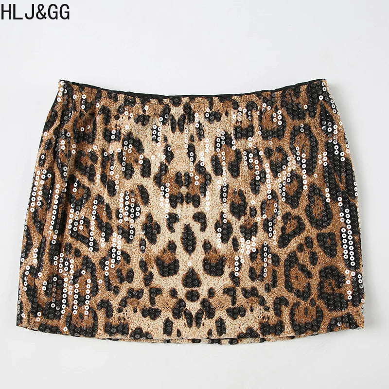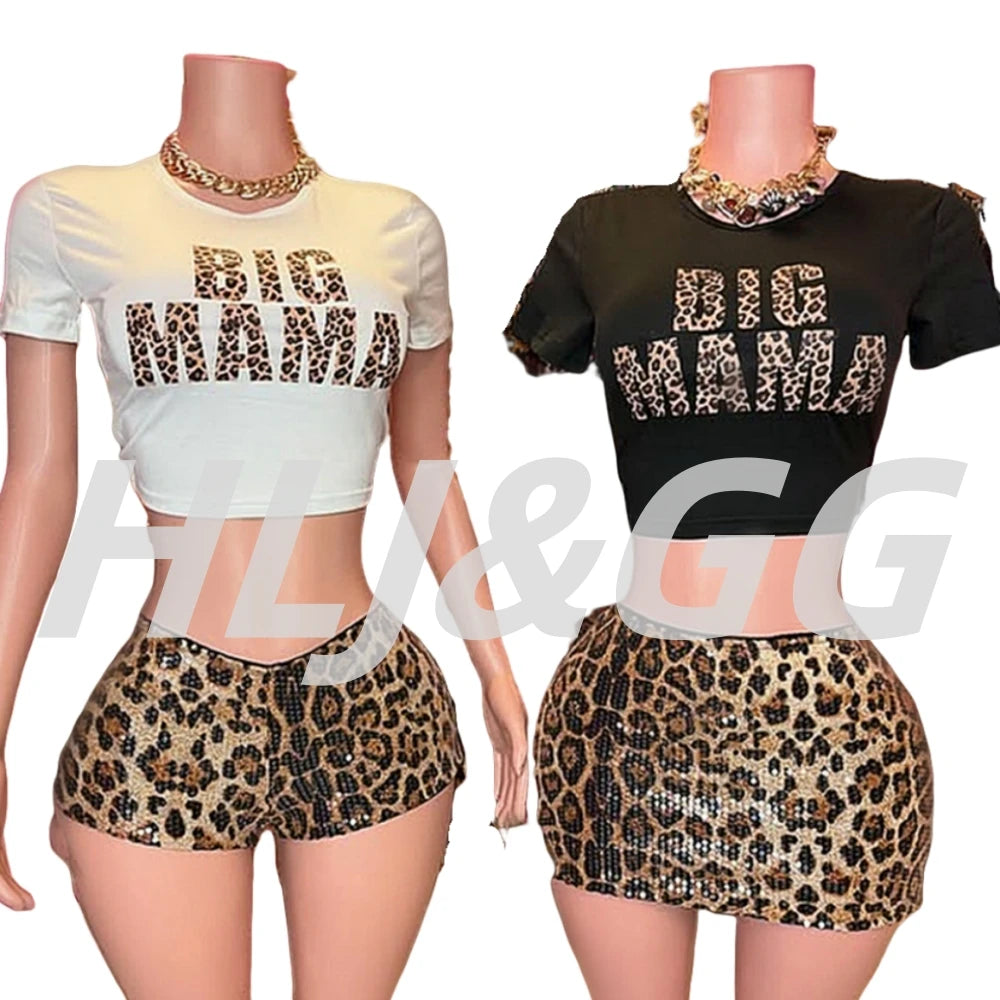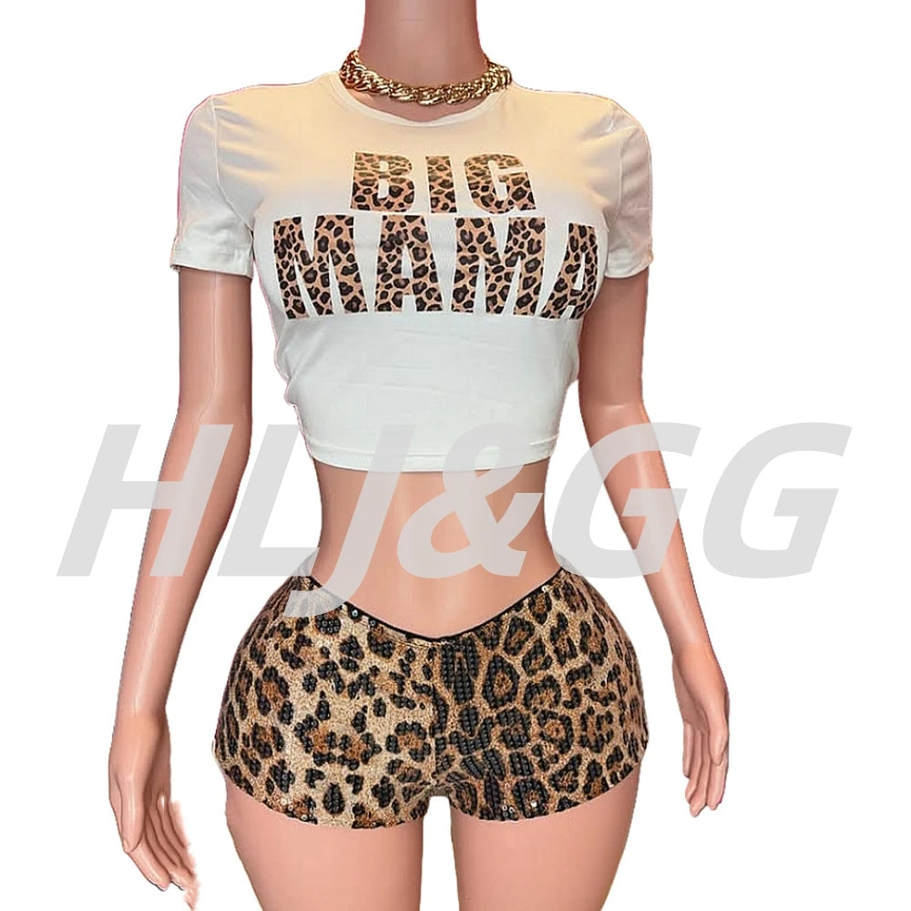 HLJ&GG Fashion Y2K Sequin Leopard Shorts Two Piece Sets Women Round Neck Short Sleeve Slim Crop Top And Shorts Outfit Streetwear