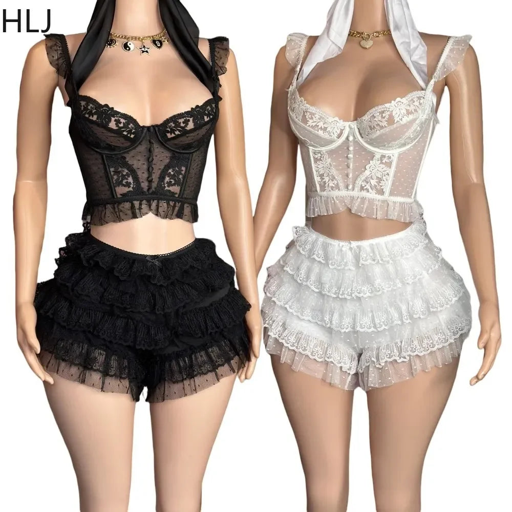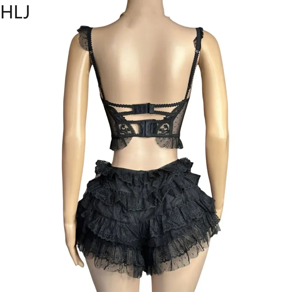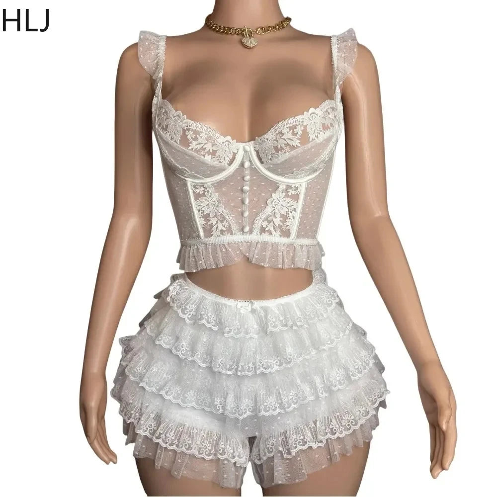 HLJ&GG Lace Sexy Embroidery Sheer Two Piece Sets For Women Thin Strap Tank Top + Ruffle Mini Skirts Shorts Outfit Party Clubwear