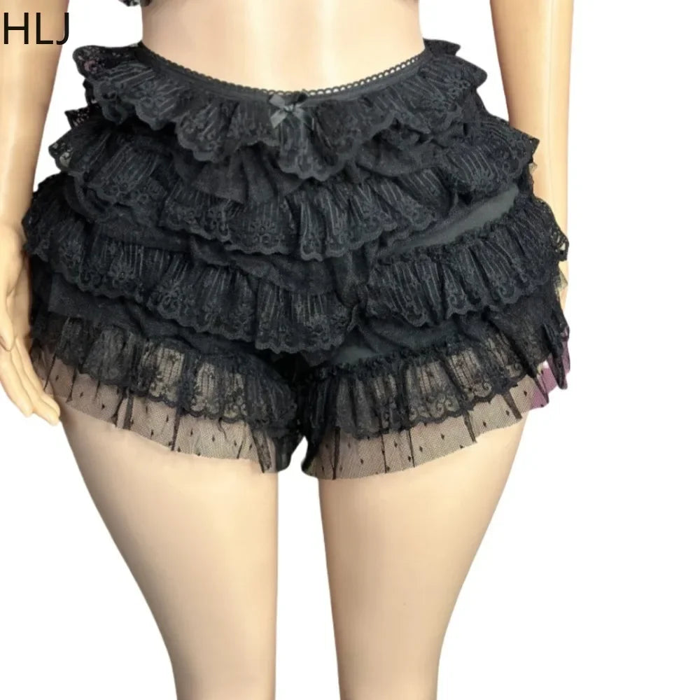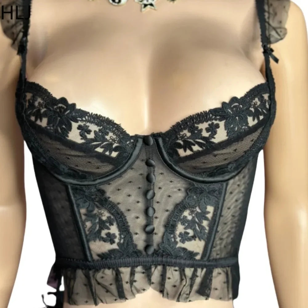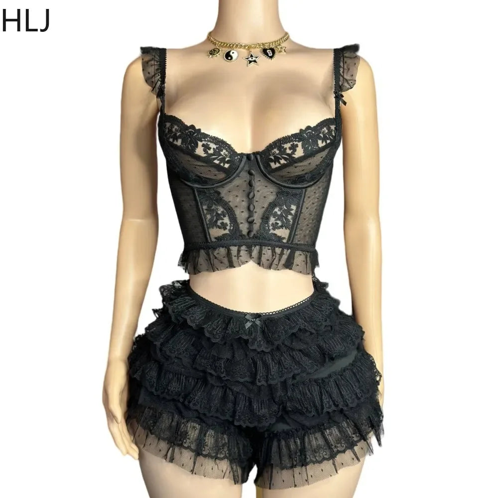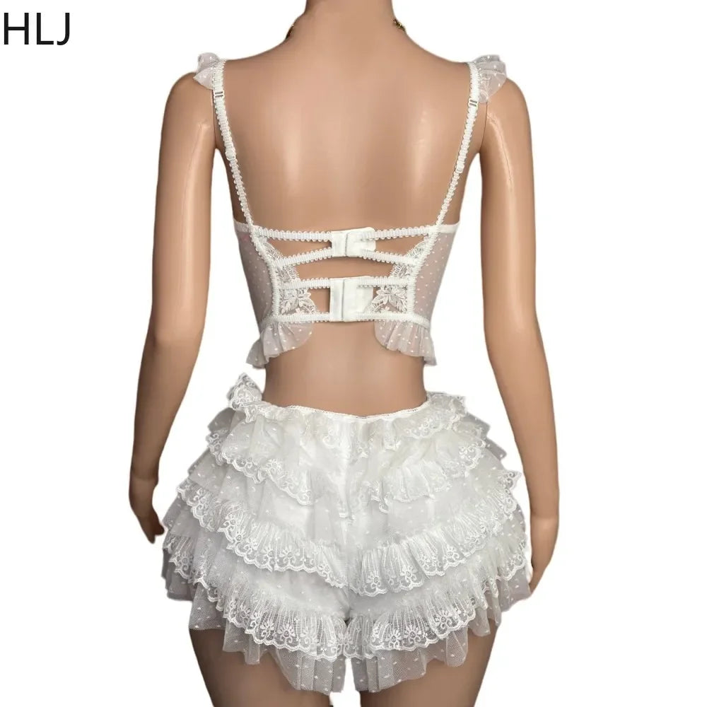 HLJ&GG Lace Sexy Embroidery Sheer Two Piece Sets For Women Thin Strap Tank Top + Ruffle Mini Skirts Shorts Outfit Party Clubwear
