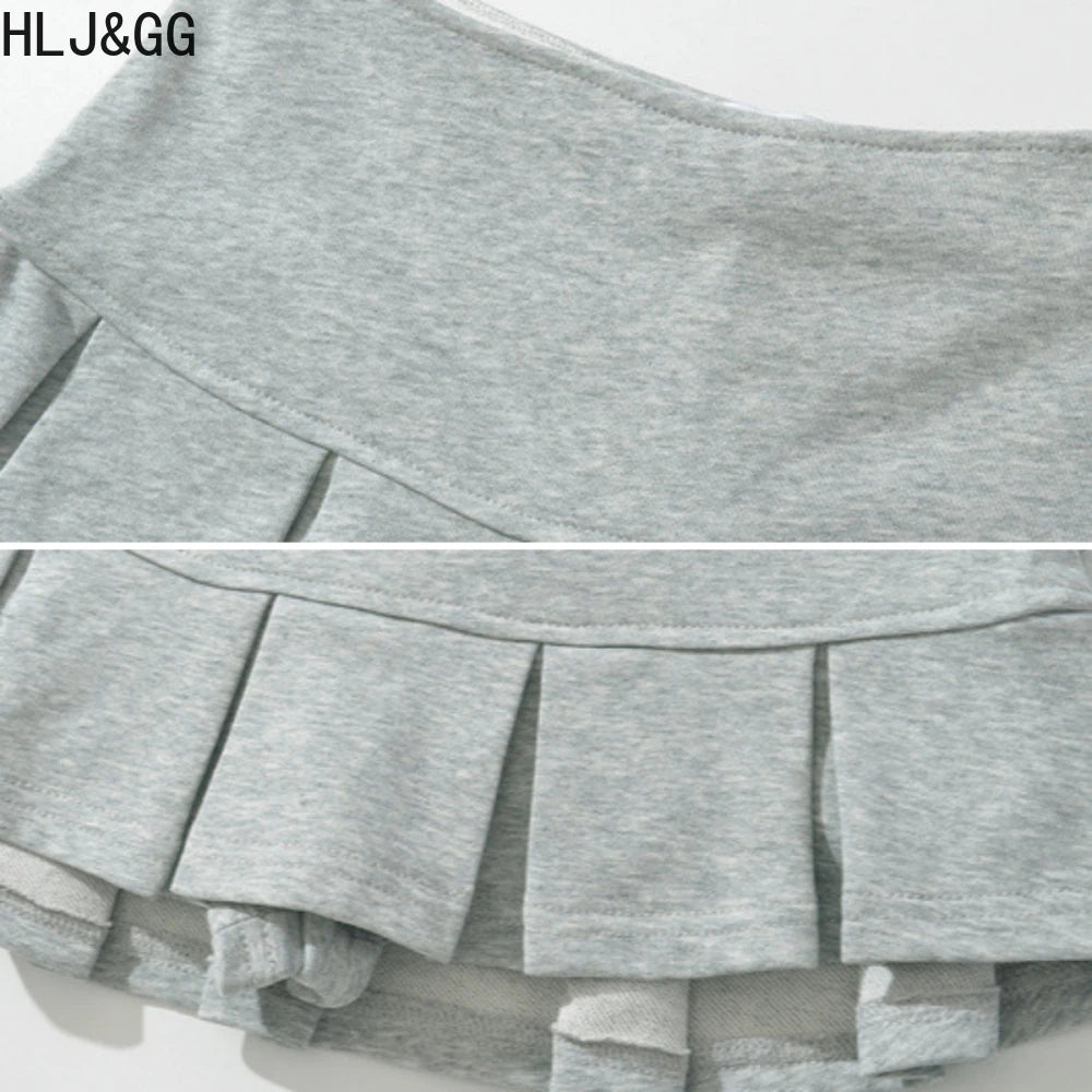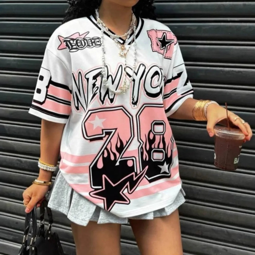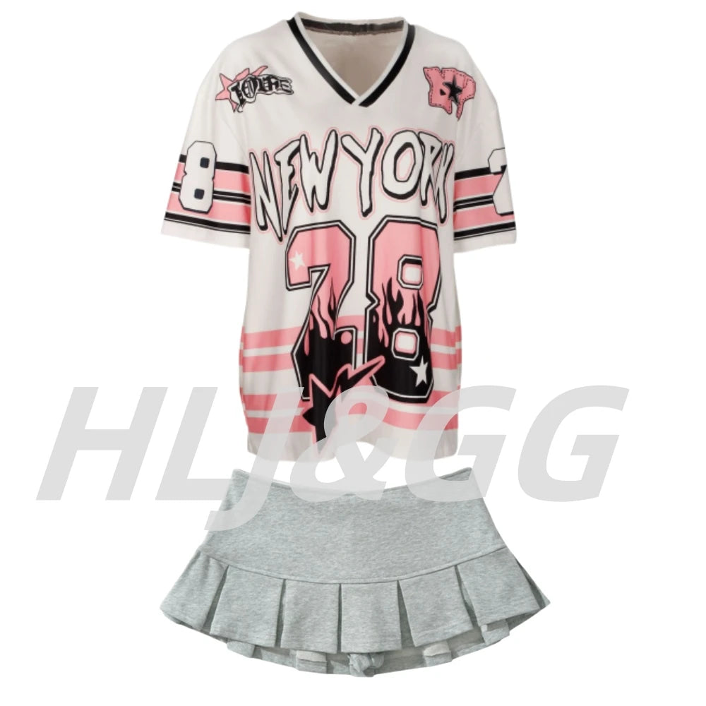 HLJ&GG Pink Fashion Letter Loose Tshirts Two Piece Sets Women V Neck Short Sleeve Top+Pleated Mini Skirts Outfits Y2K Streetwear