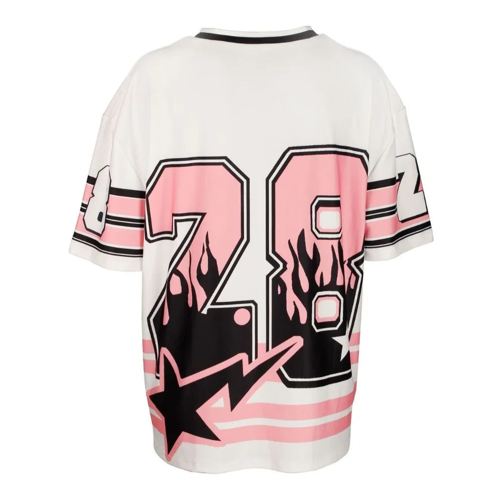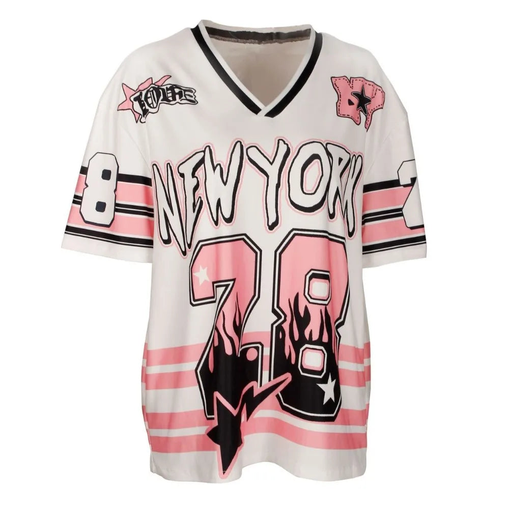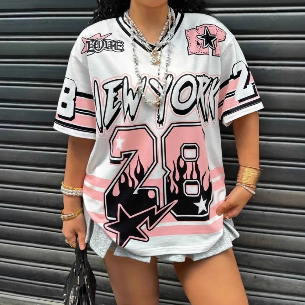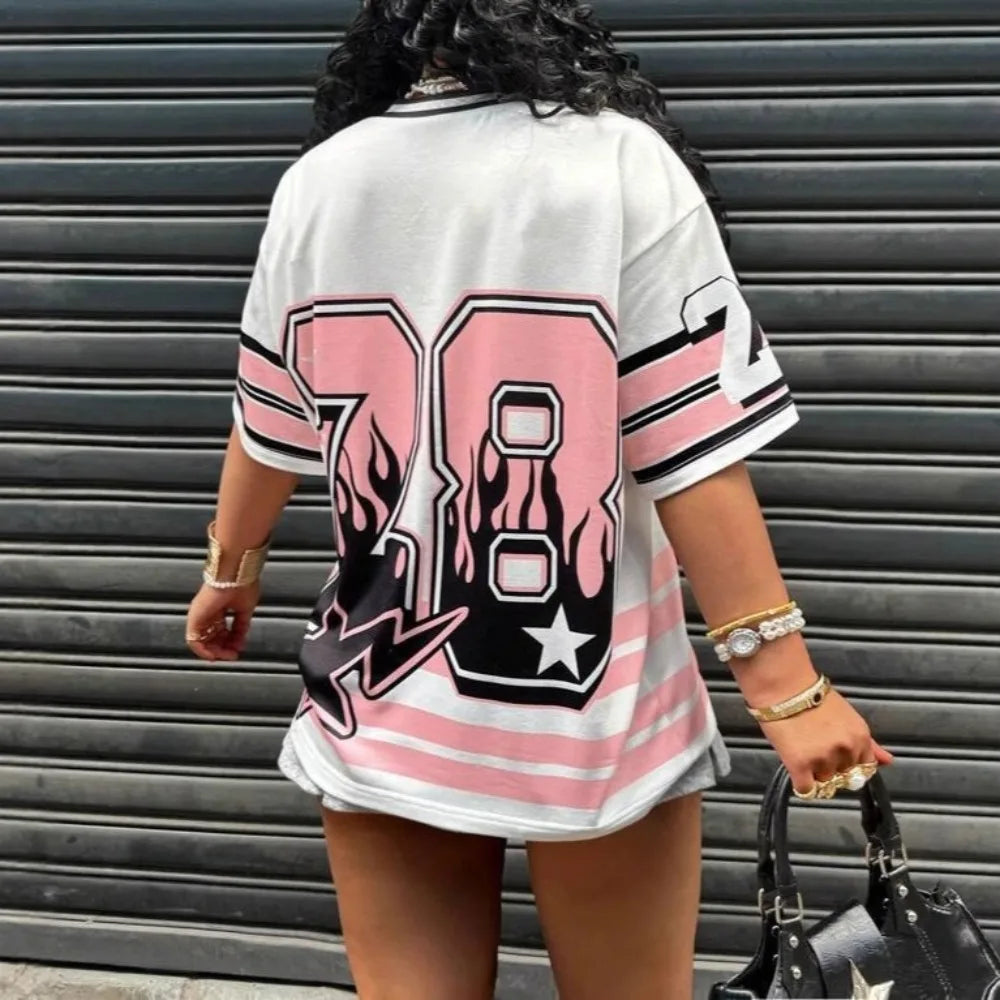 HLJ&GG Pink Fashion Letter Loose Tshirts Two Piece Sets Women V Neck Short Sleeve Top+Pleated Mini Skirts Outfits Y2K Streetwear