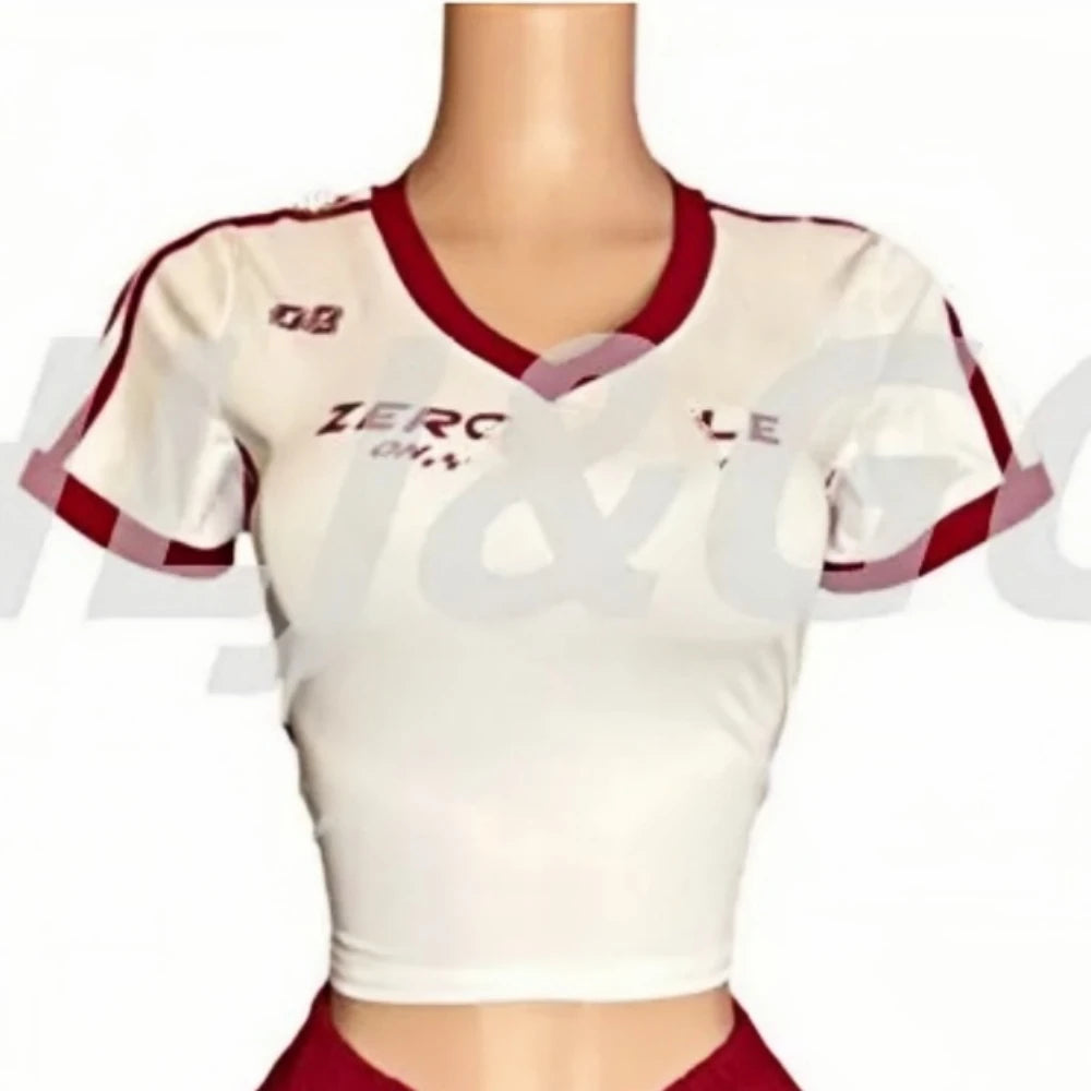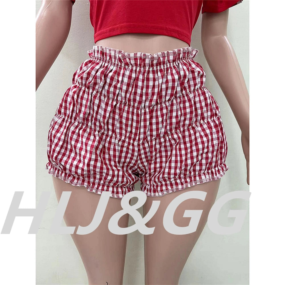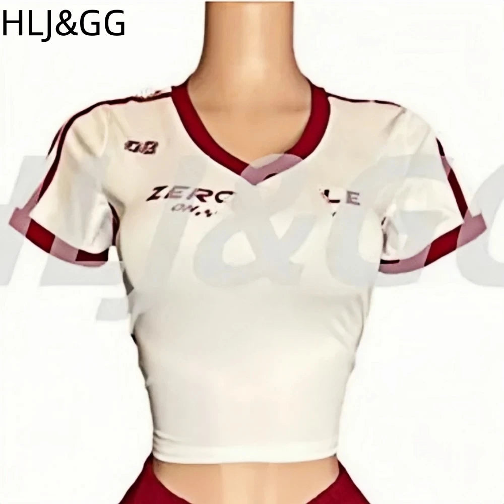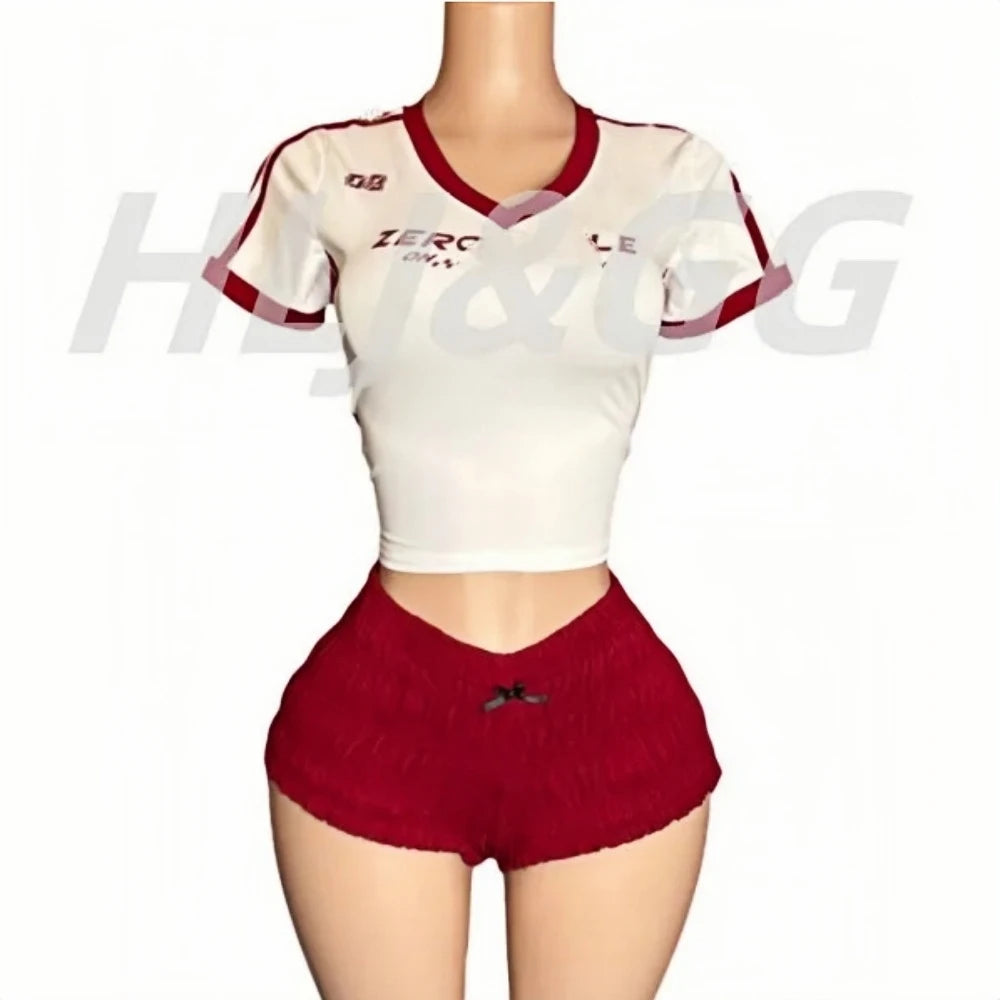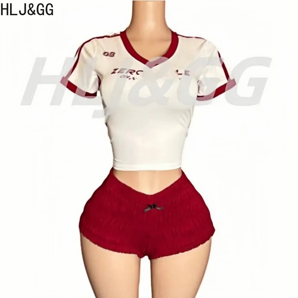 HLJ&GG Red American Vintage Letter Streetwear Women V Neck Short Sleeve Slim Crop Top And Ruched Shorts Two Piece Sets Outfits