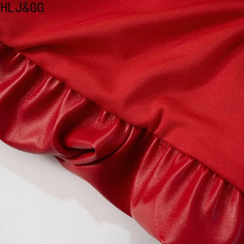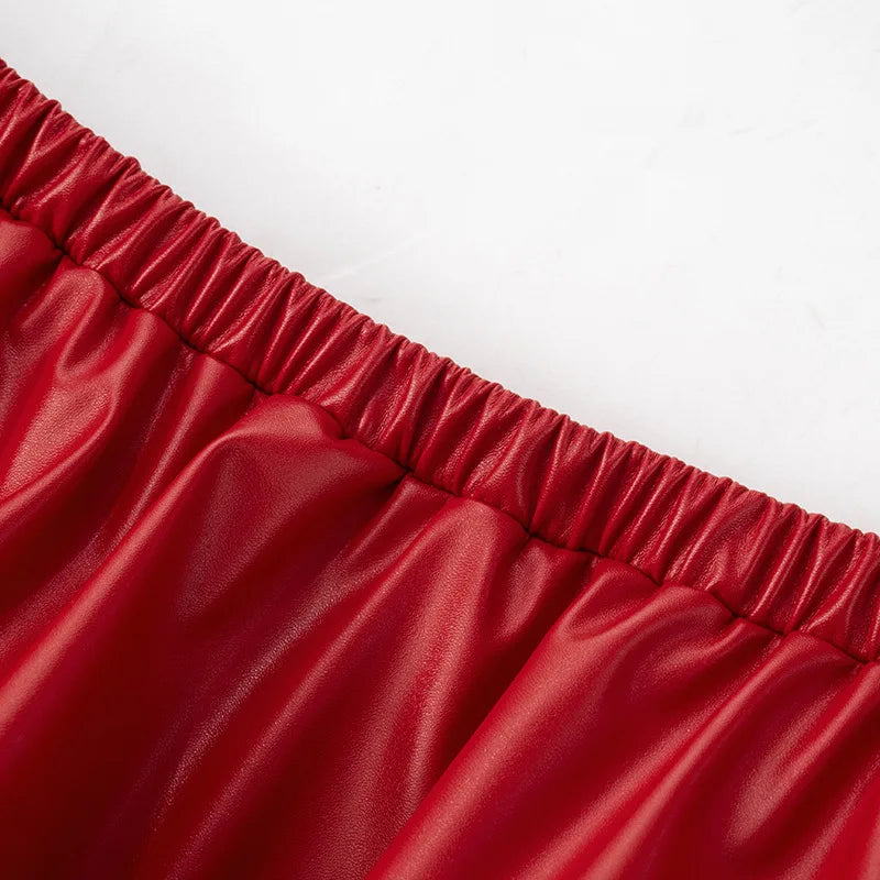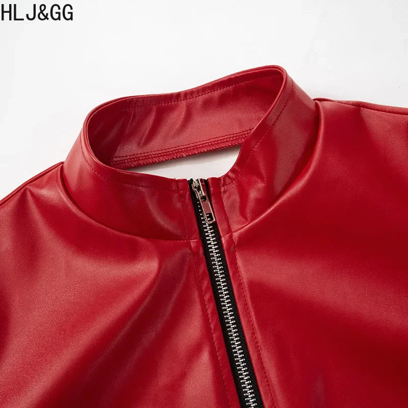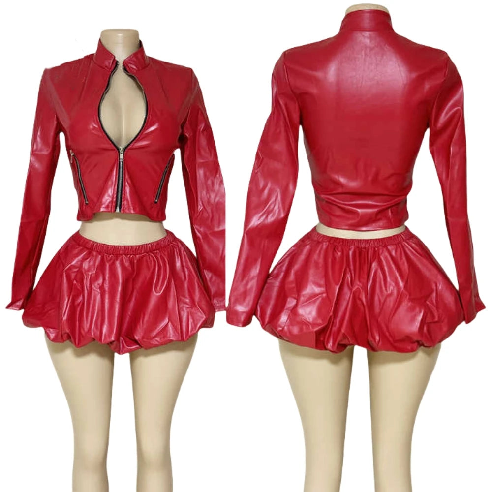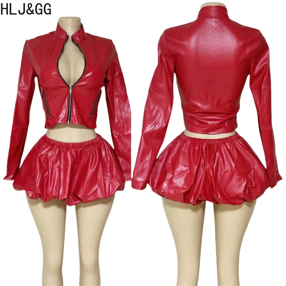 HLJ&GG Red Fashion Leather Puffy Mini Skirts Two Piece Sets Women Zip Long Sleeve Jacket And Skirts Outfit Y2K Female Streetwear