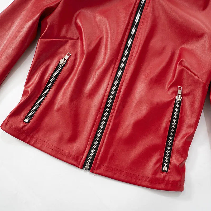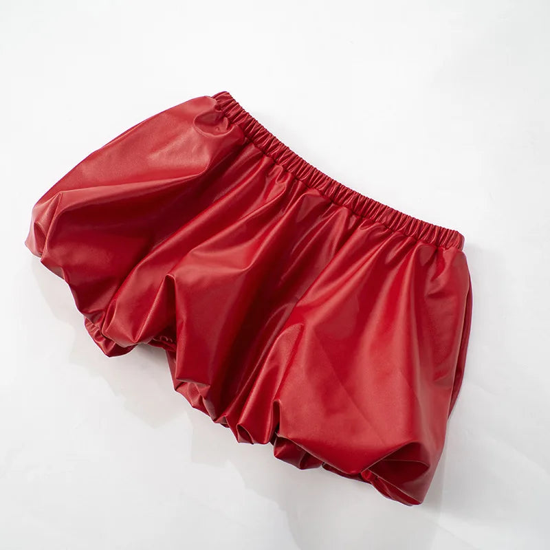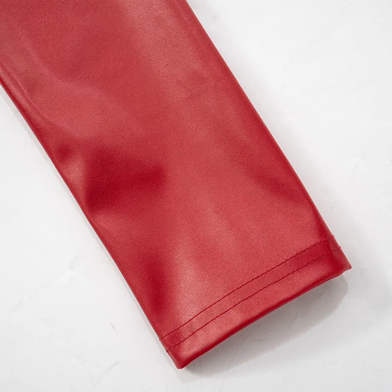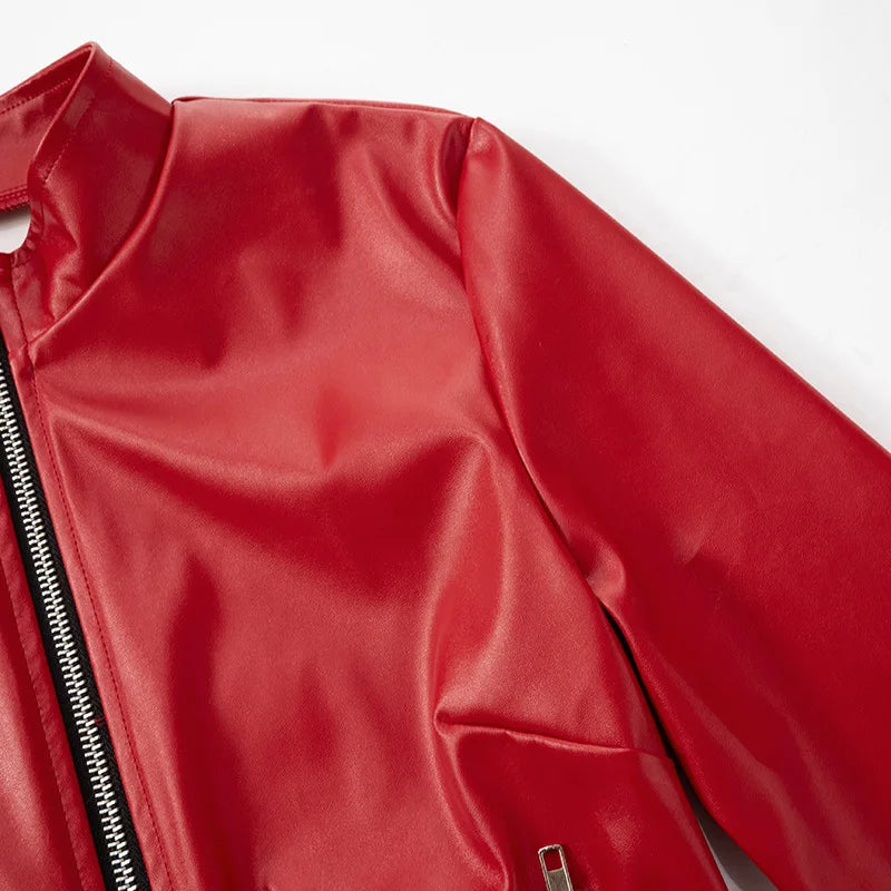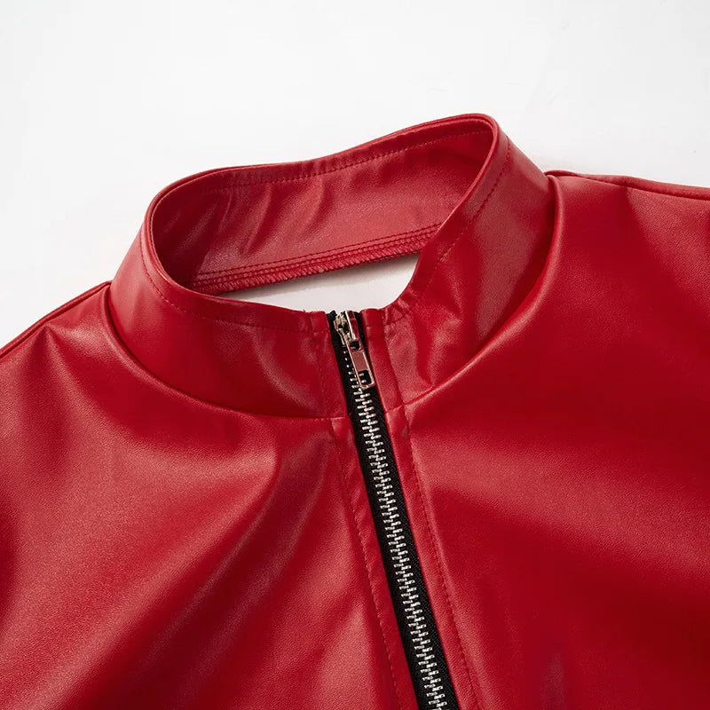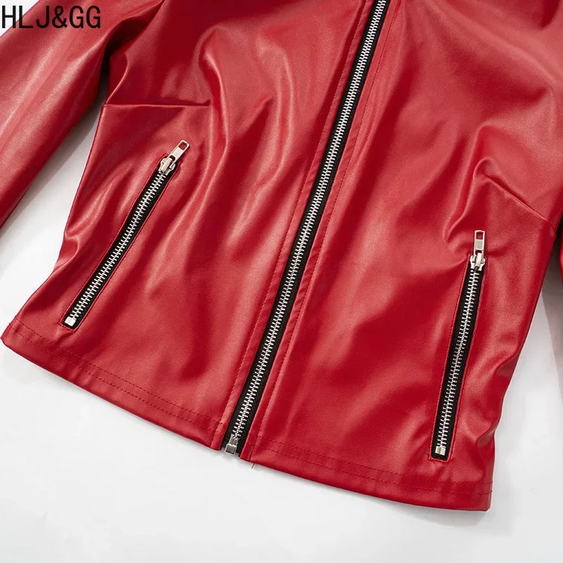 HLJ&GG Red Fashion Leather Puffy Mini Skirts Two Piece Sets Women Zip Long Sleeve Jacket And Skirts Outfit Y2K Female Streetwear