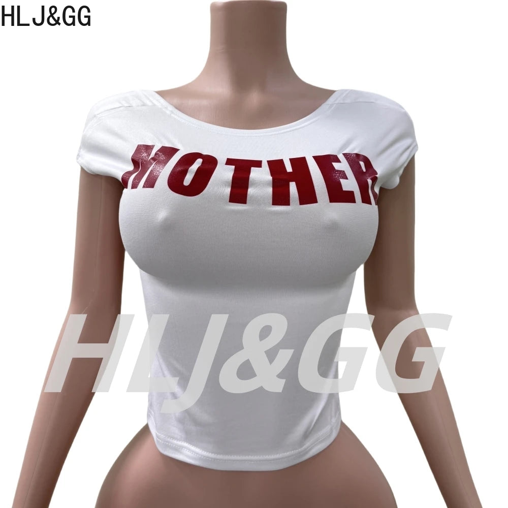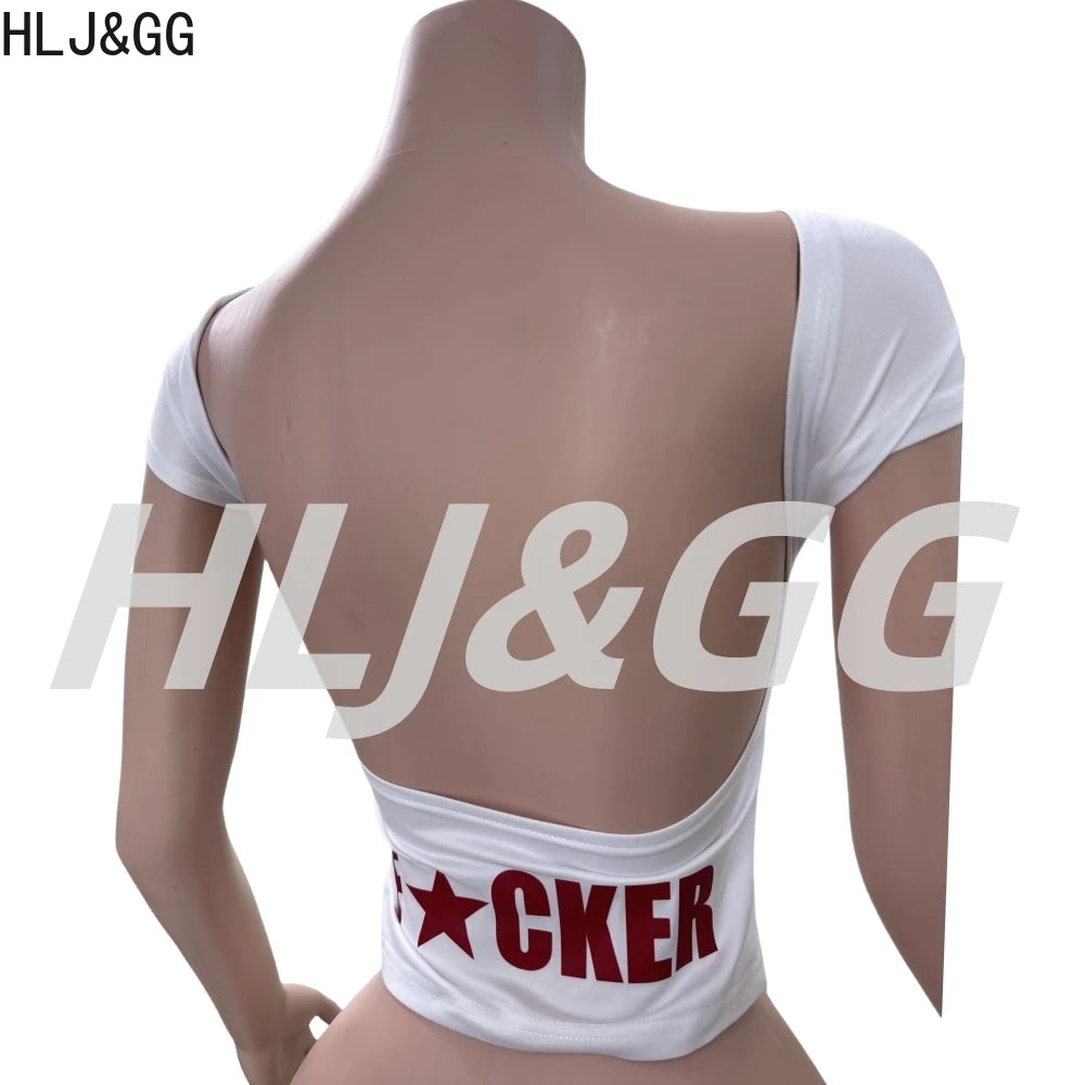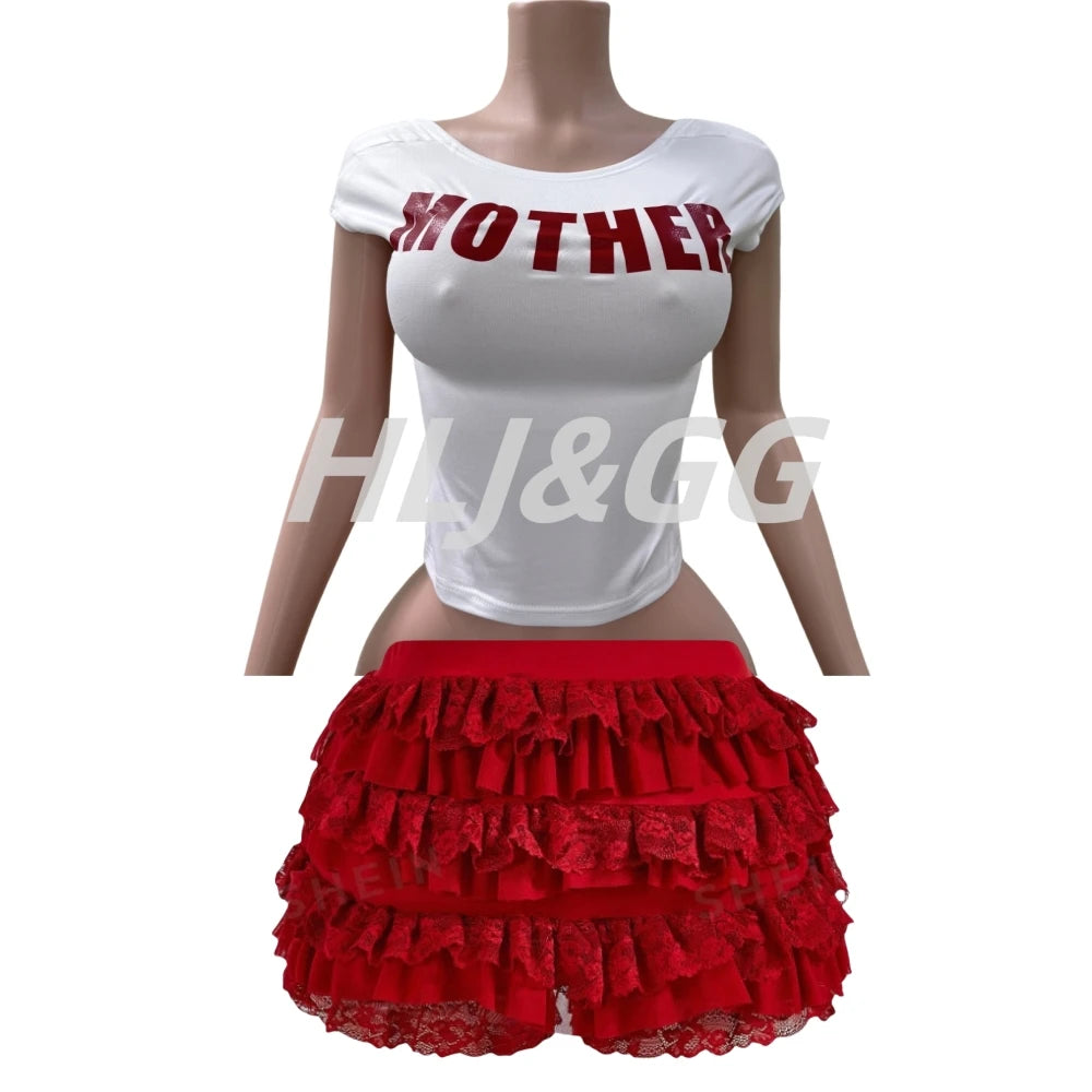 HLJ&GG Red Fashion Letter Backless Tshirts Two Piece Sets Women O Neck Short Sleeve Slim Crop Top And Lace Skirts Shorts Outfits