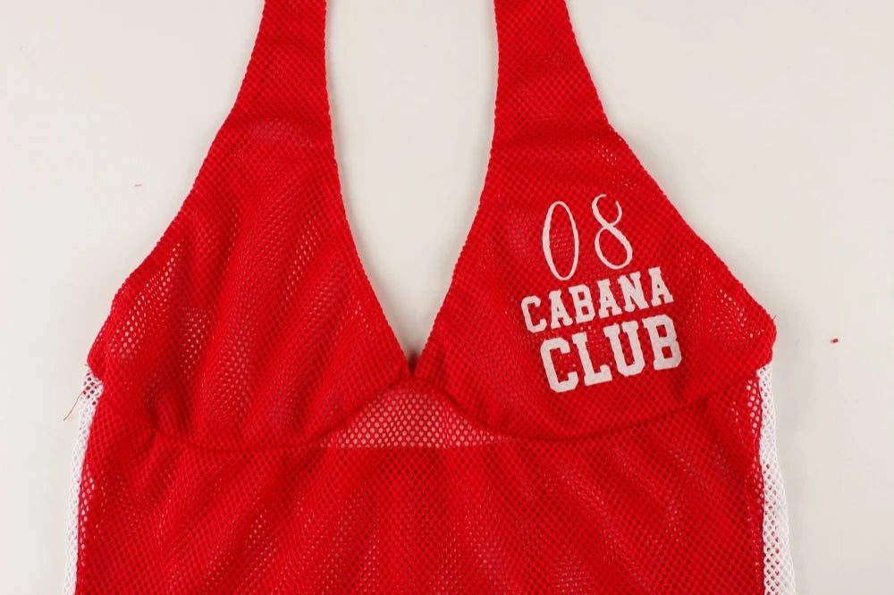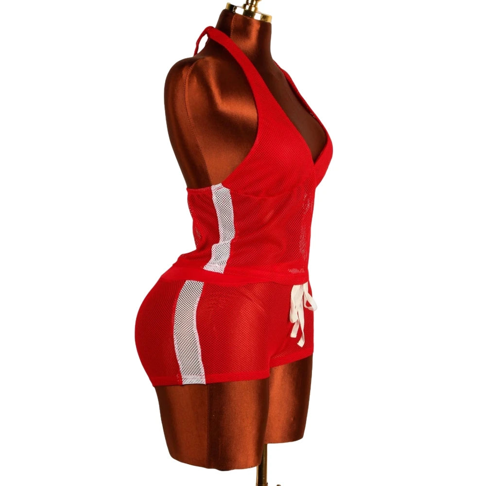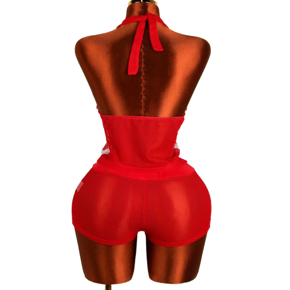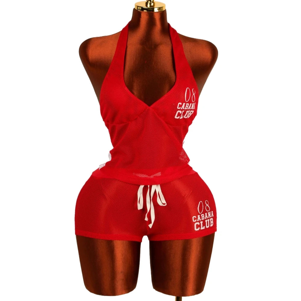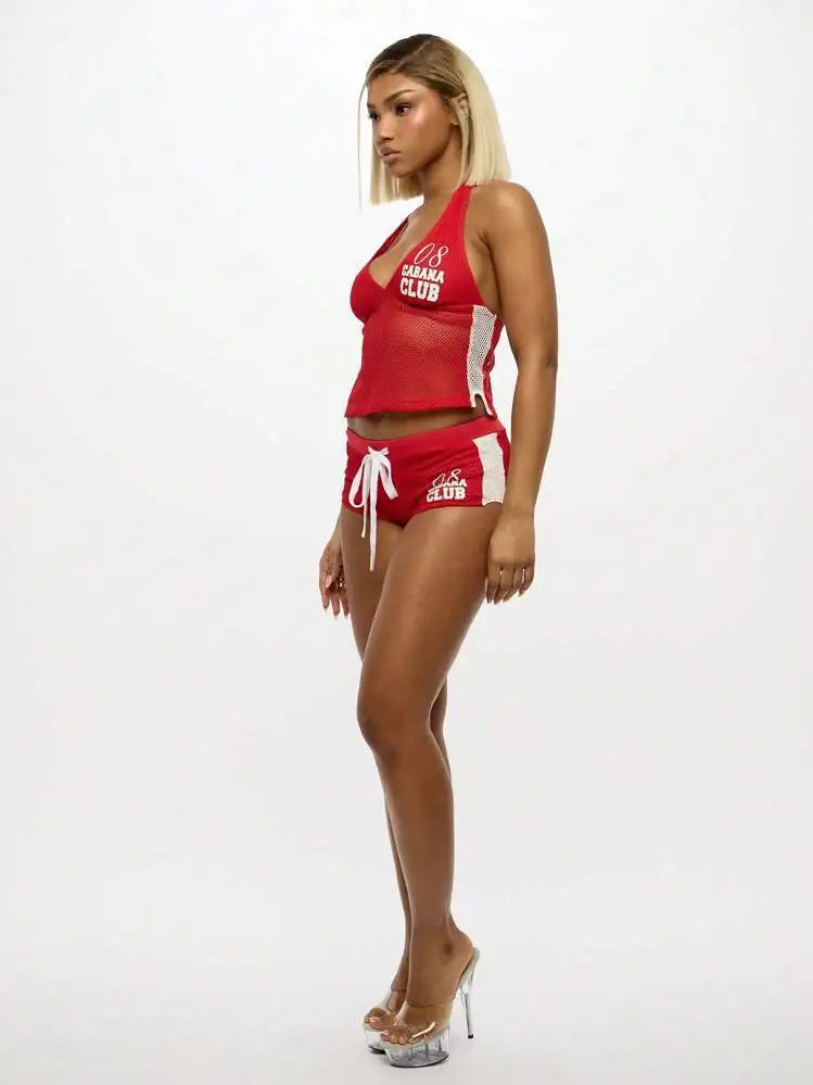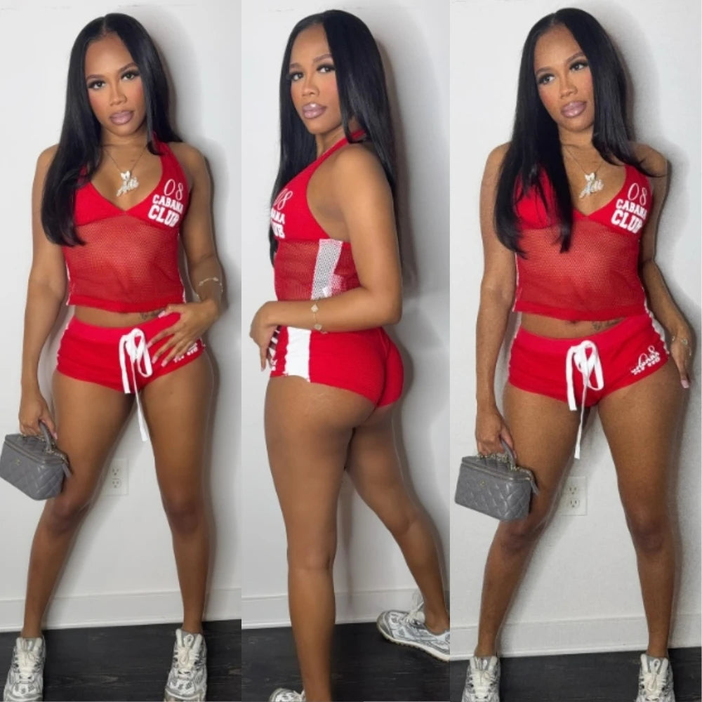HLJ&GG Red Fashion Mesh Letter Print Two Piece Sets Women Halter Slim Crop Top+Drawstring Shorts Outfits Y2K Summer Streetwear