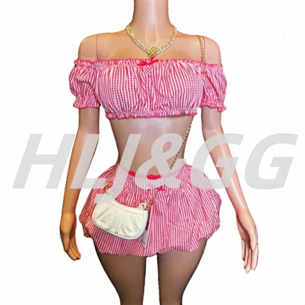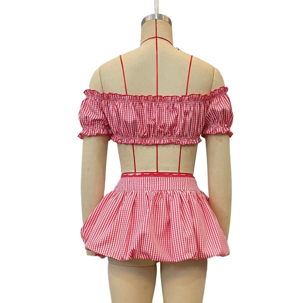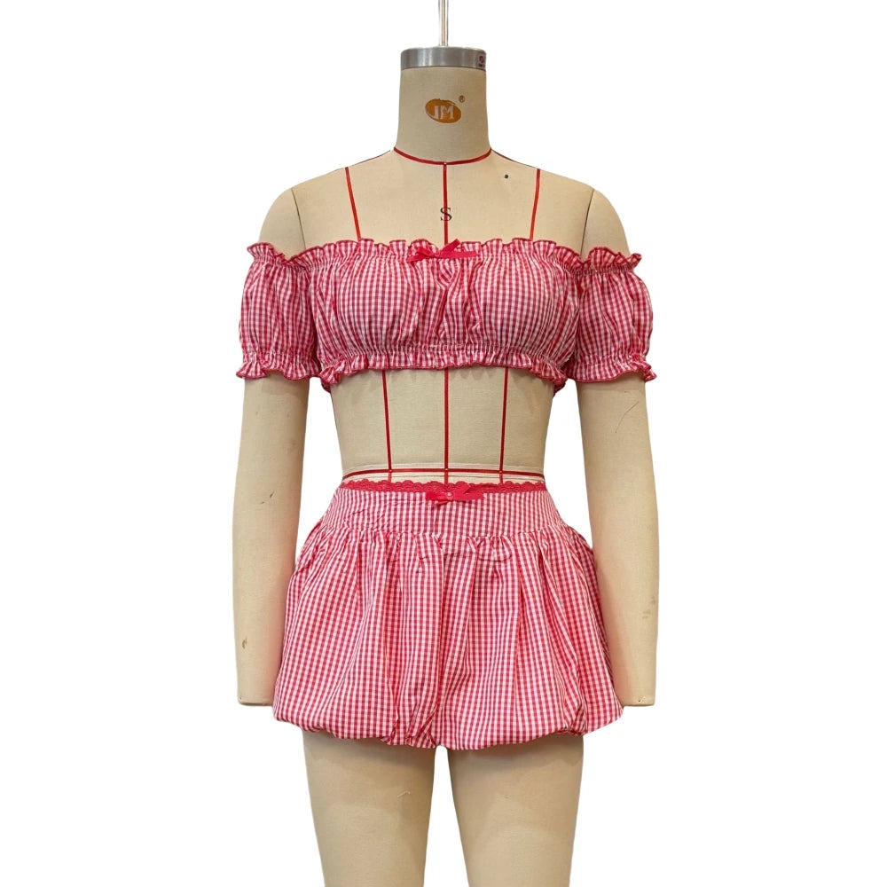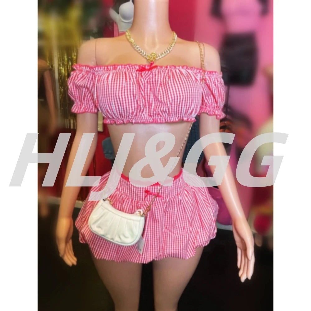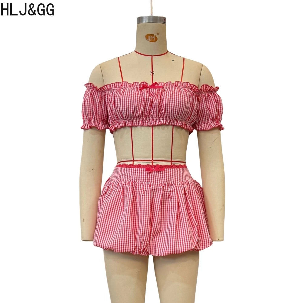 HLJ&GG Red Fashion Plaid Print Bow Two Piece Sets Women Off Shoulder Short Sleeve Crop Top+Mini Skirts Outfits Sweet Streetwear