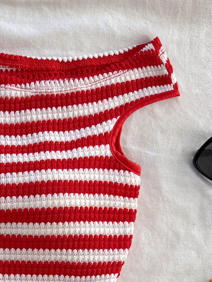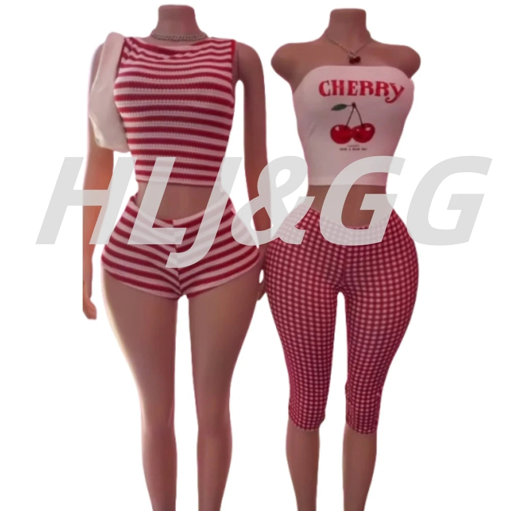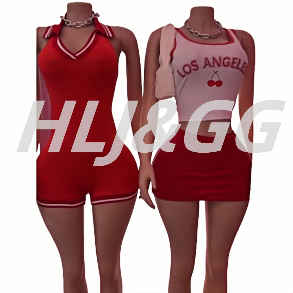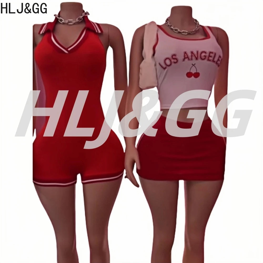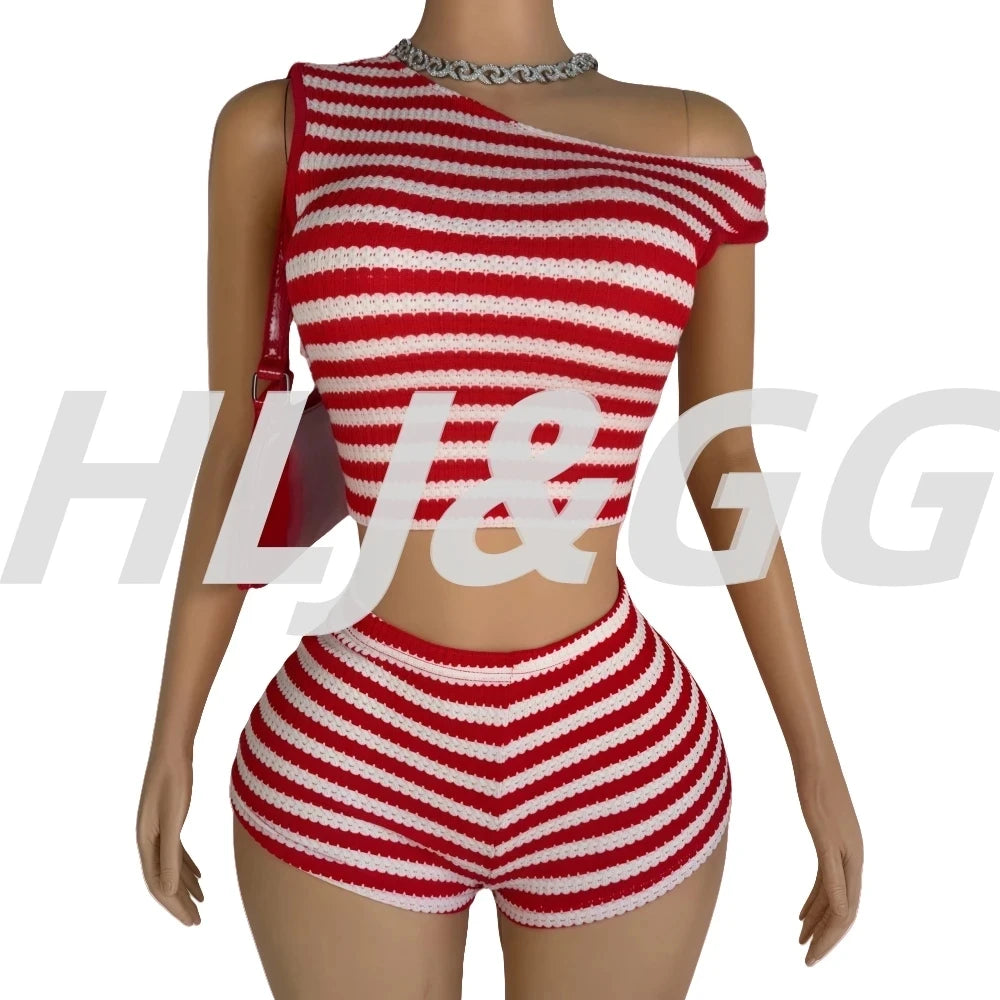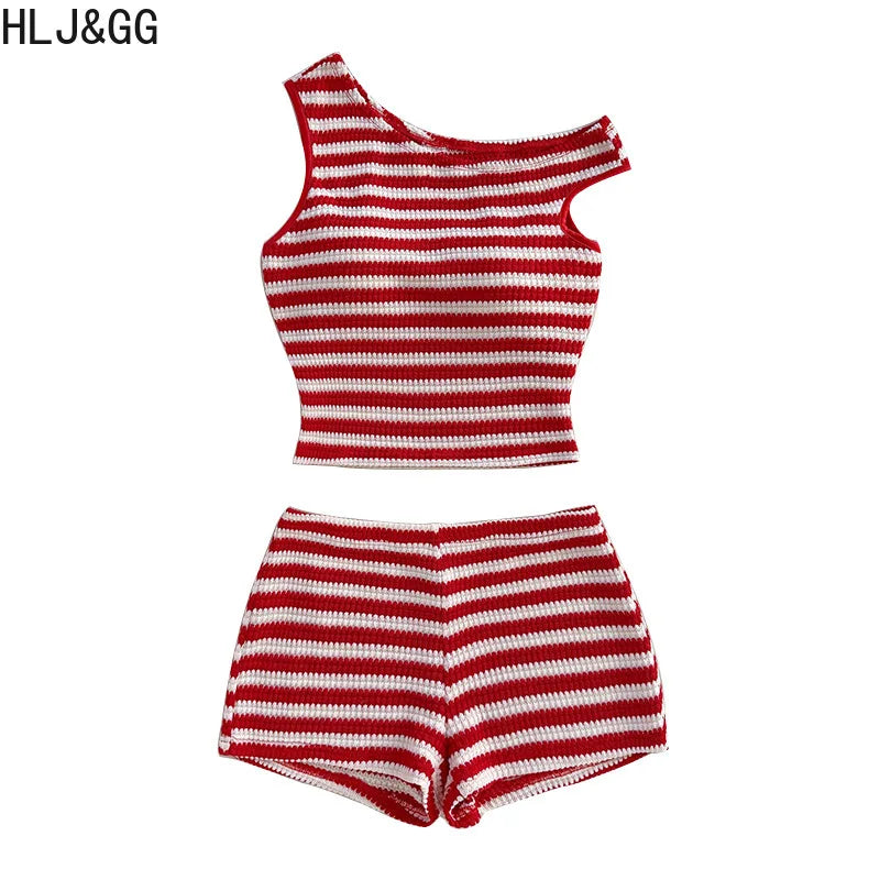 HLJ&GG Red Stripe Knitting Y2K Fashion Streetwear Women O Neck Sleeveless Slim Crop Top And Shorts Two Piece Sets Outfits 2025
