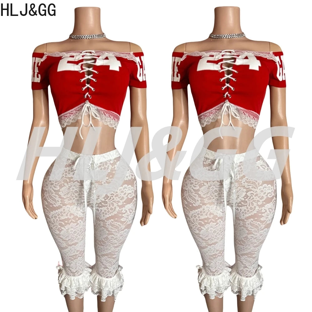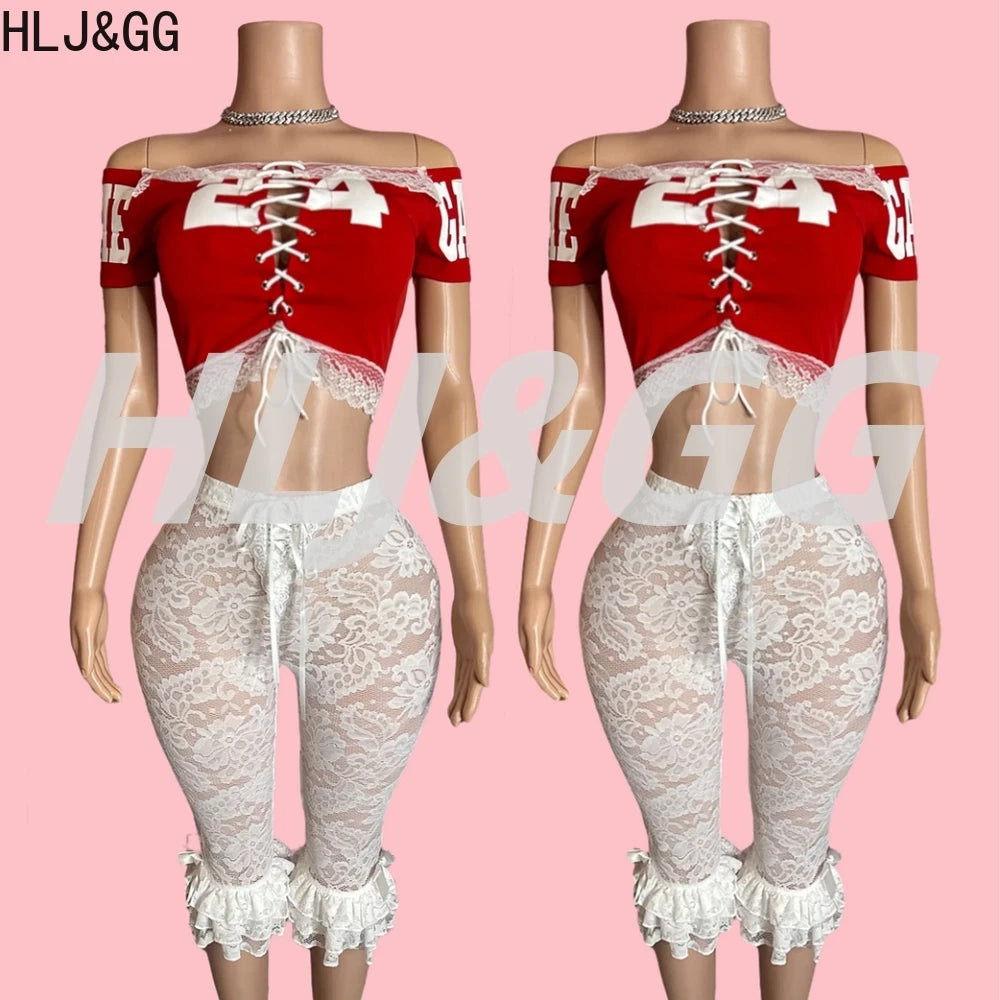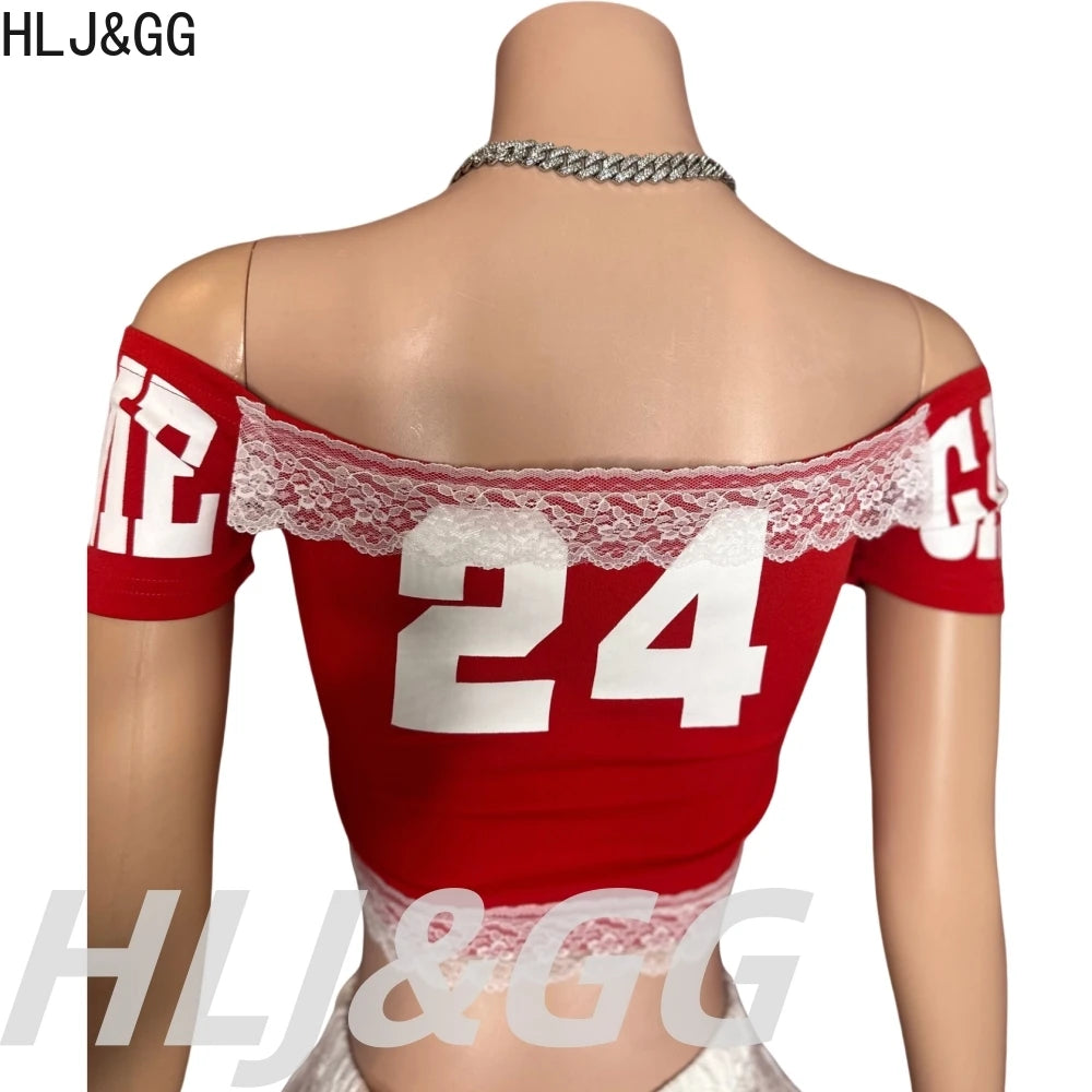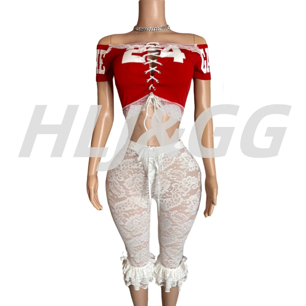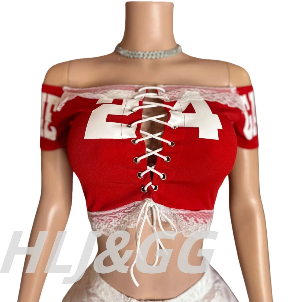 HLJ&GG Red Y2K Letter Lace Splicing Bandage Two Piece Sets Women Off Shoulder Hollow Crop Top And Skinny Ruffle Shorts Outfits