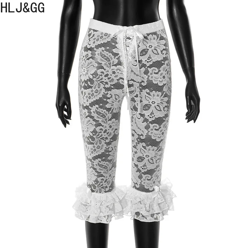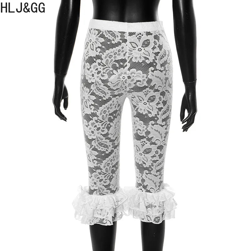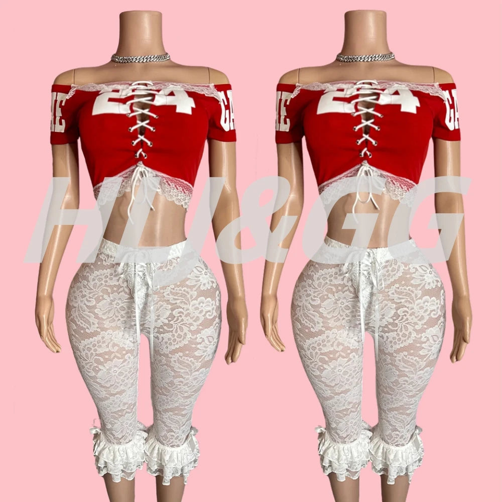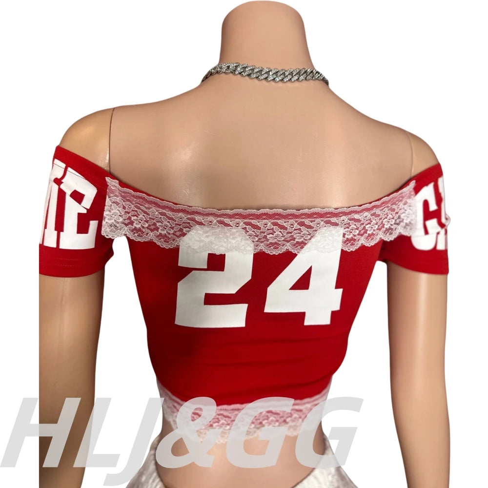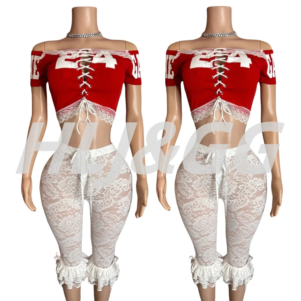 HLJ&GG Red Y2K Letter Lace Splicing Bandage Two Piece Sets Women Off Shoulder Hollow Crop Top And Skinny Ruffle Shorts Outfits