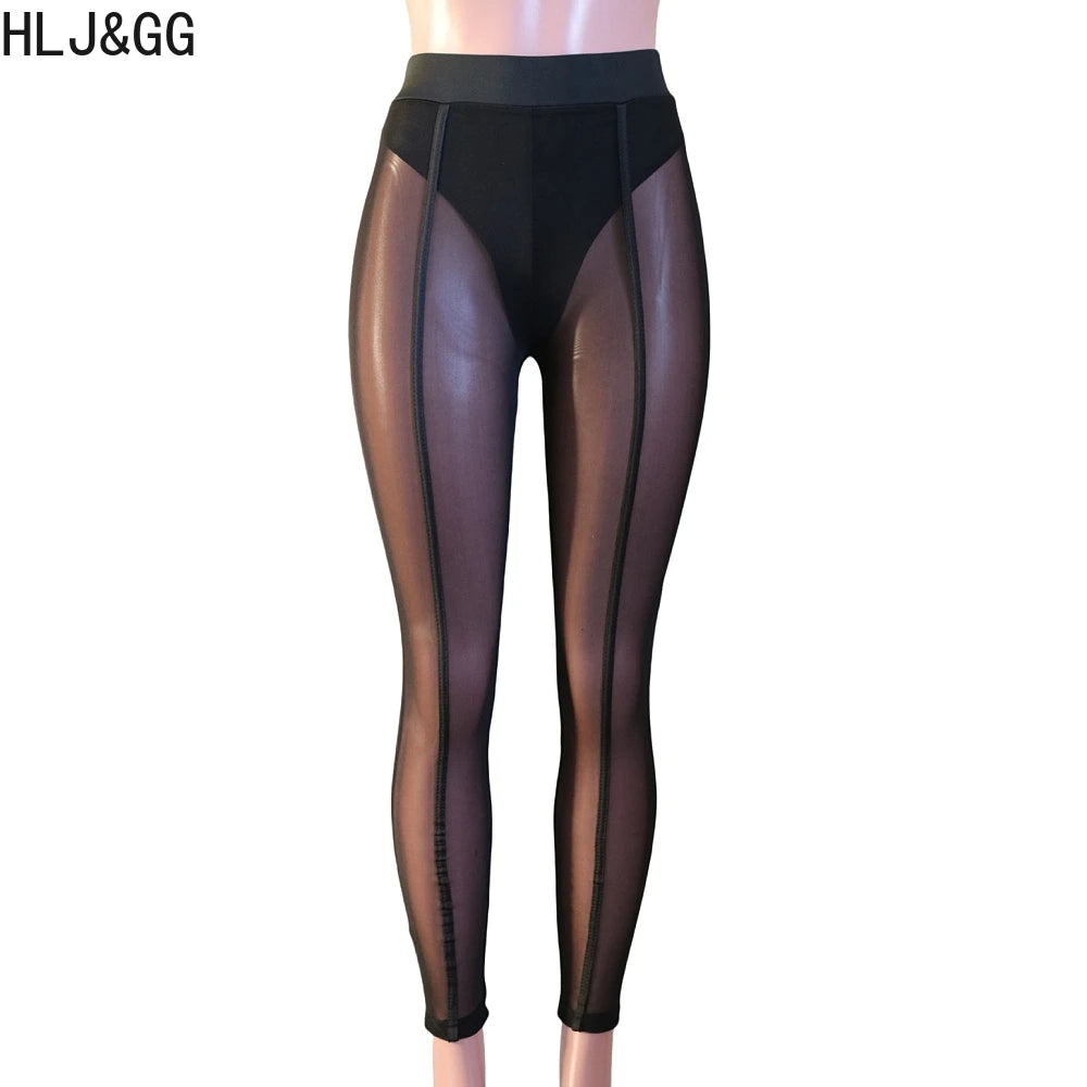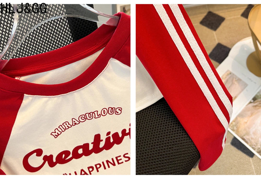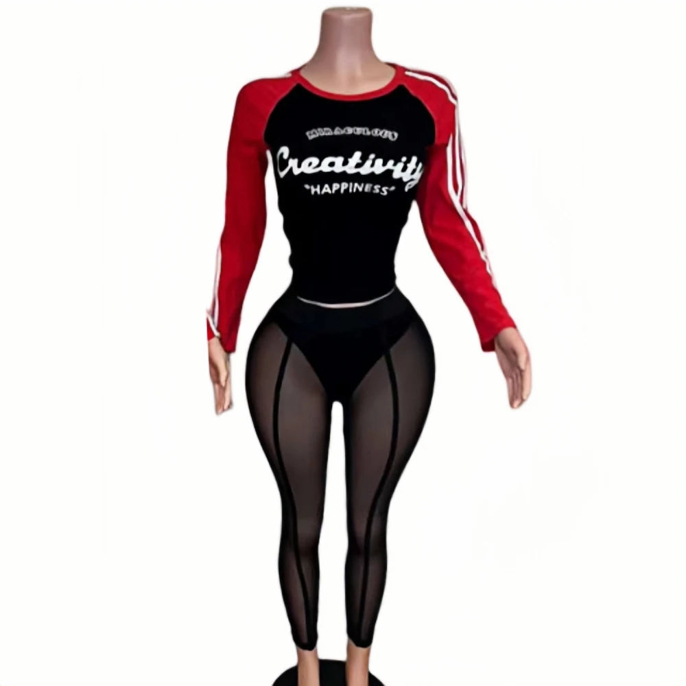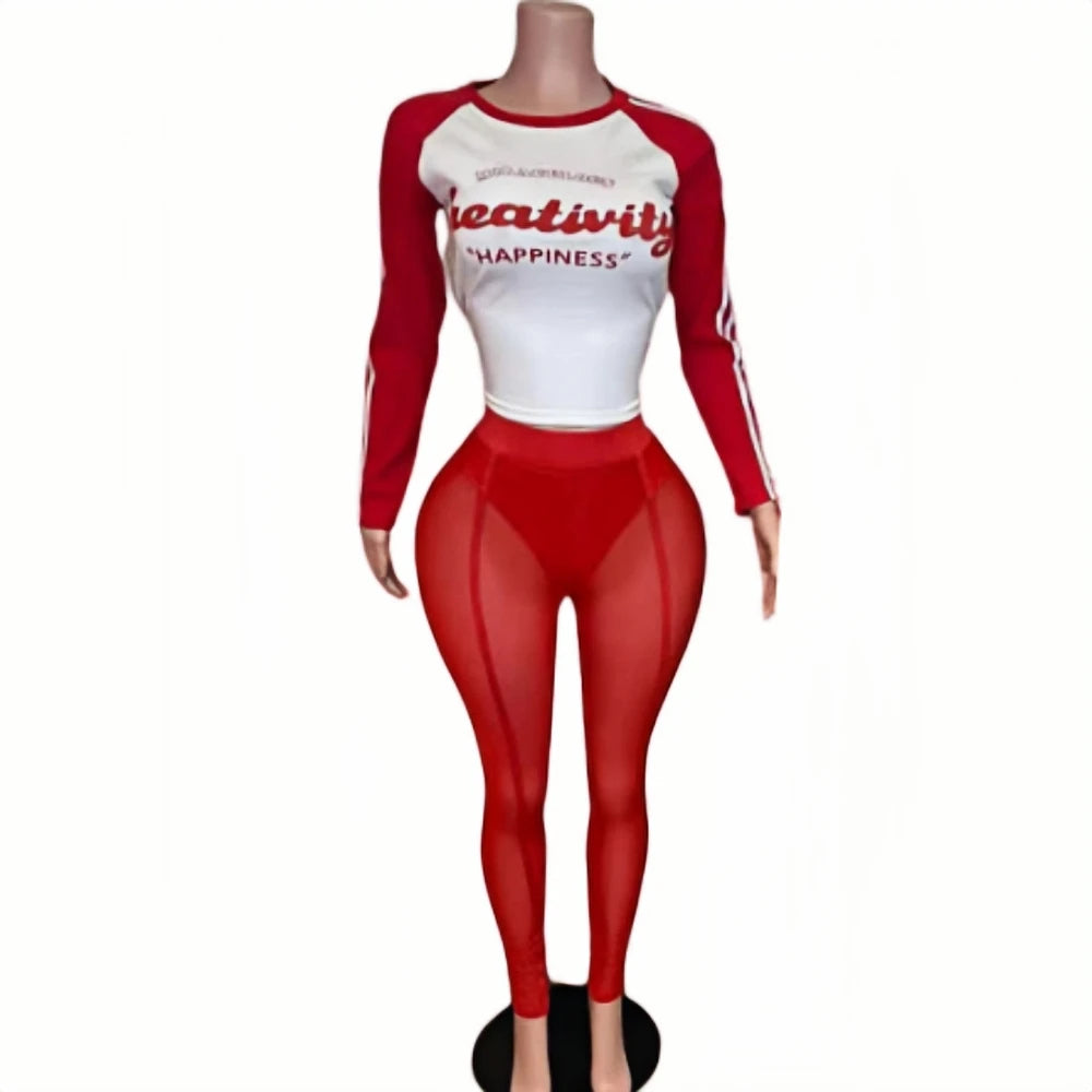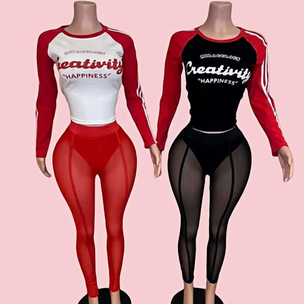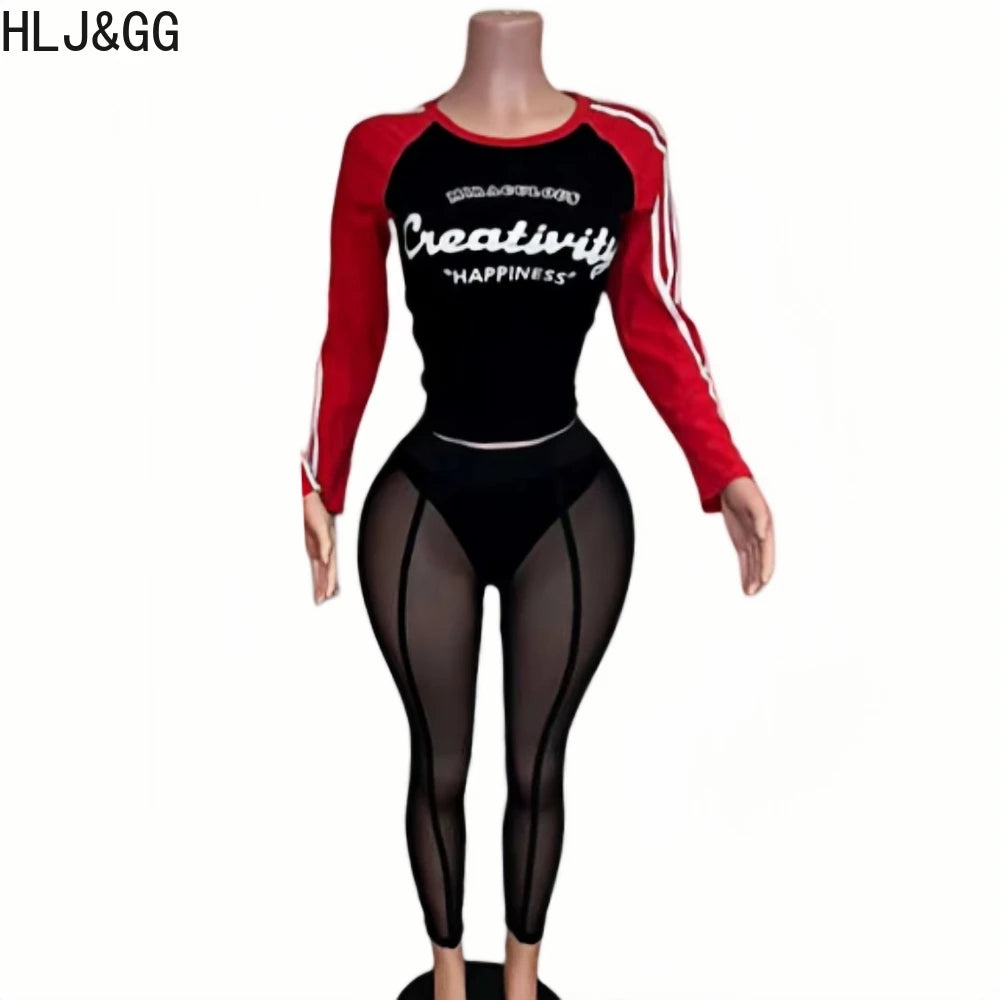 HLJ&GG Retro American Letter Printing Two Piece Sets Women Round Neck Long Sleeve Top And Mesh See Though Pants Outfits 2025 New